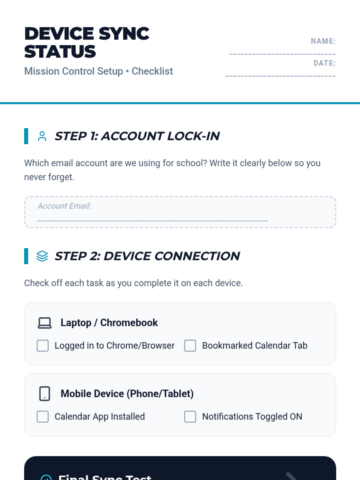This sequence focuses on the maintenance habits required to keep a digital calendar functional. It addresses the 'set it and forget it' pitfall by establishing daily check-in routines and cross-device syncing, moving from device setup to daily preview/review habits.