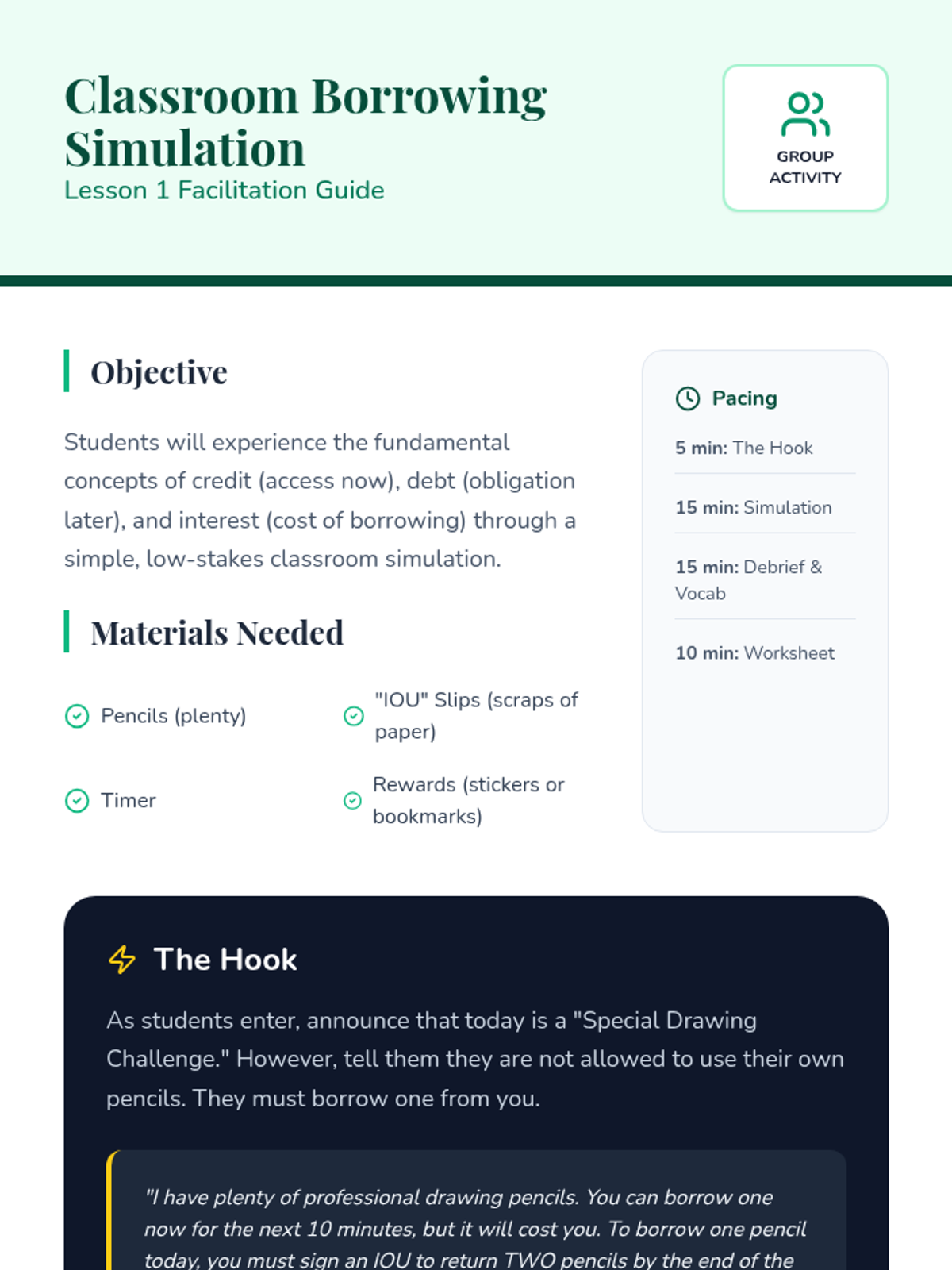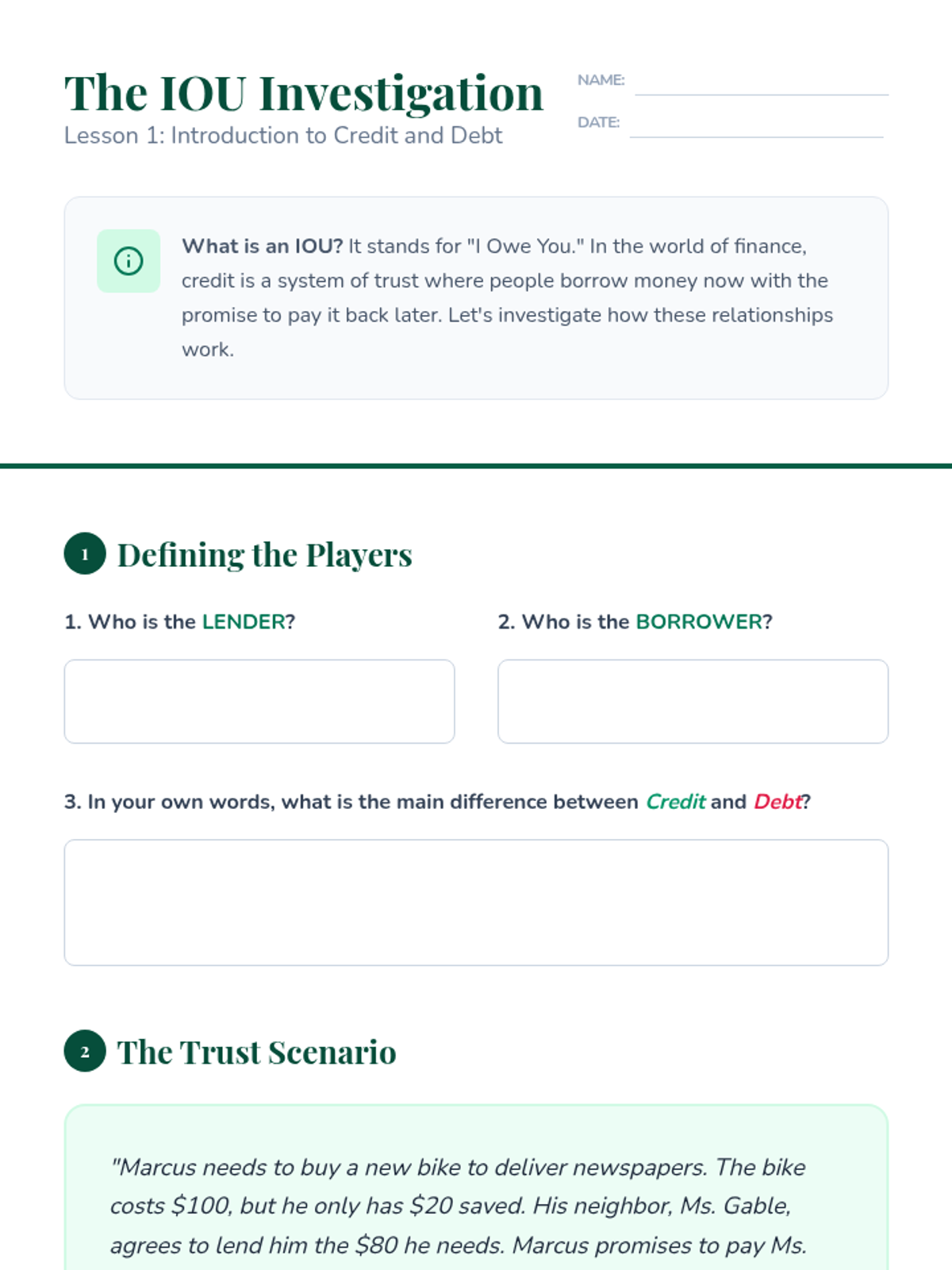This sequence explores the mechanics of credit, the actual cost of debt through interest, the importance of creditworthiness, and the basics of investment risk. Students culminate their learning by evaluating business loan proposals in a 'Shark Tank' style simulation.