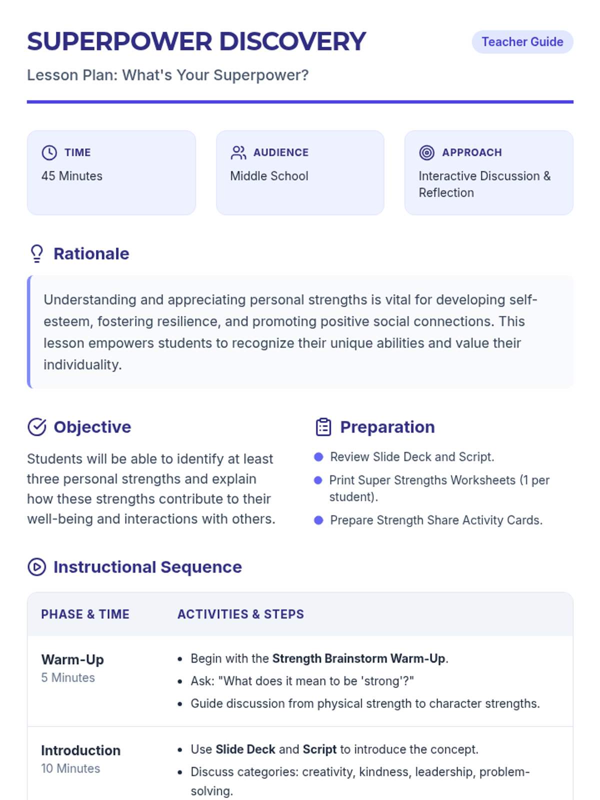 A comprehensive two-part sequence designed to help students navigate the transition from self-discovery in middle school to the practical responsibilities of young adulthood. Lesson 1 focuses on identifying personal strengths, while Lesson 2 provides a roadmap for post-secondary life.