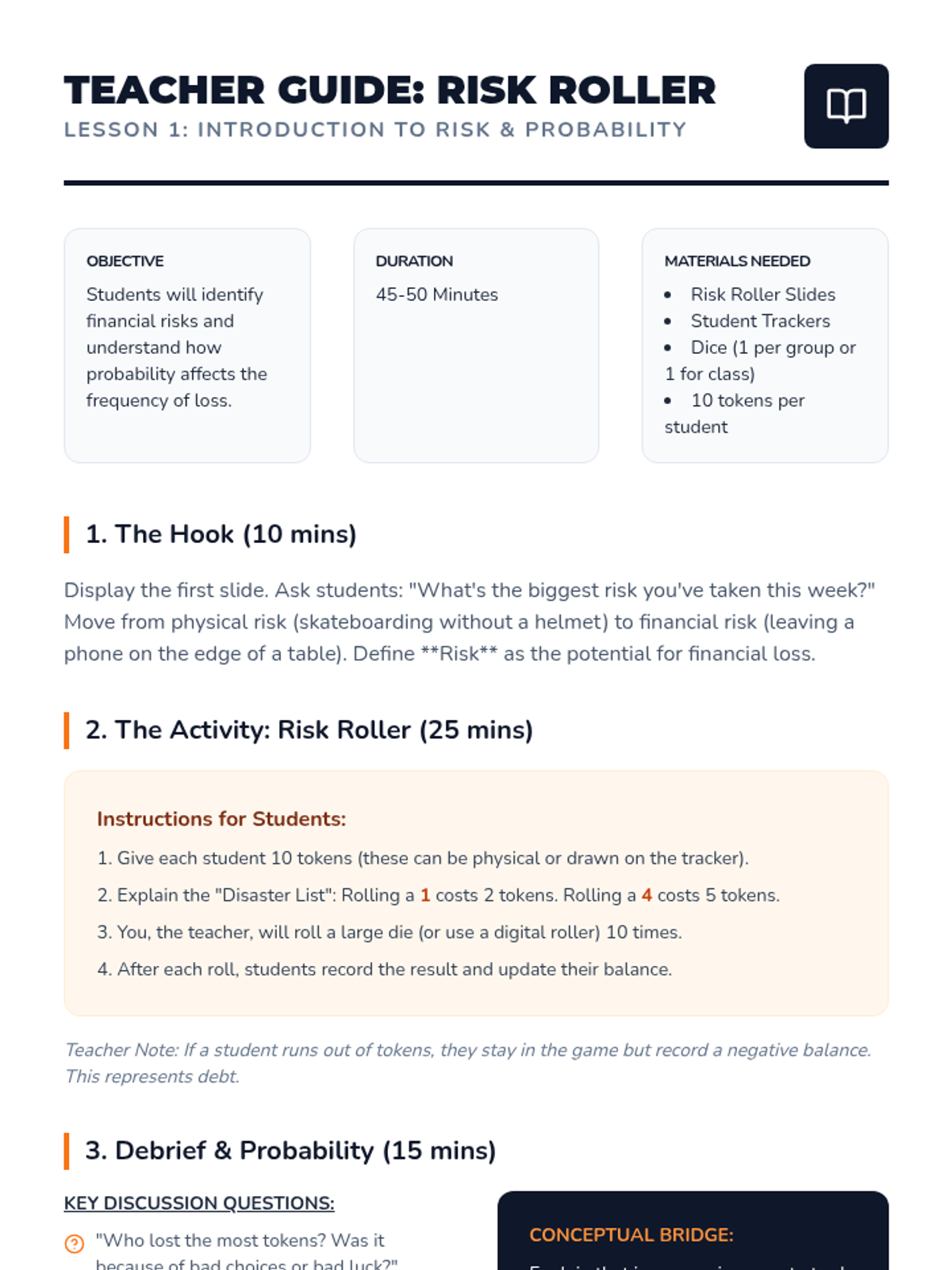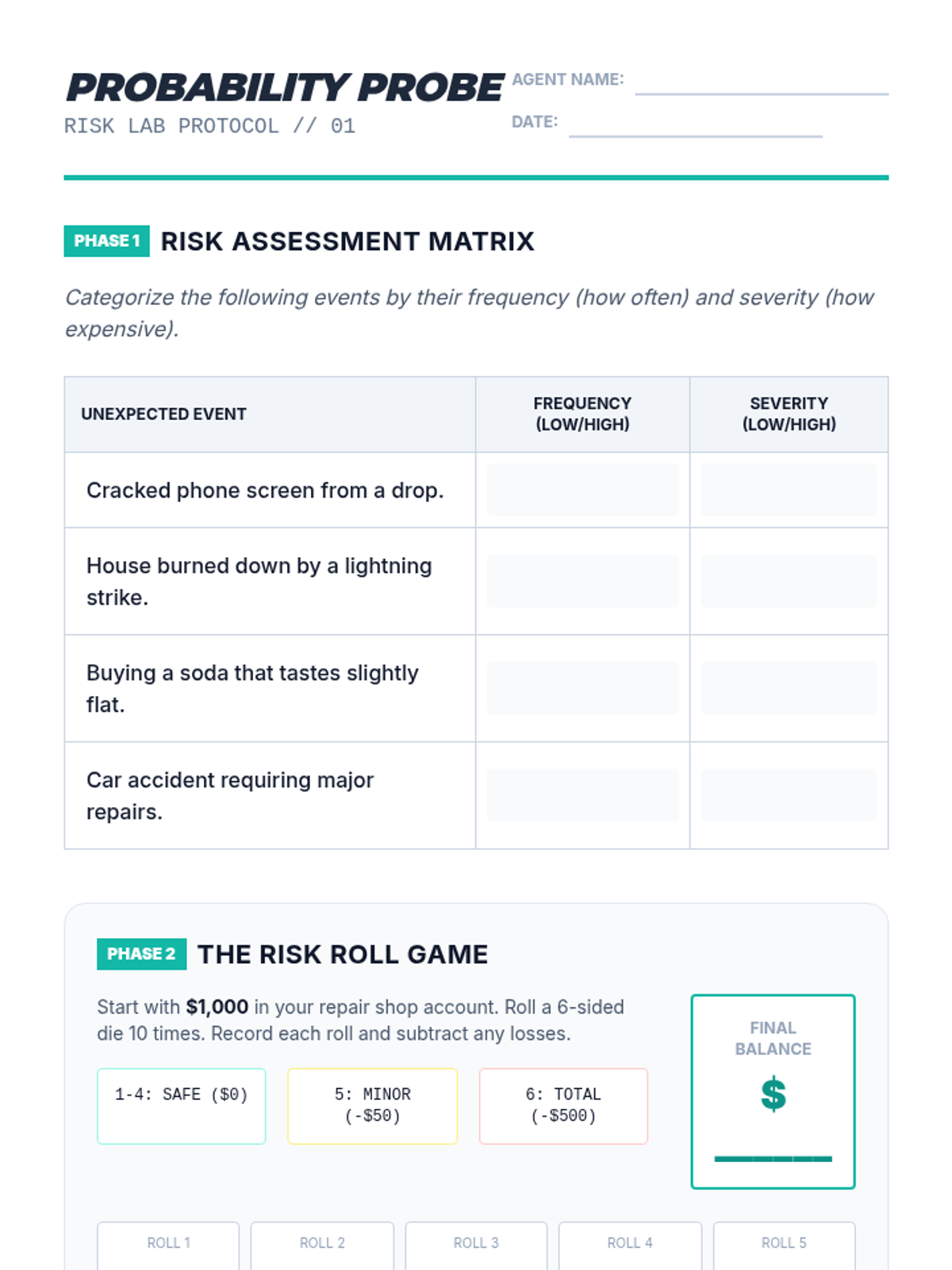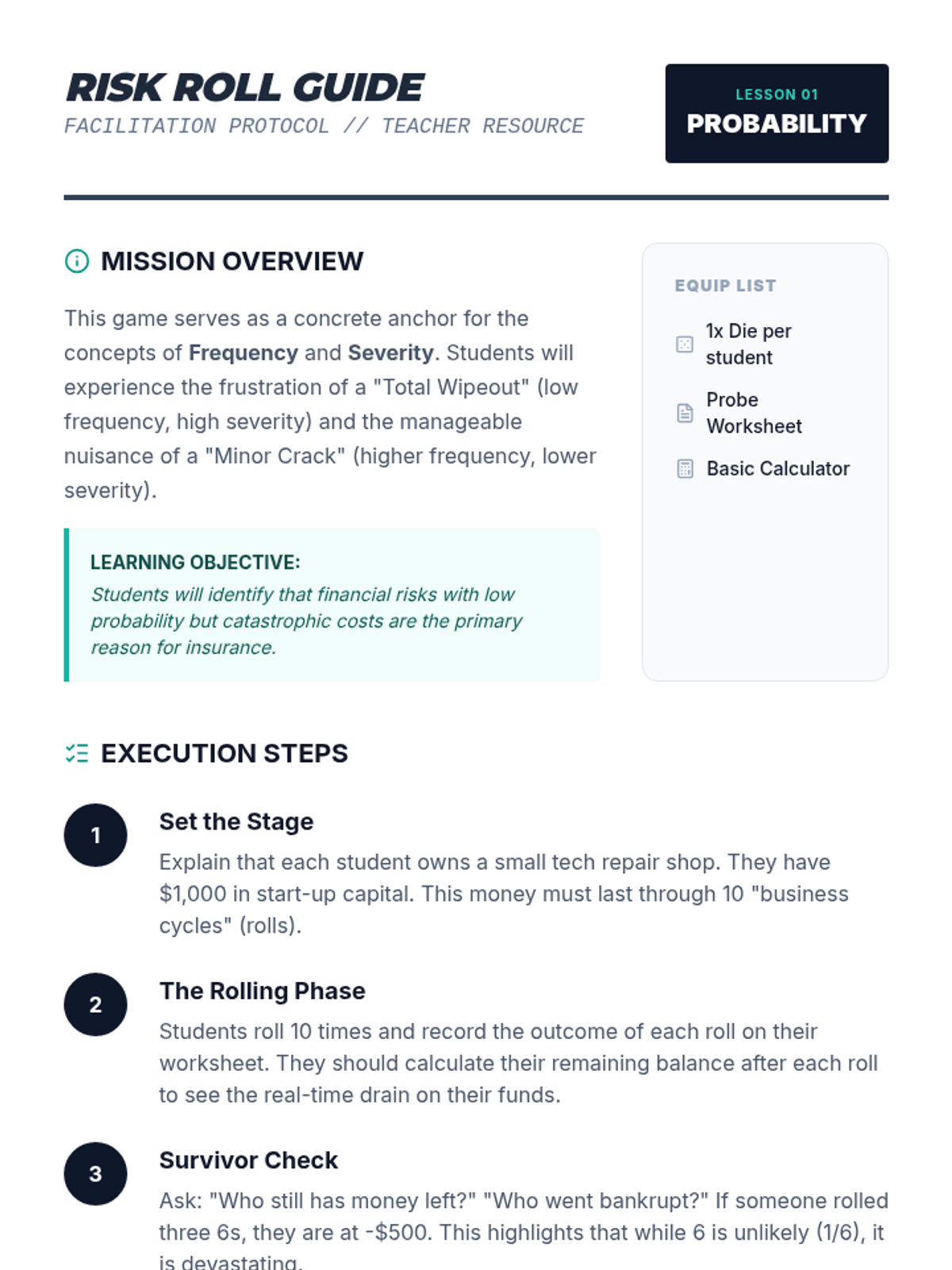 A 5-lesson unit for 8th graders exploring risk management, insurance terminology, and the mechanics of risk pooling through interactive games and a multi-round financial simulation.