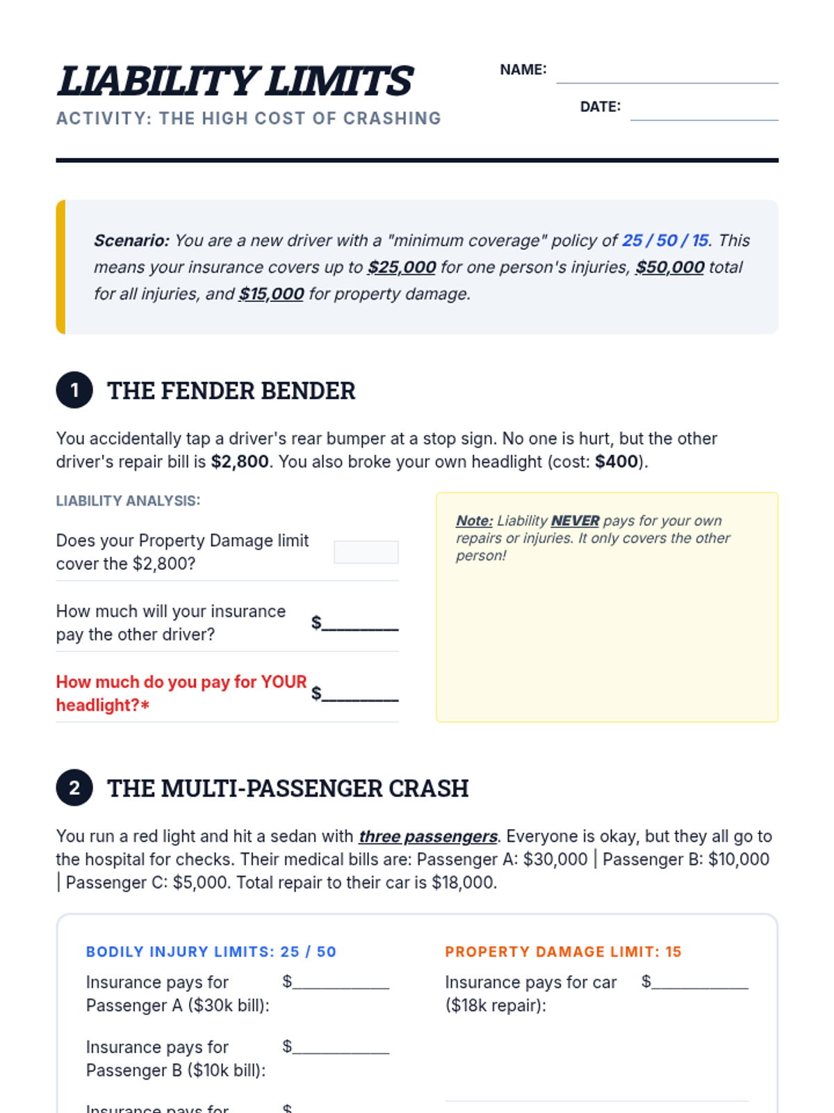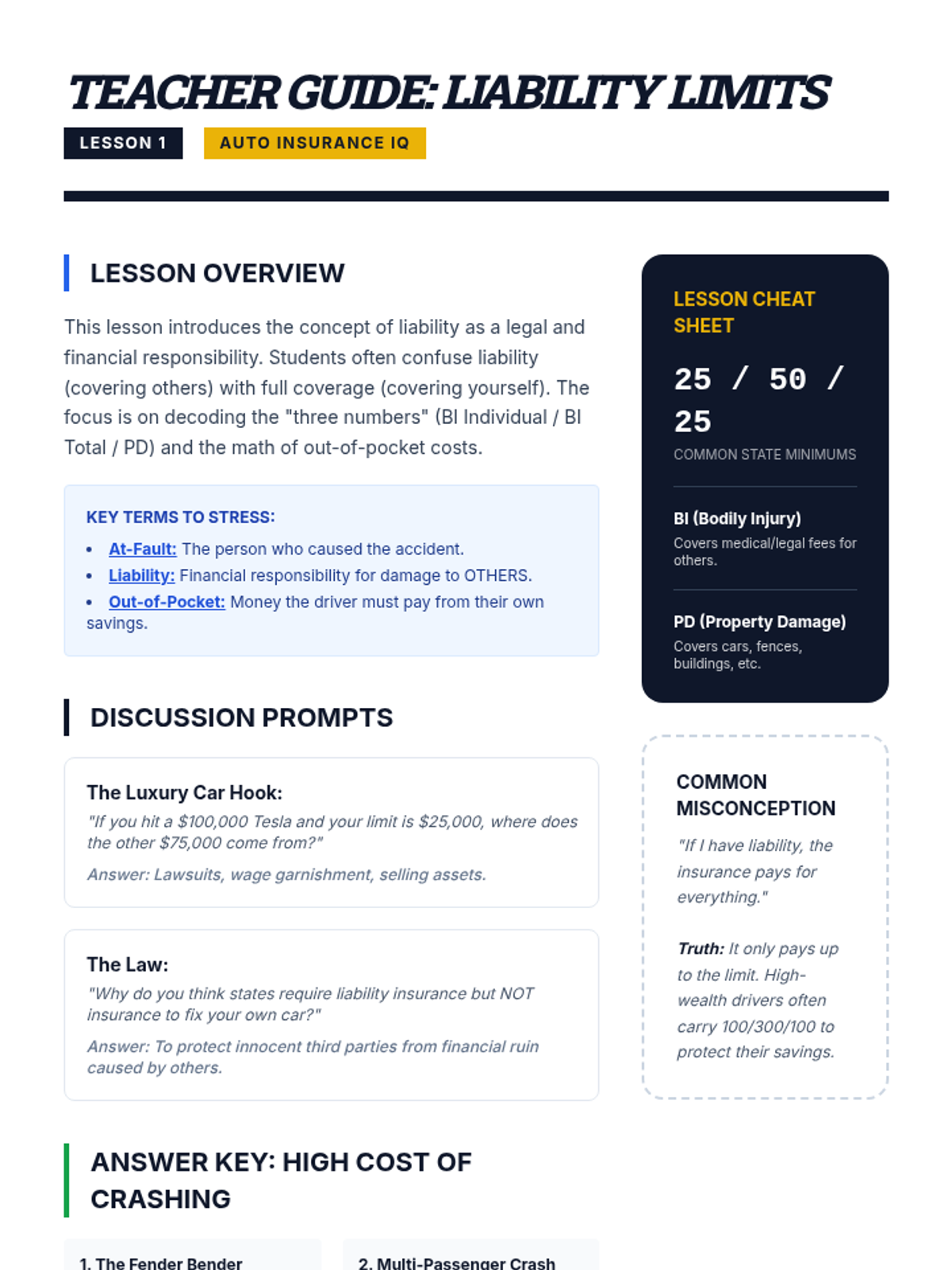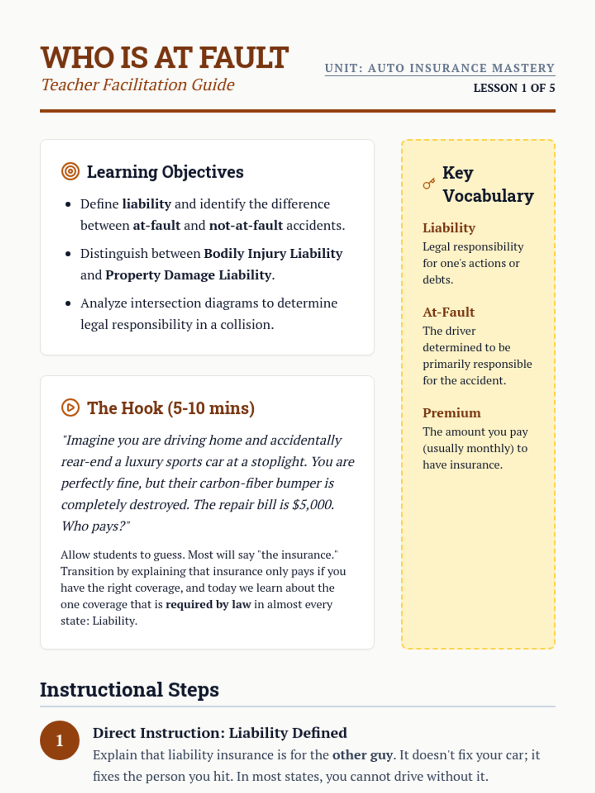A comprehensive 5-lesson unit for 8th graders on auto insurance, covering liability, collision, comprehensive coverage, rate factors, and policy selection using real-world scenarios.