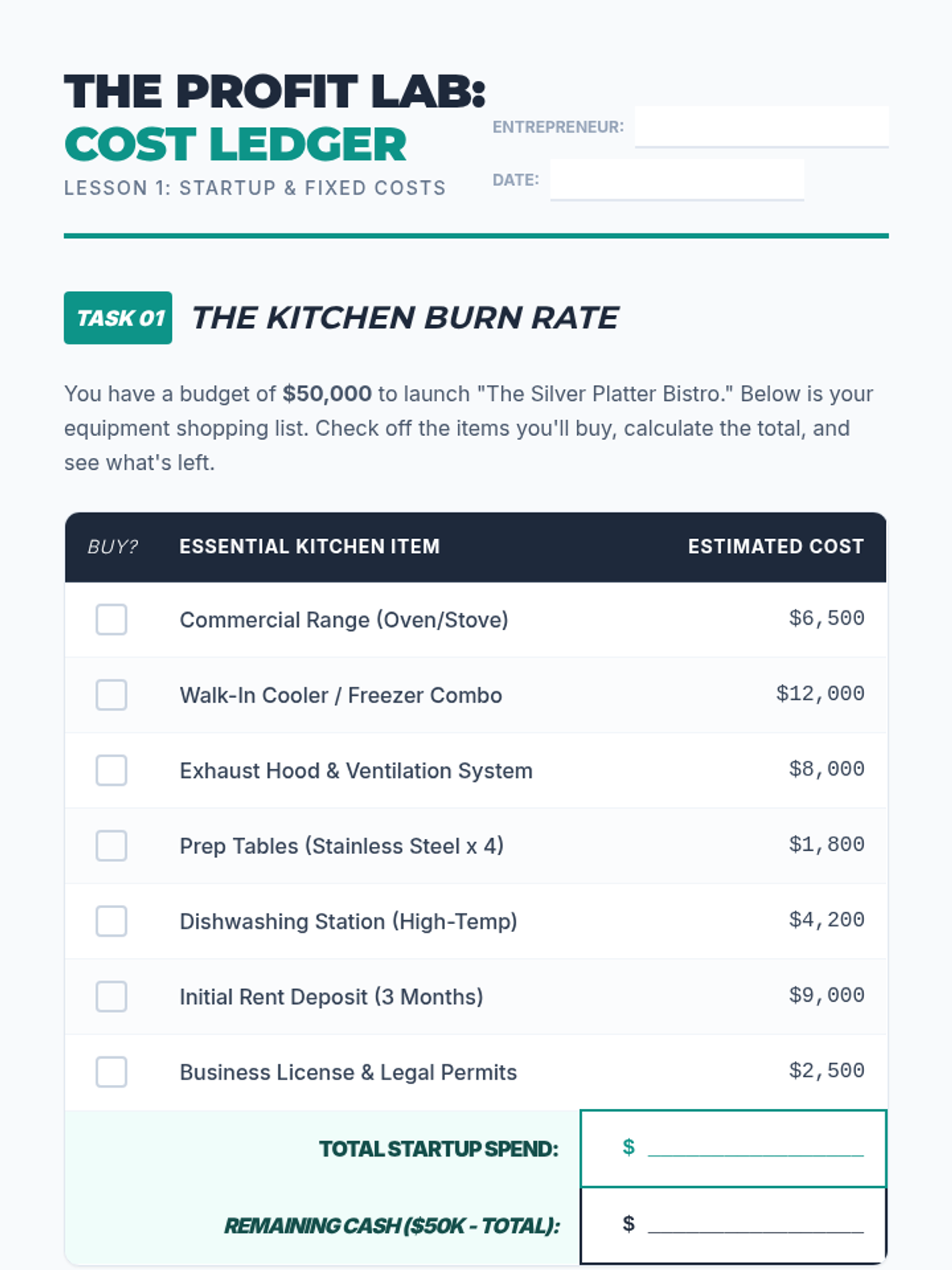 A comprehensive unit on financial literacy for young entrepreneurs, focusing on cost analysis, unit economics, revenue models, and break-even projections to determine business viability.