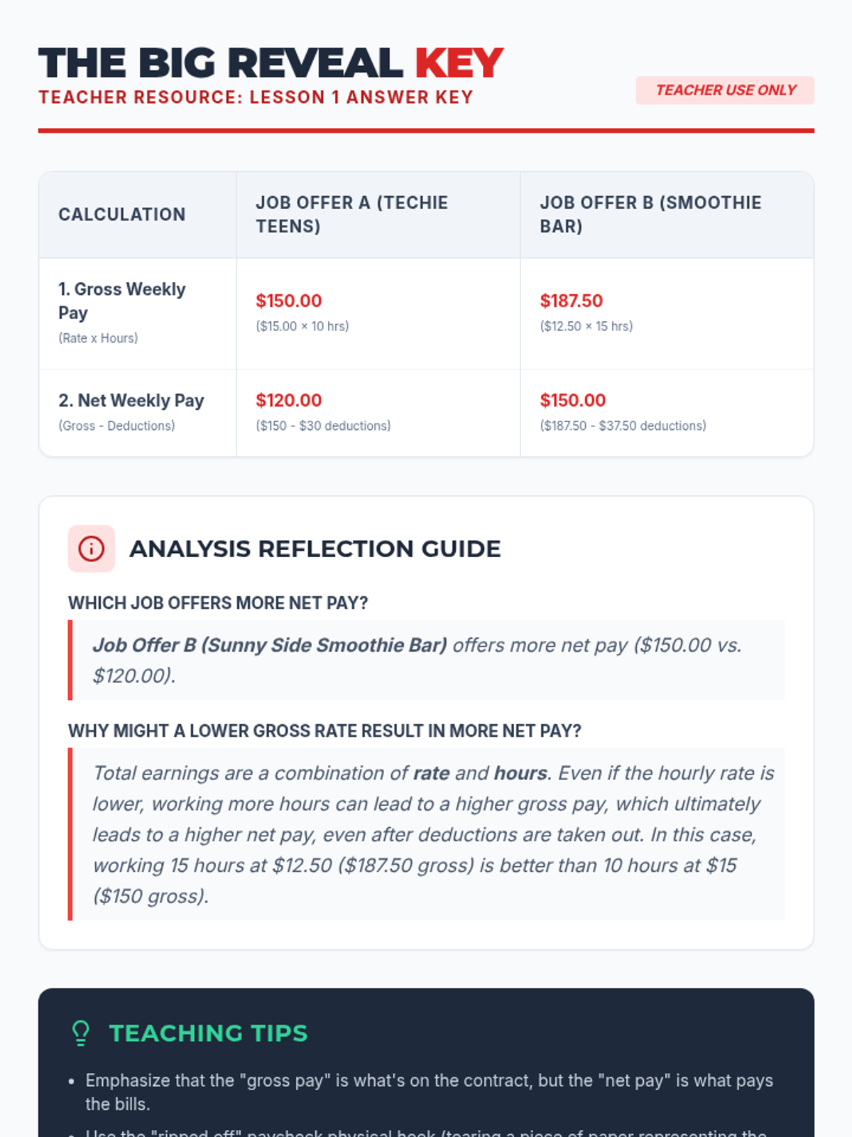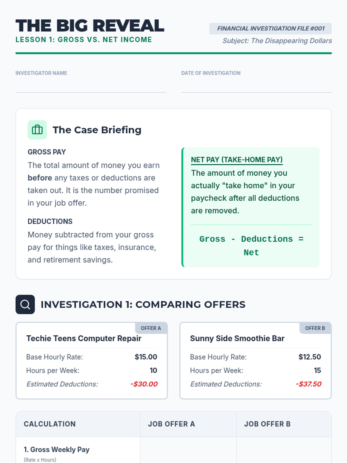 A comprehensive 5-lesson unit for 7th graders on understanding paycheck deductions, taxes, and the difference between gross and net income. Students progress from basic definitions to auditing pay stubs and budgeting with real take-home pay.