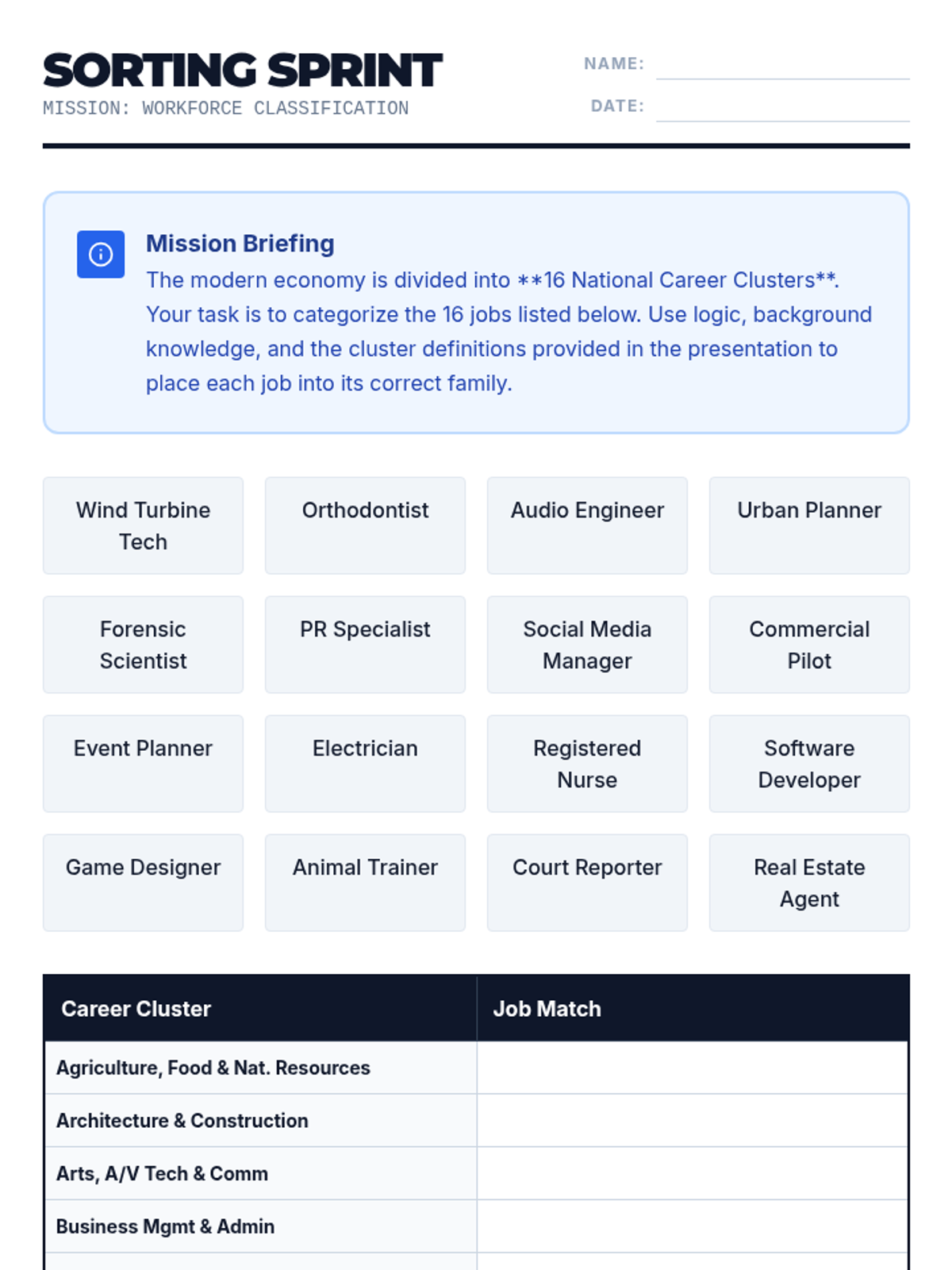 This sequence guides 8th-grade students through the 16 National Career Clusters and labor market trends. Students analyze economic data, cost of living, and career progression to make informed decisions about their future career paths.