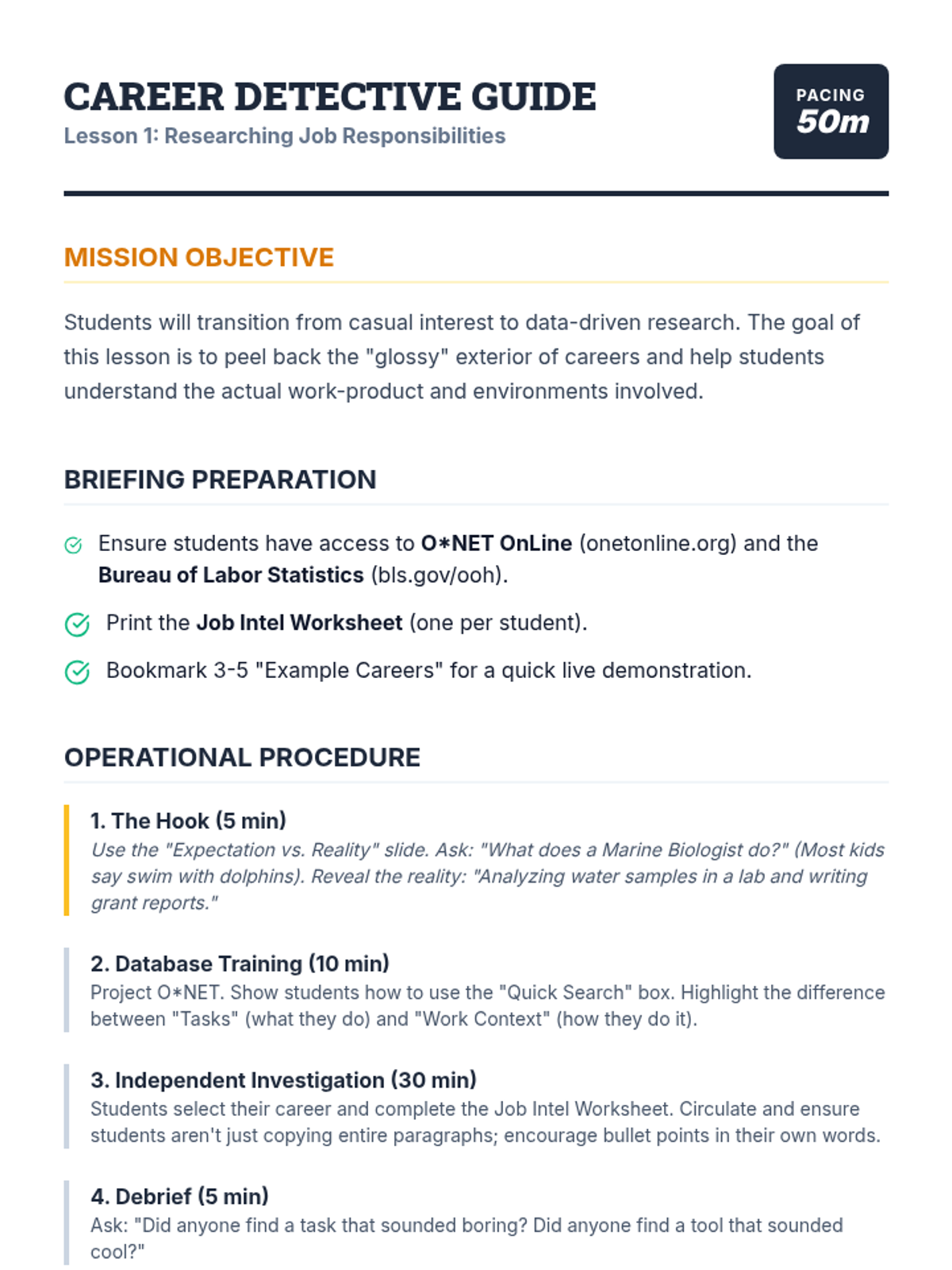 A project-based sequence where 6th-grade students act as 'Career Detectives' to research, analyze, and present a deep-dive investigation into a chosen profession, culminating in a Classroom Career Expo.