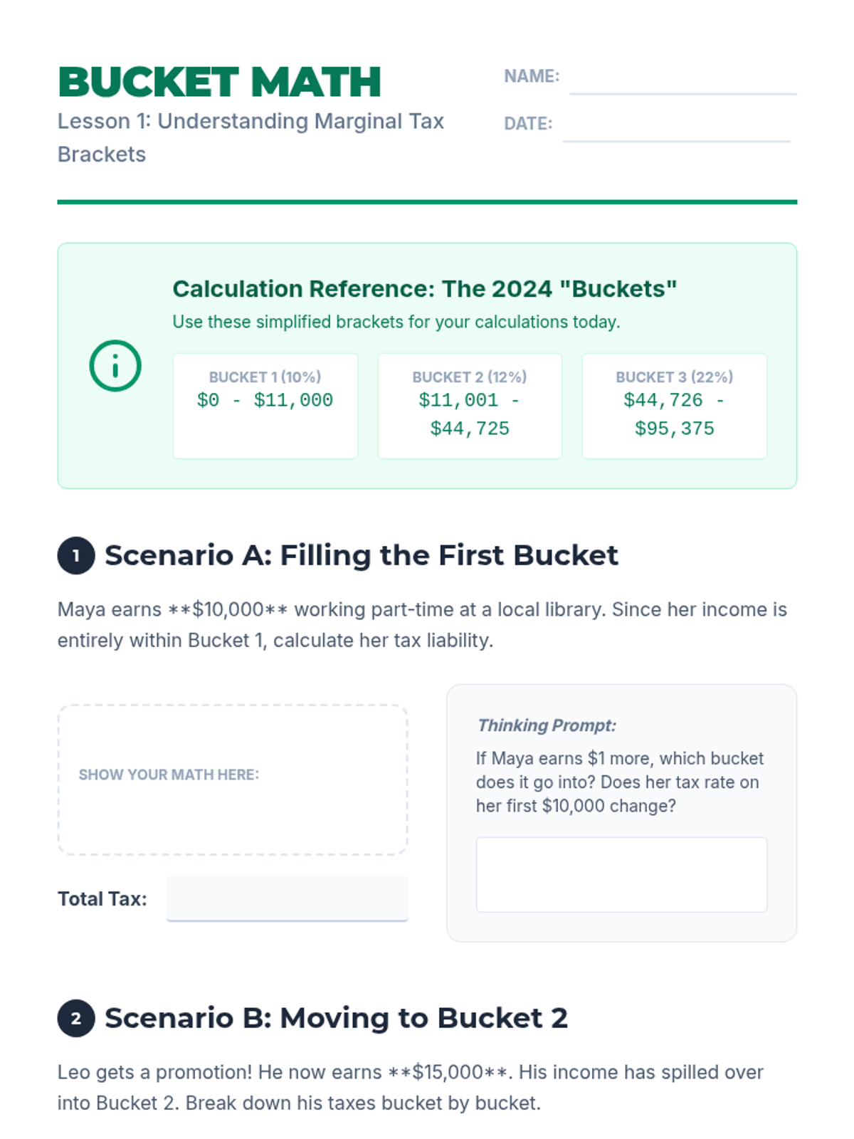 An inquiry and math-focused sequence for 8th-grade students exploring the mechanics of tax liability. Students learn about marginal tax brackets, deductions, credits, and self-employment taxes through skill-building exercises, case studies, and a strategic simulation game.