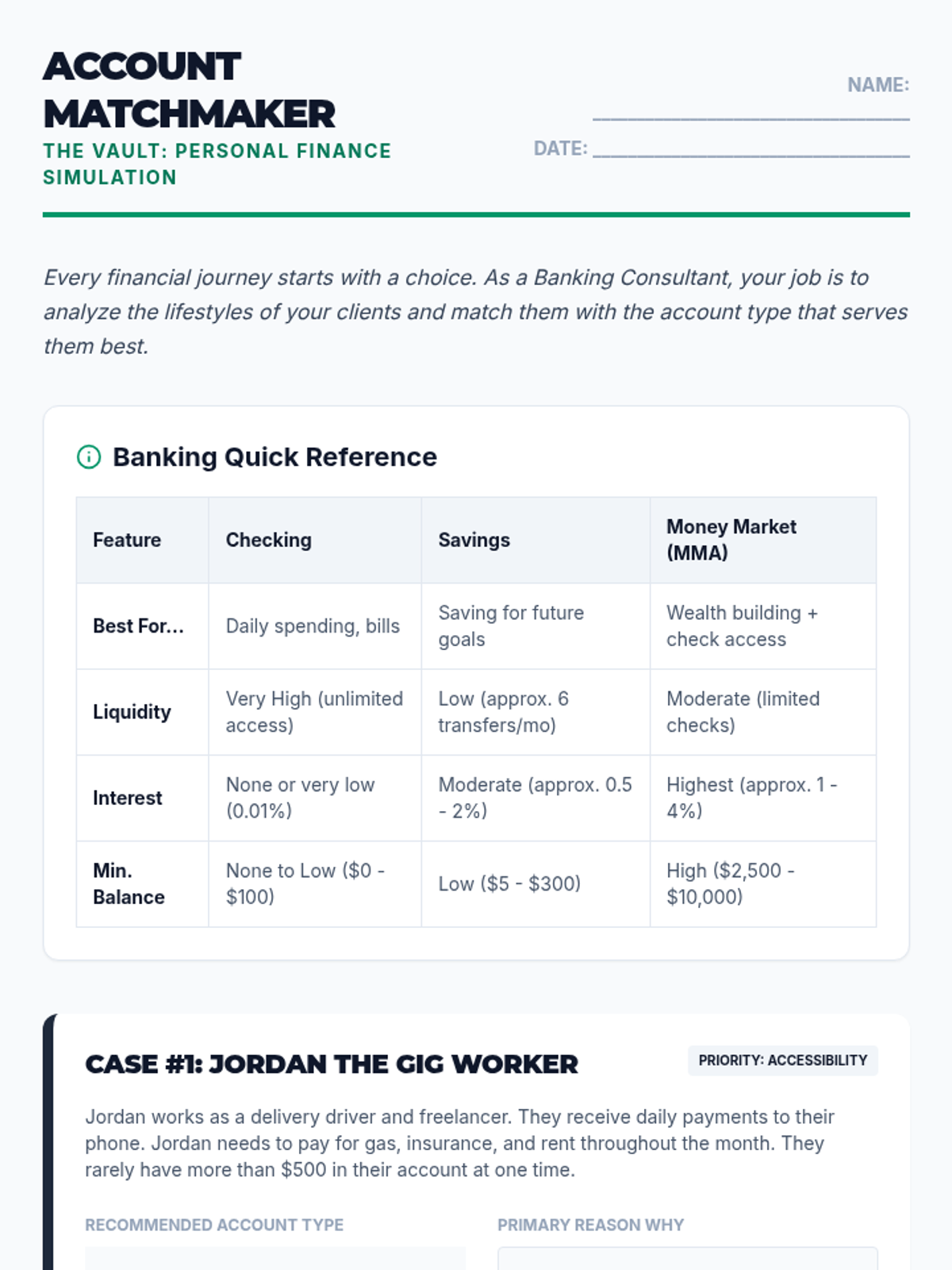 Students enter a simulated classroom economy to learn the mechanics of maintaining a bank account, including checking and savings distinctions, ledger maintenance, understanding fees, and account reconciliation.