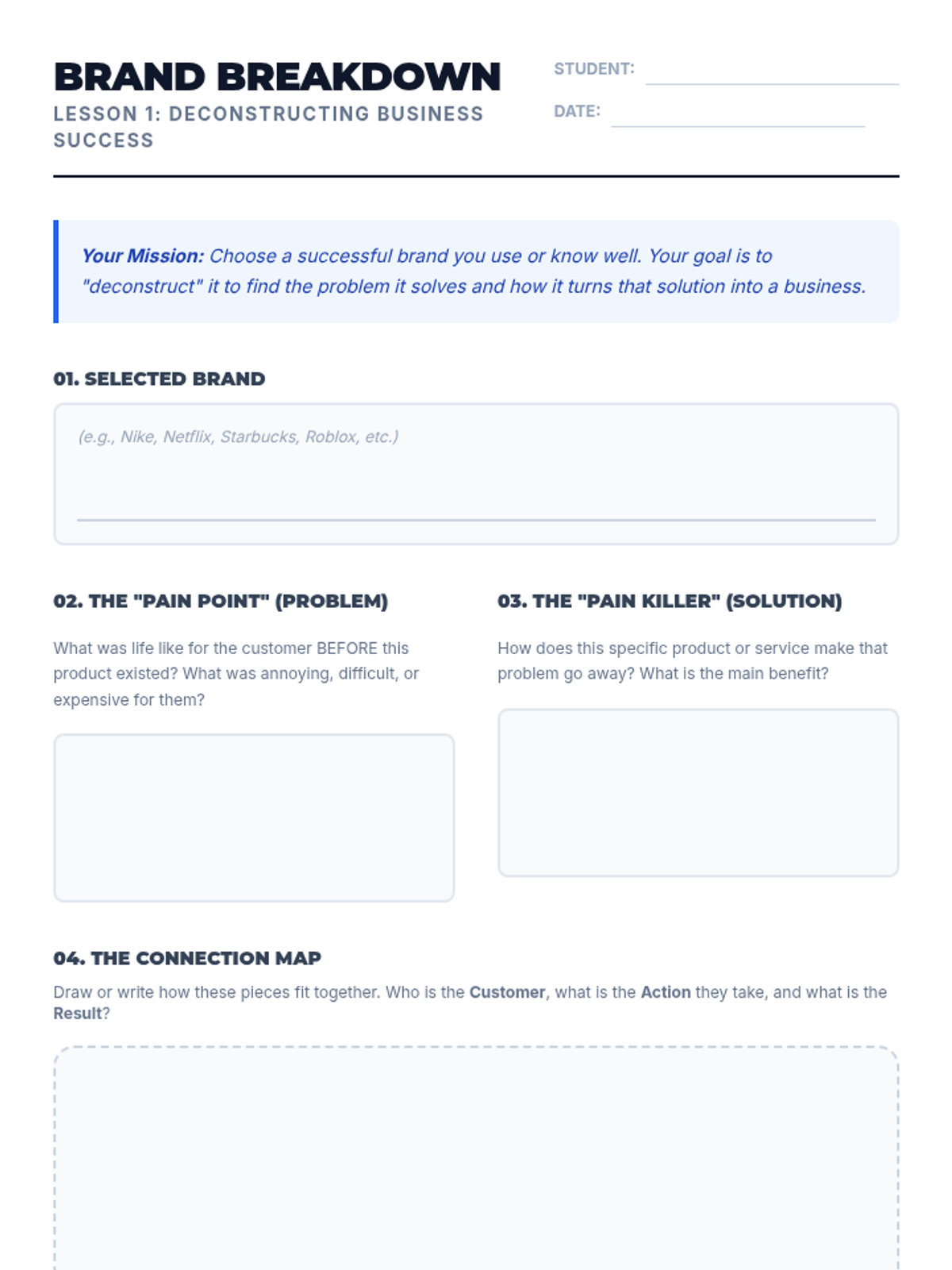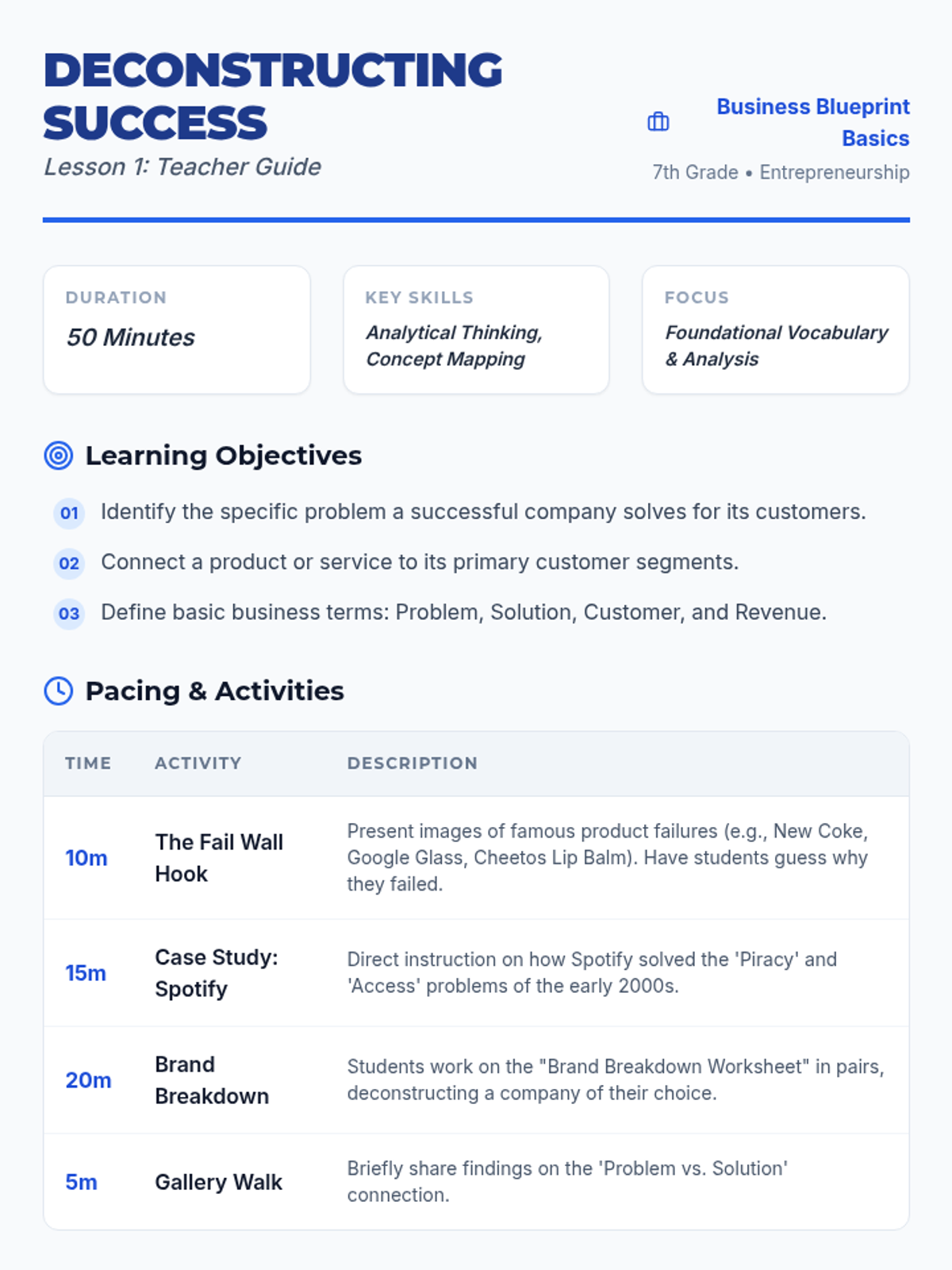 Students explore the core components of business planning by deconstructing successful brands, mapping value propositions, tracing supply chains, and analyzing revenue models. The sequence culminates in a SWOT analysis evaluation of a local business scenario to determine its real-world viability.
