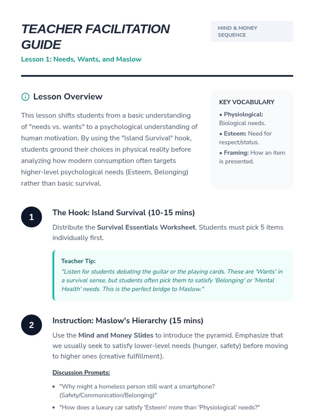 This sequence explores the psychology behind spending, focusing on impulse control, emotional triggers, and the economic concept of opportunity cost. Students move from basic needs/wants categorization to developing a personalized mindful spending plan.
