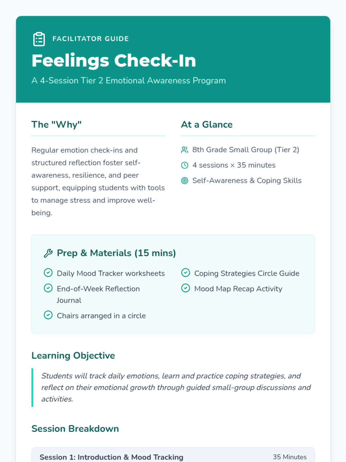 A 4-session Tier 2 small group program for 8th graders focused on building self-awareness, emotional regulation, and peer support through structured mood tracking and reflection.