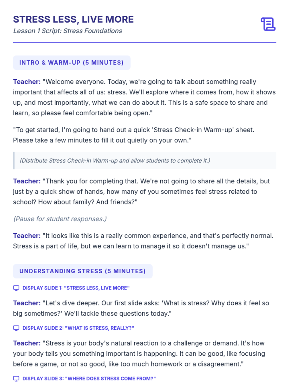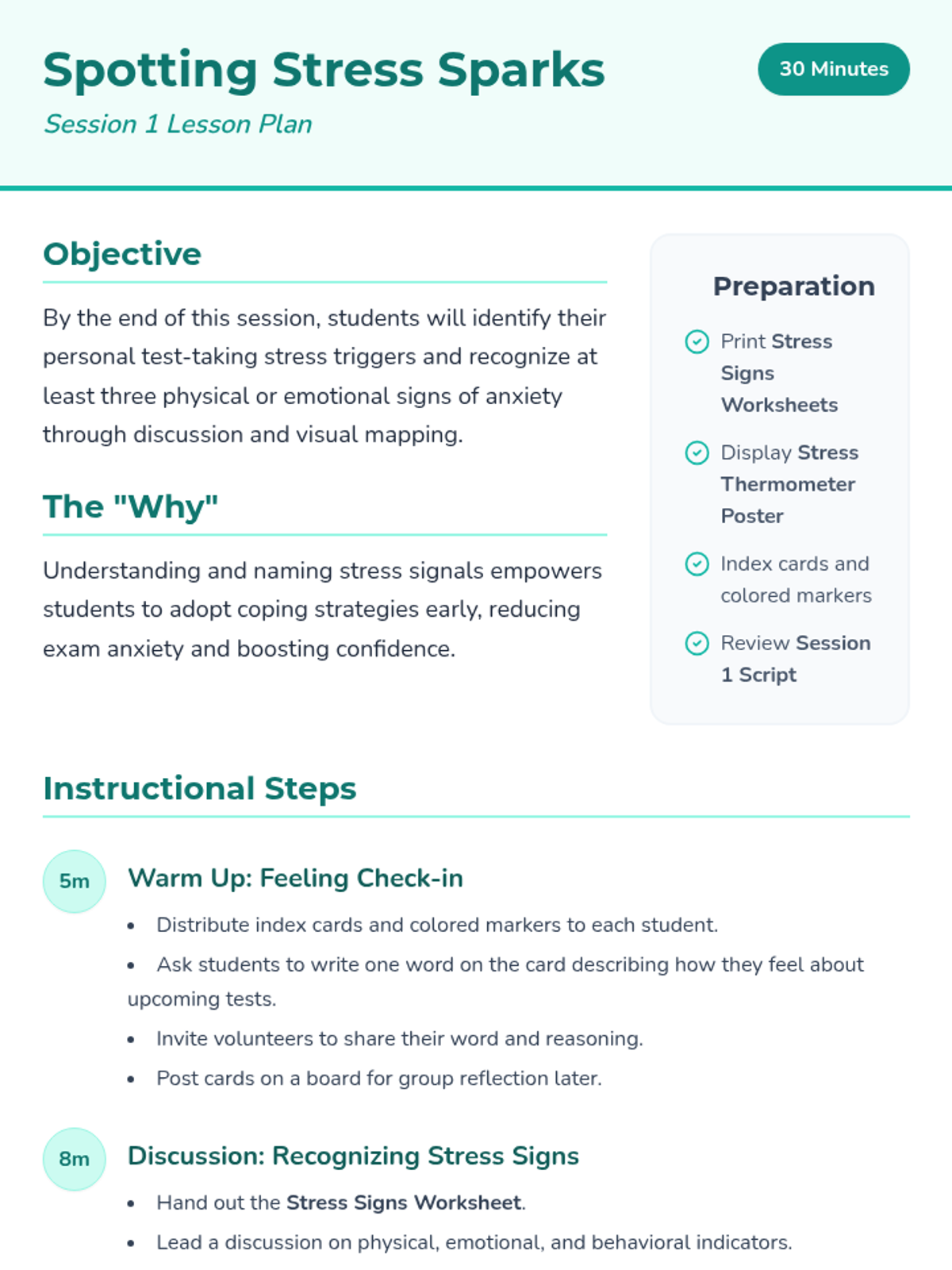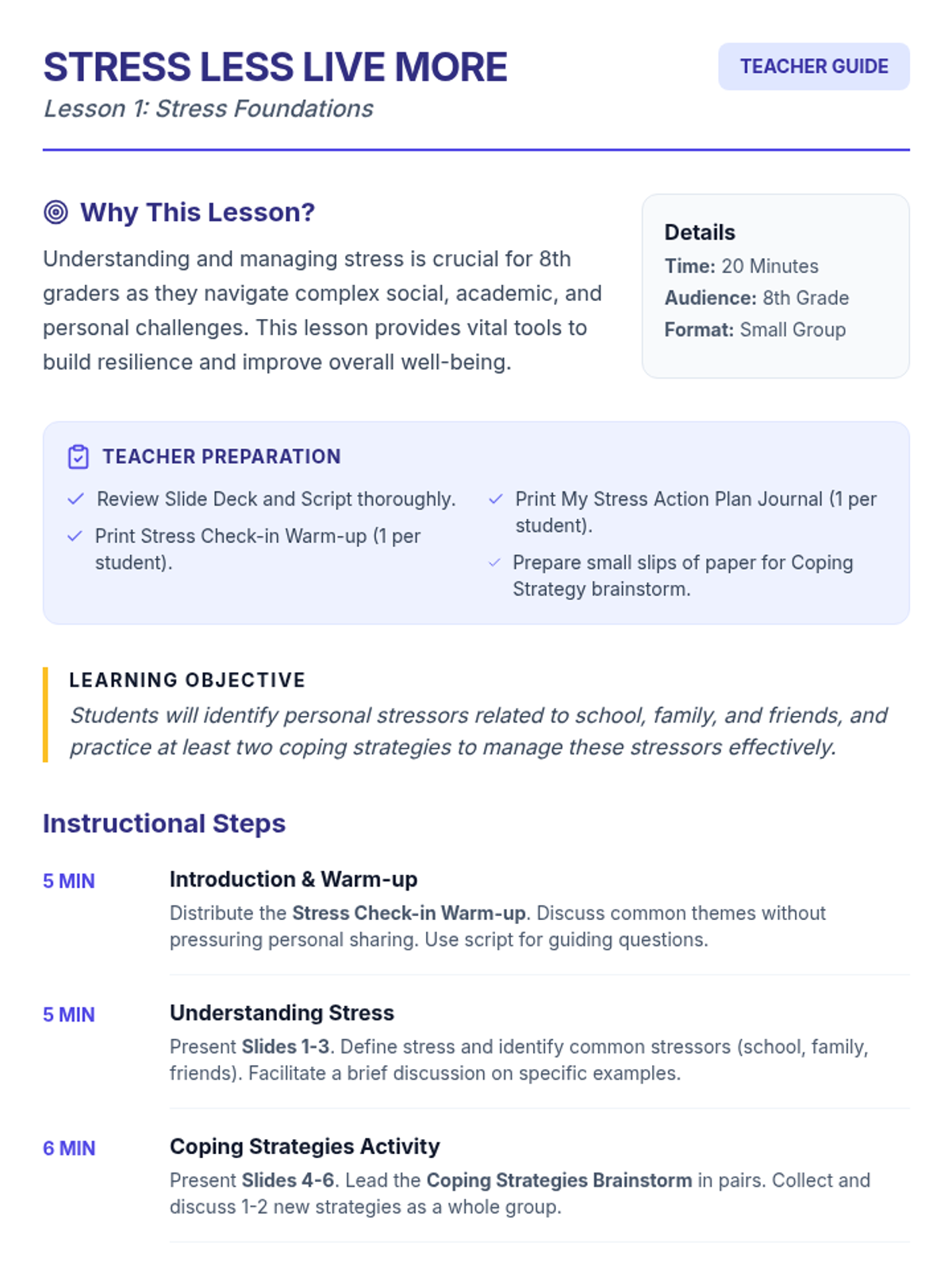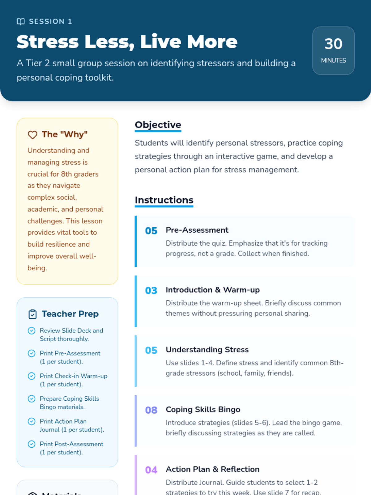 A comprehensive 6-session Tier 2 small group sequence for 8th-grade students to master stress management through music, art, movement, resilience-building, and communication.