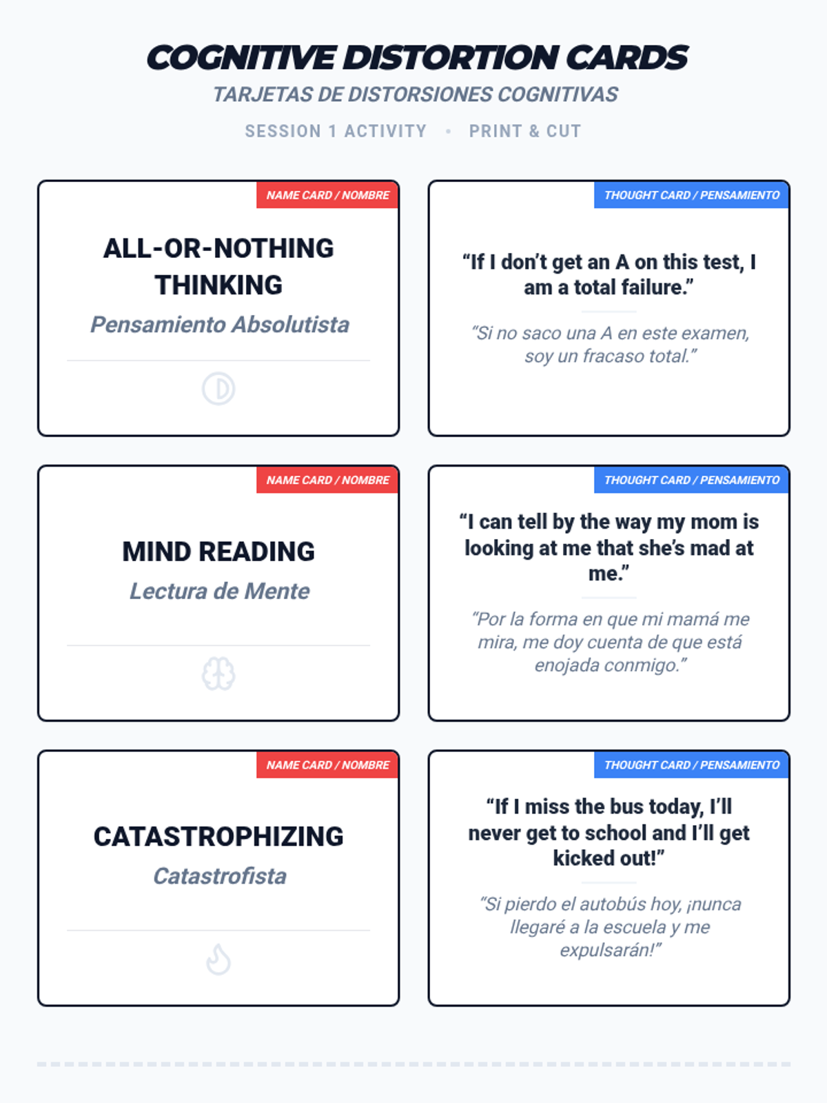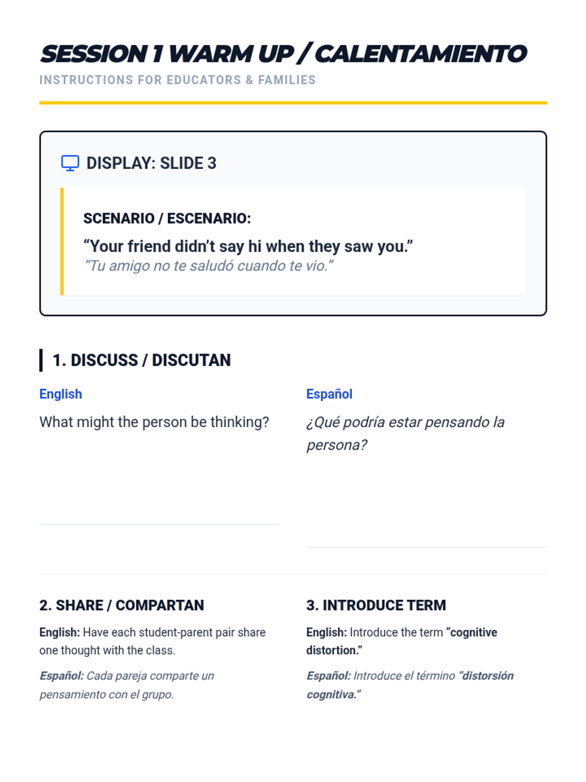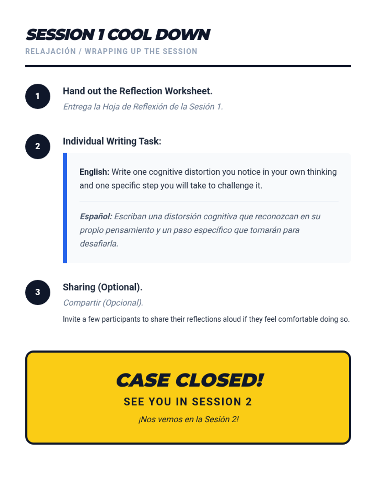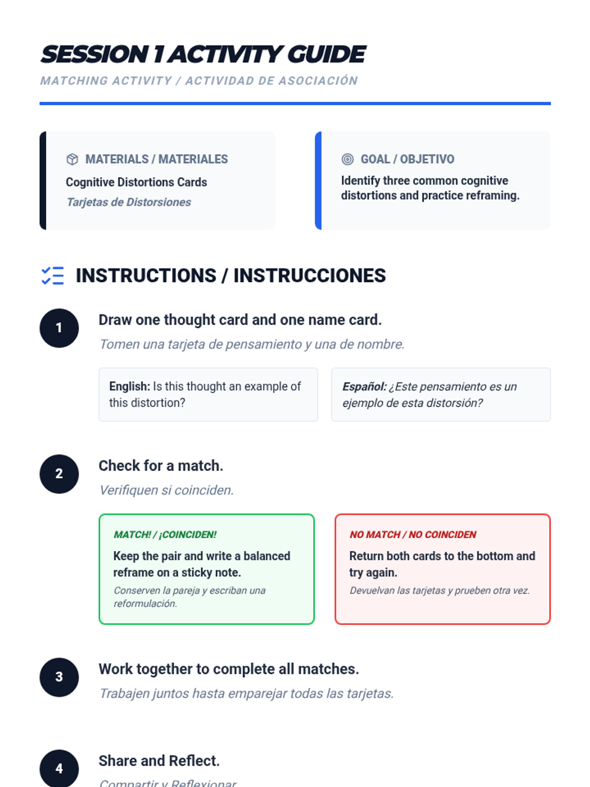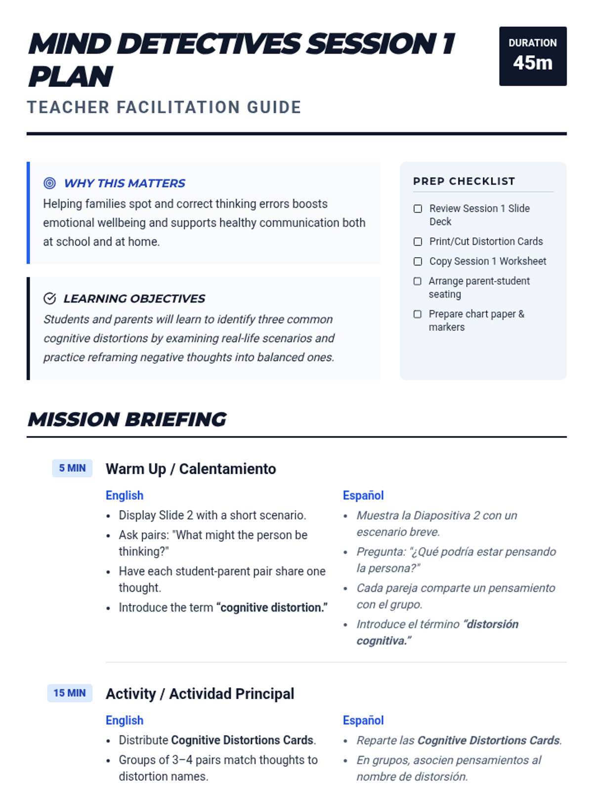 A two-session bilingual program for students and parents to identify and challenge cognitive distortions, improving emotional wellbeing and family communication.