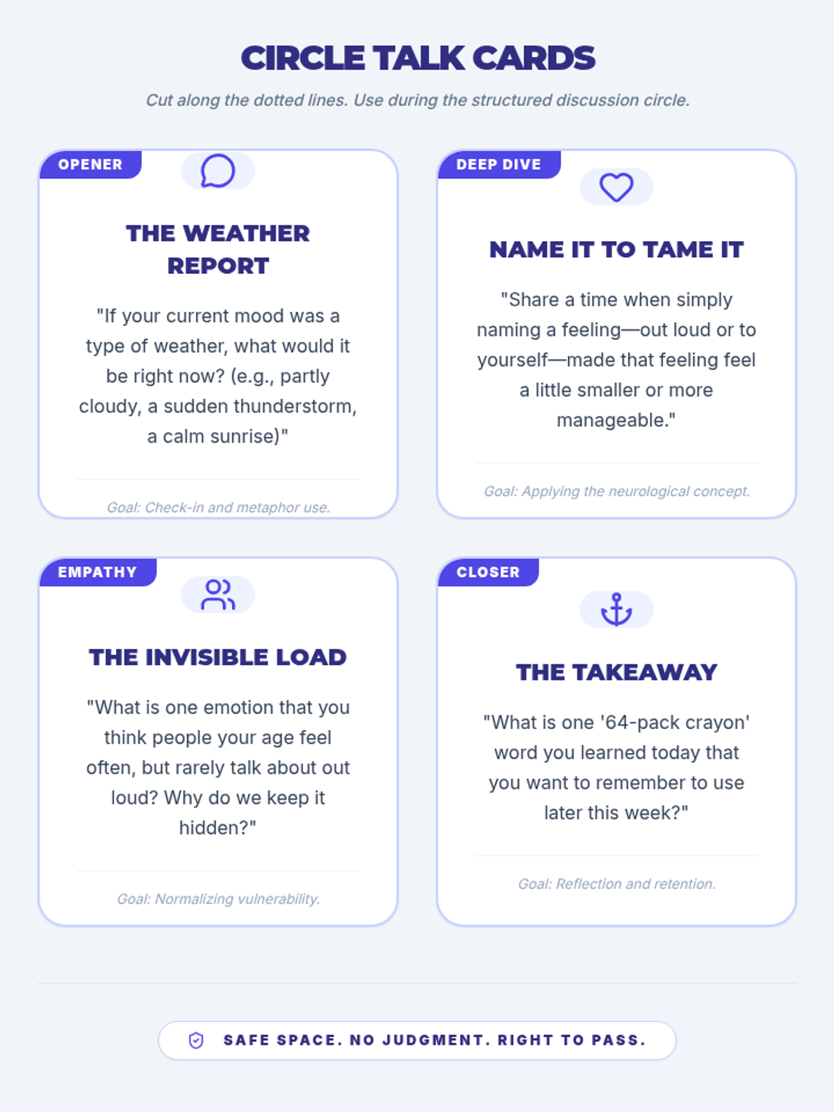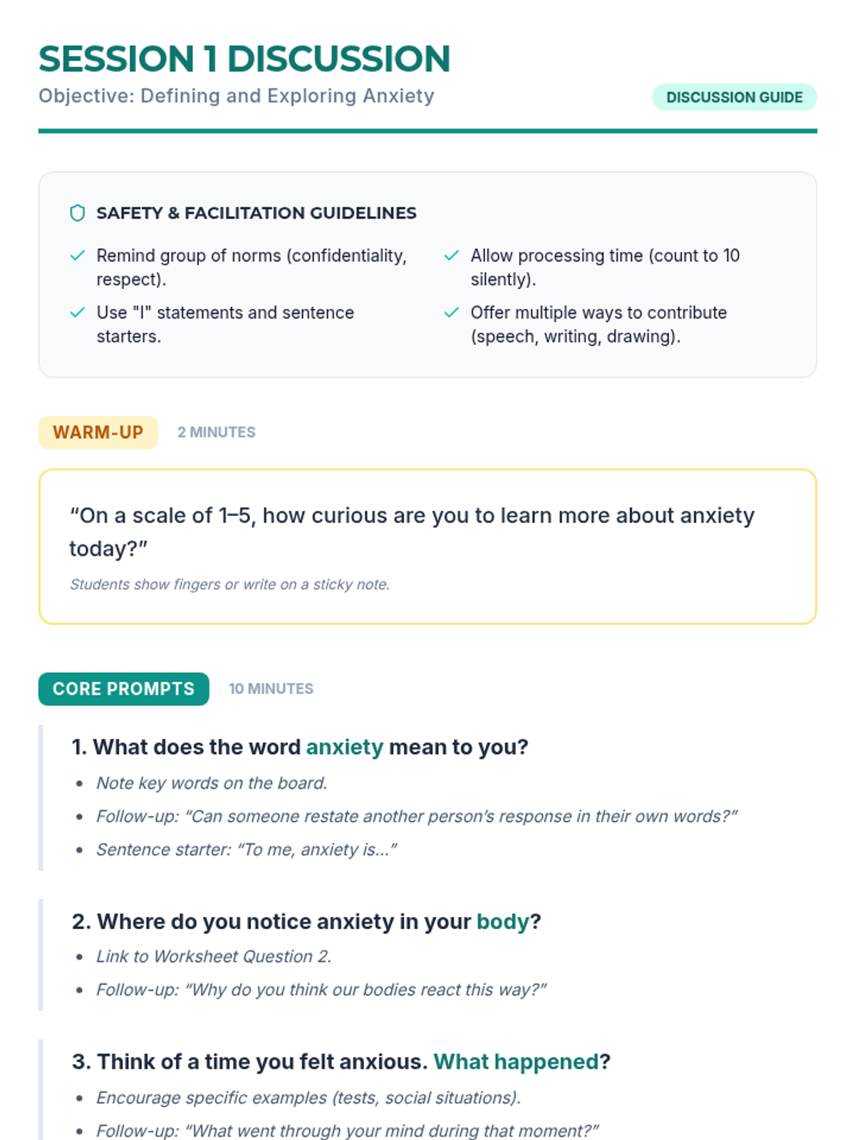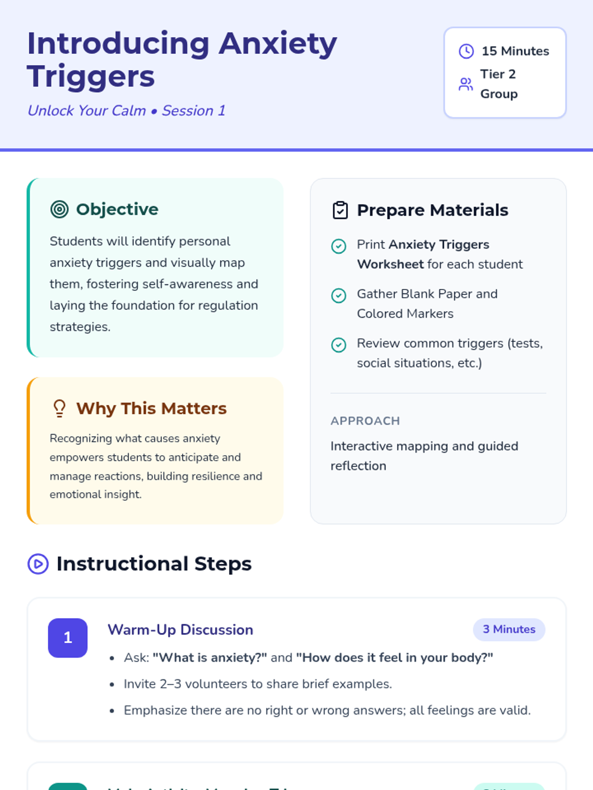 A 4-week Tier 2 group program for 6th-grade students to understand and manage anxiety using a personal 'toolkit' of coping strategies. Each 15-minute session provides practical, evidence-based skills through discussion, breathing exercises, and cognitive reframing.