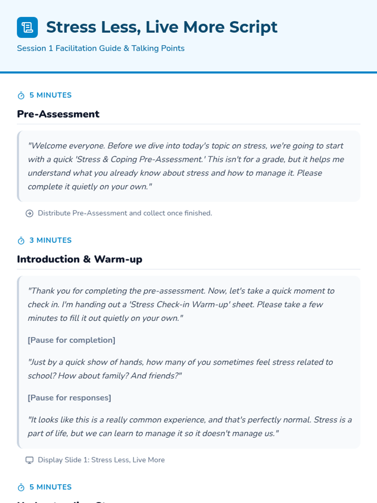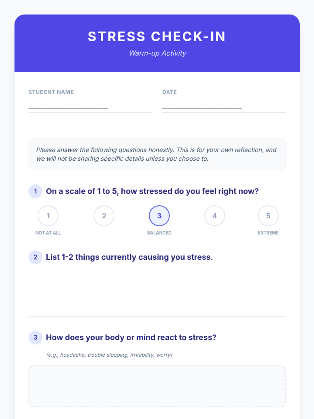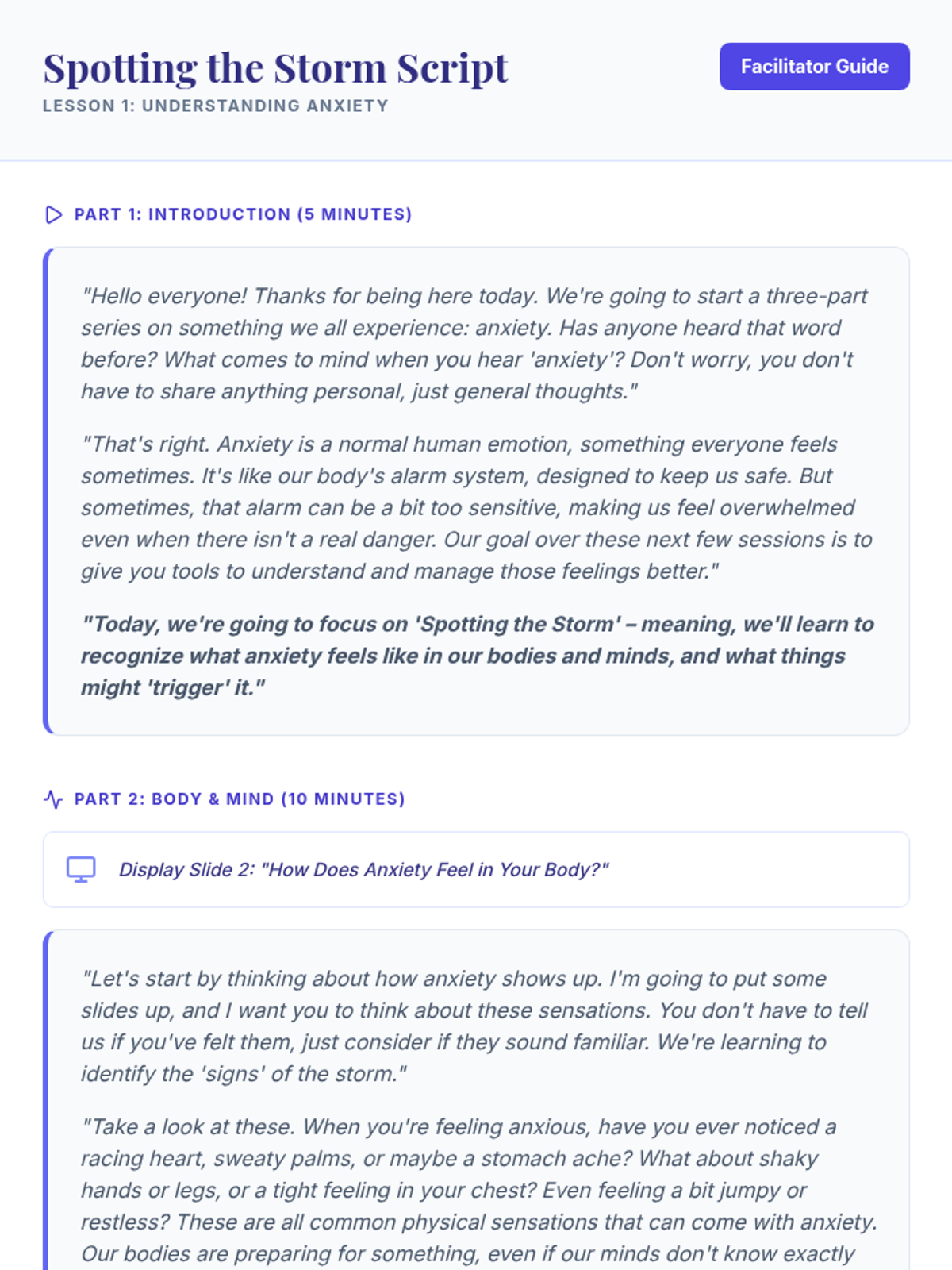 A 4-week Tier 2 group program for 6th-grade students to understand and manage anxiety using a personal 'toolkit' of coping strategies. Each 15-minute session provides practical, evidence-based skills through discussion, breathing exercises, and cognitive reframing.