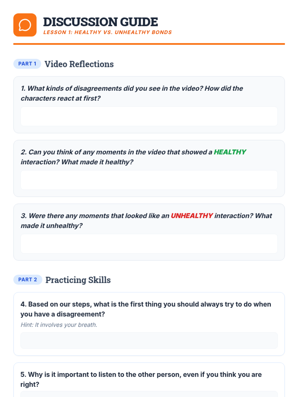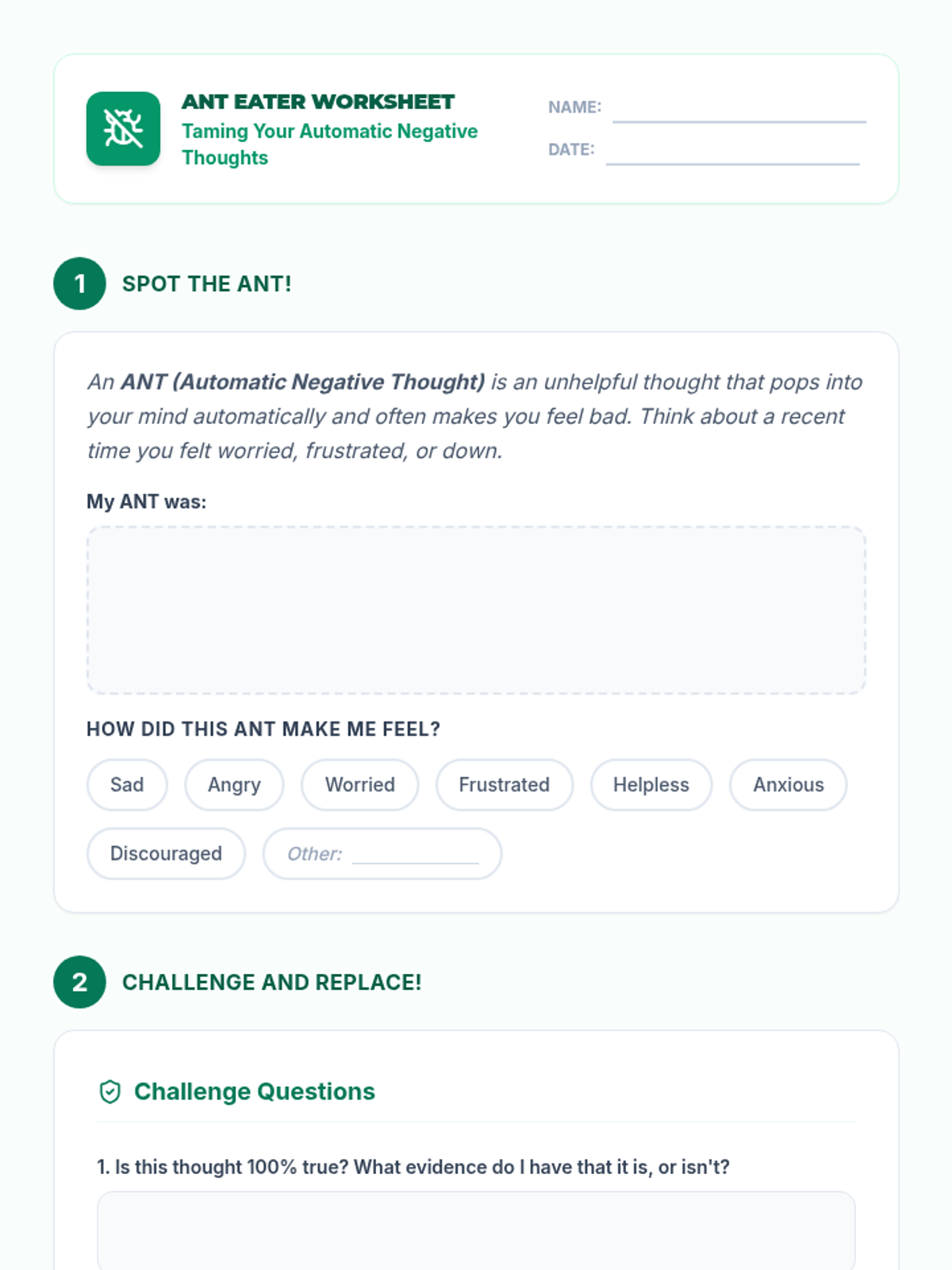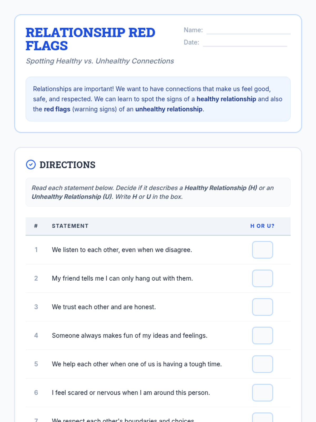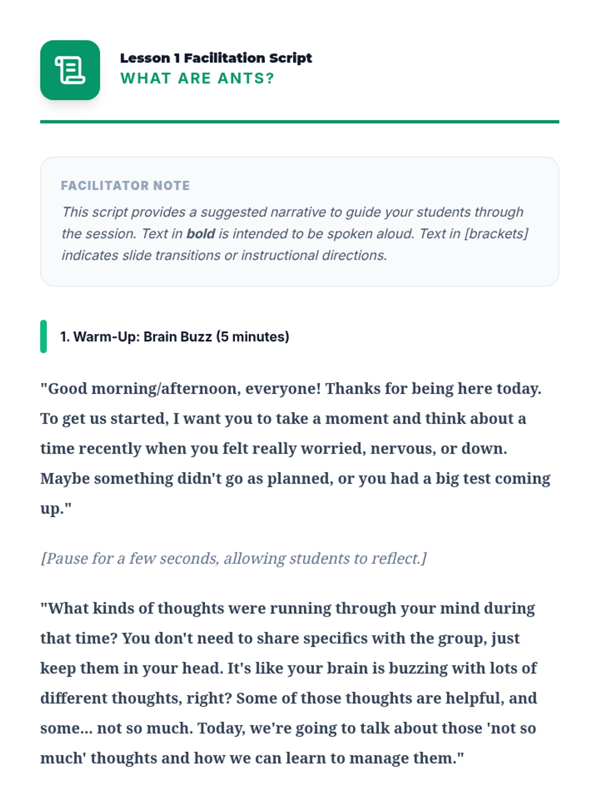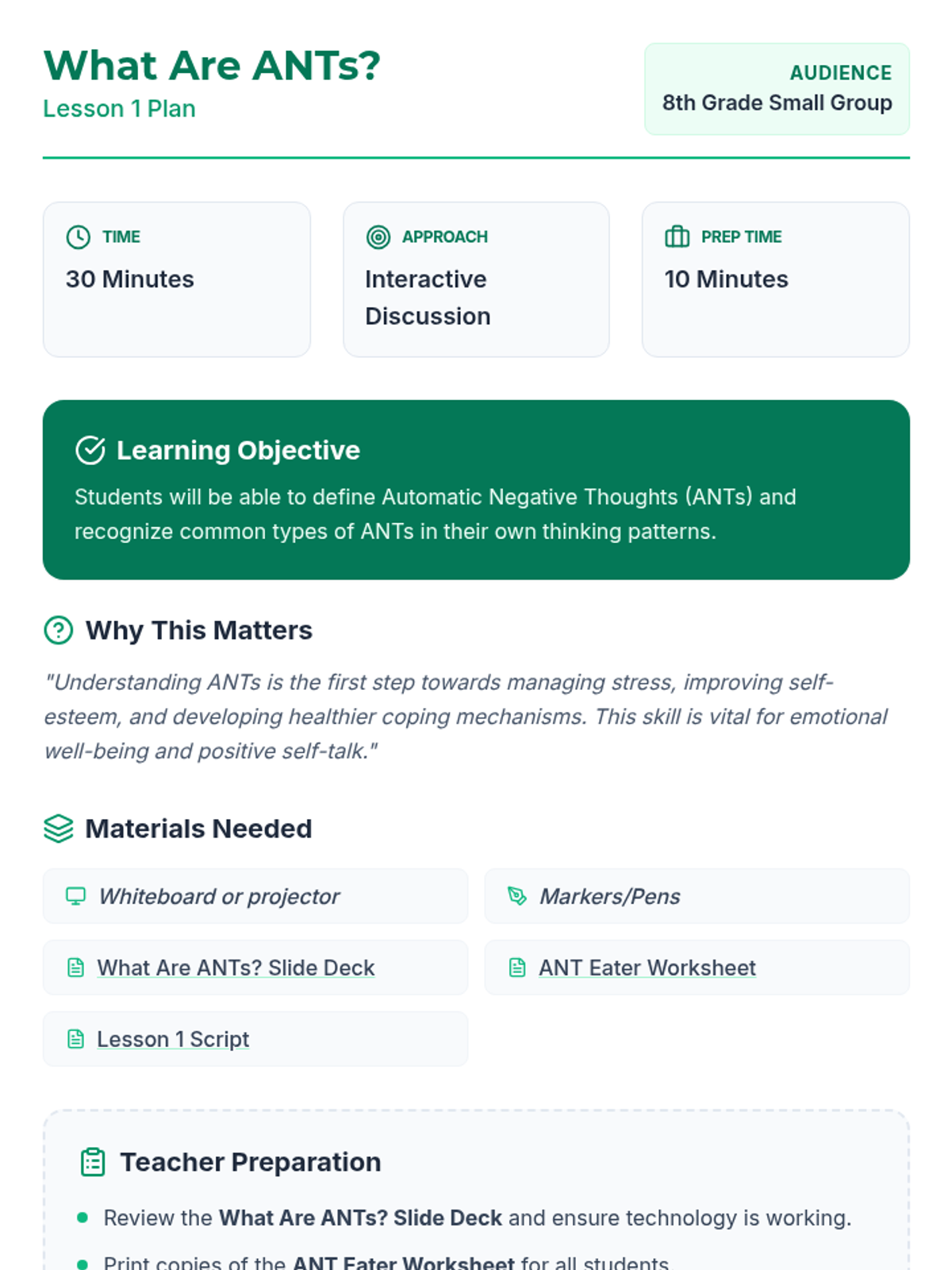 A comprehensive 12-lesson curriculum for 8th-grade small groups designed to build emotional resilience and healthy relationship skills. Students learn to identify and challenge automatic negative thoughts (ANTs), set healthy boundaries, use positive affirmations, and communicate assertively.