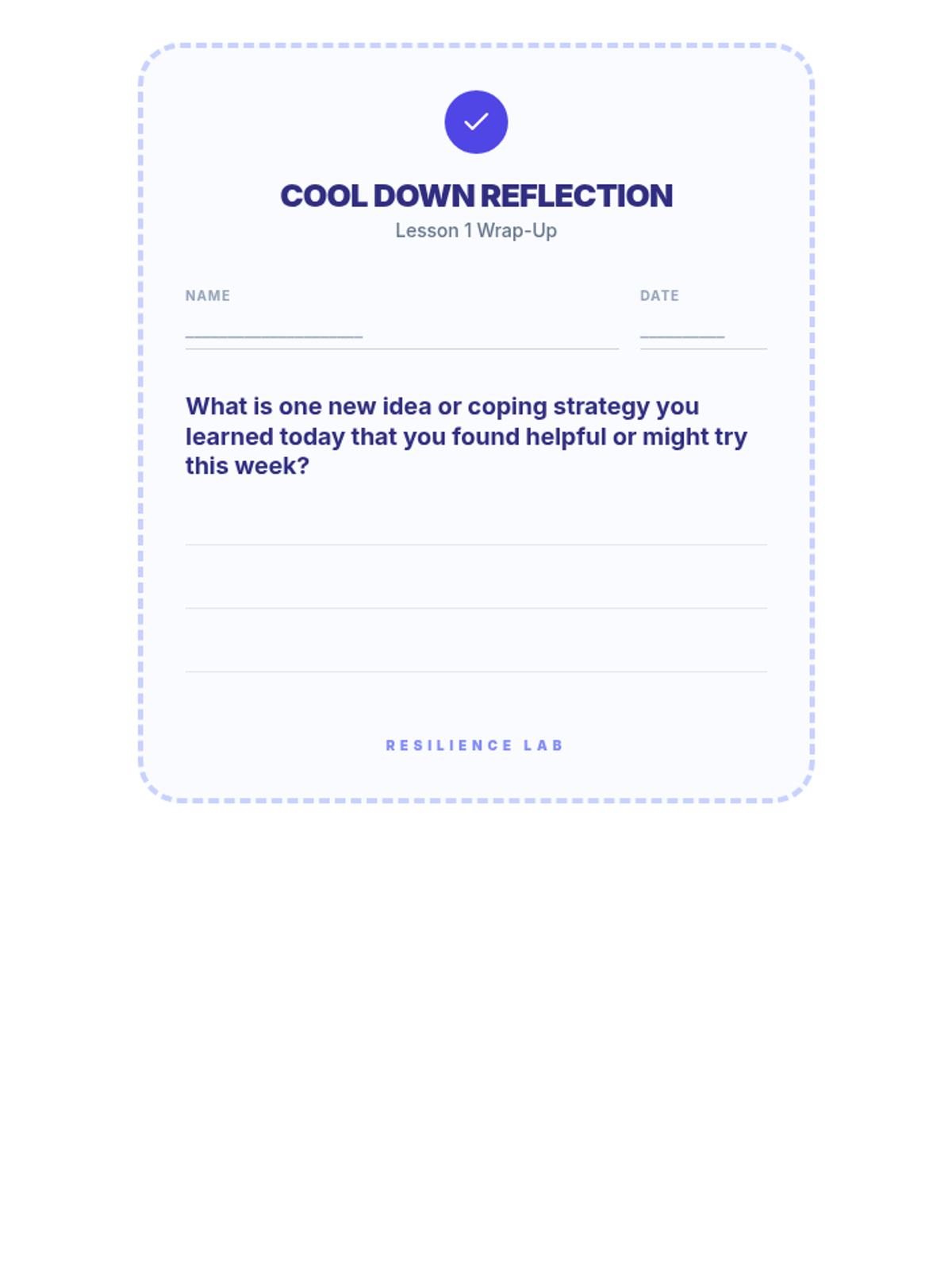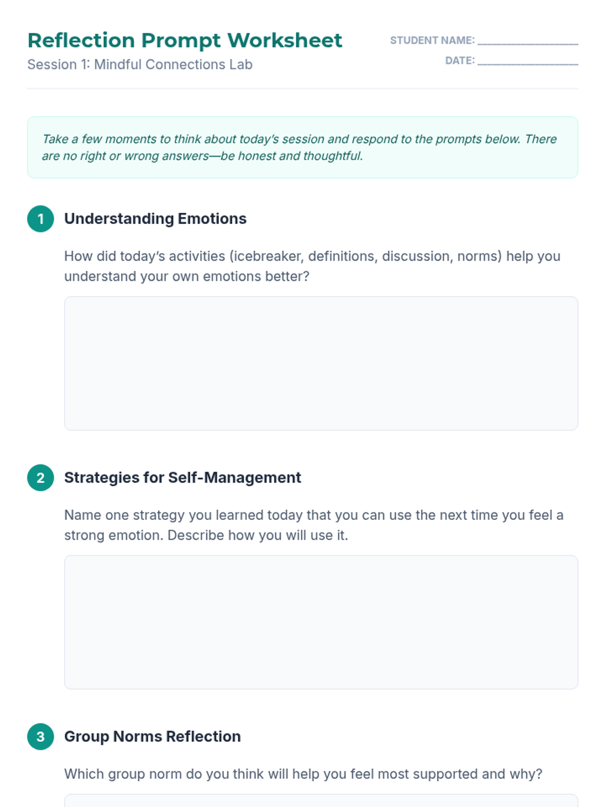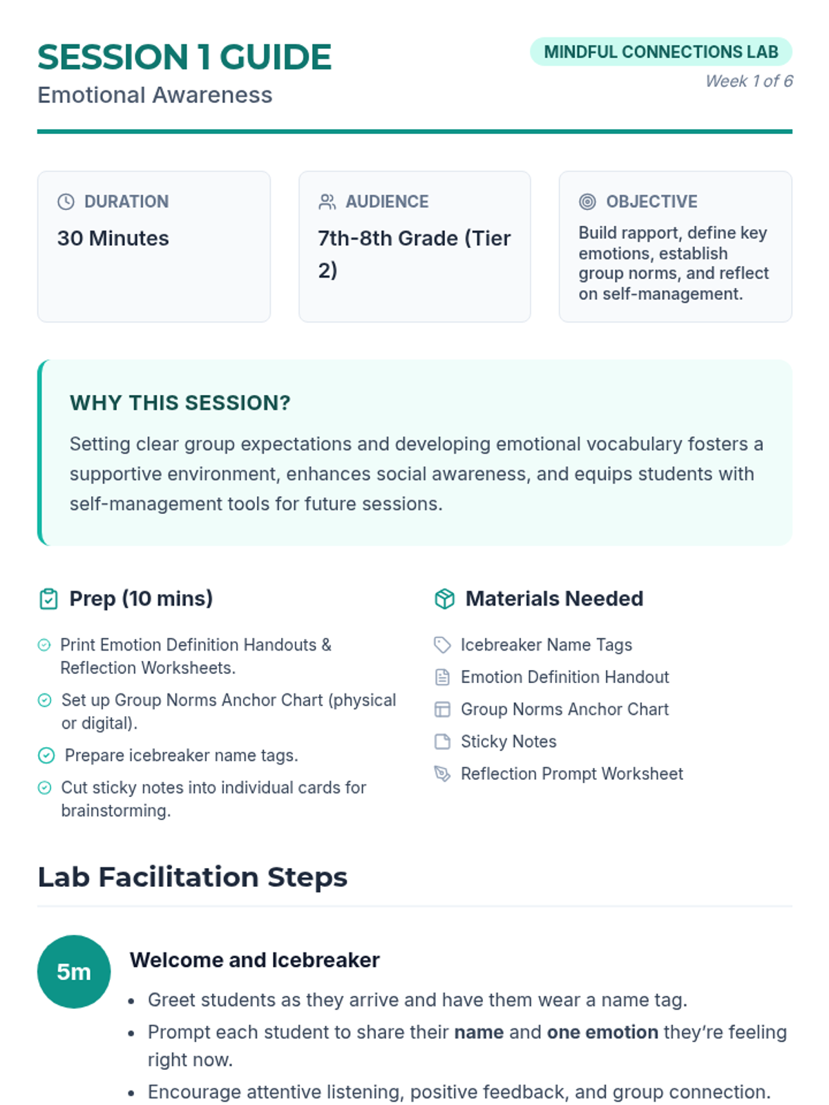 A 6-week Tier 2 small group intervention for middle schoolers to develop social-emotional skills including empathy, emotional regulation, and conflict resolution. Students engage in lab-style reflections and activities to build a toolkit for self-management and social awareness.
