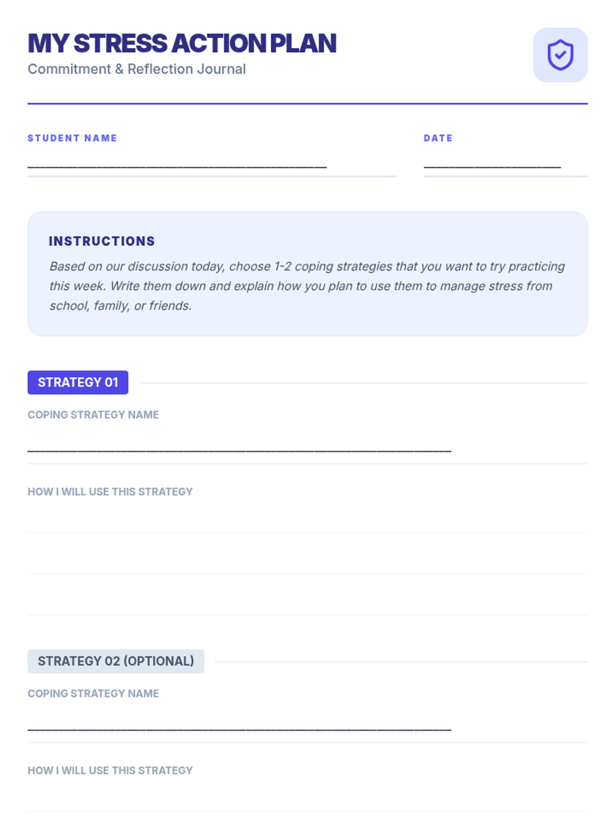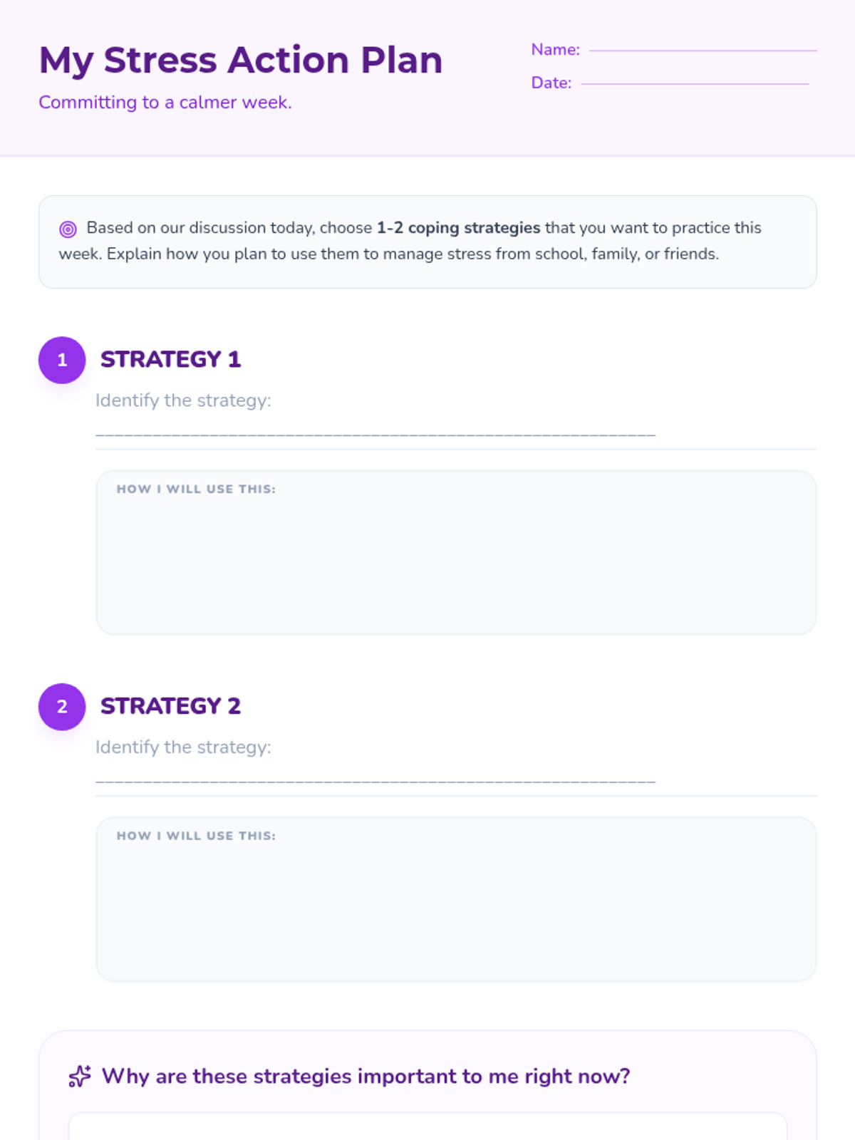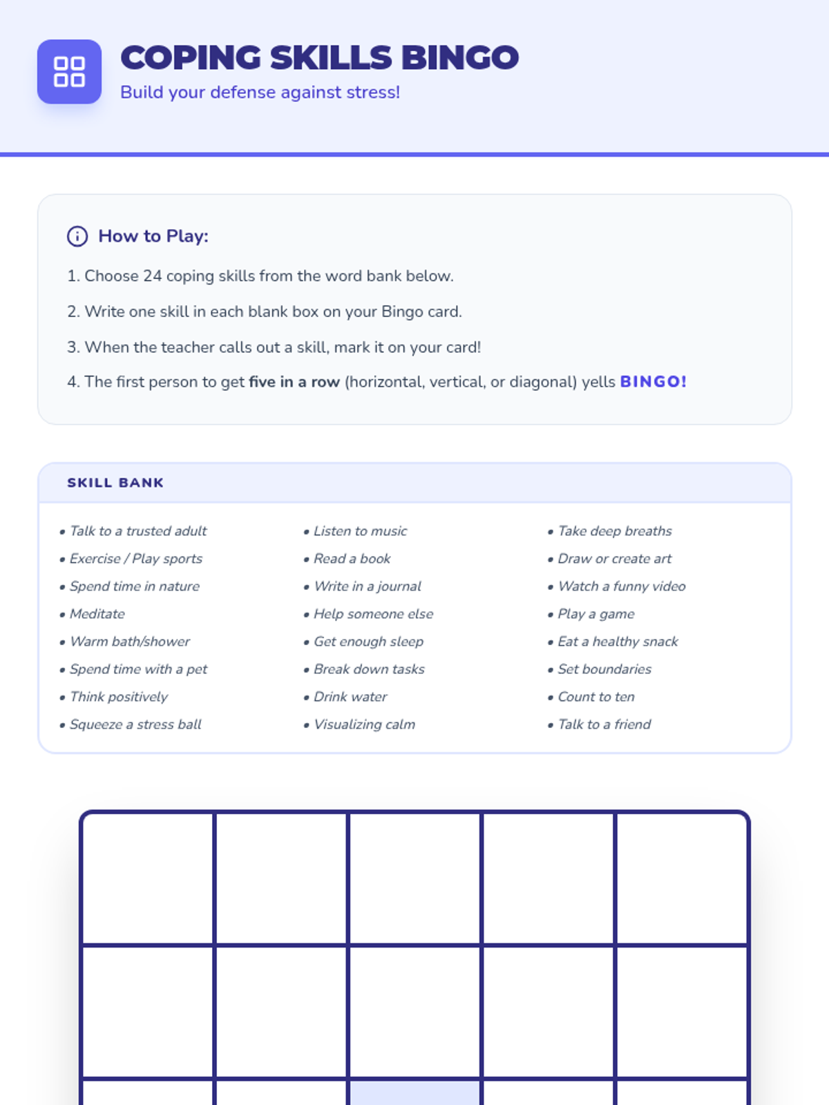 A 4-week small group counseling unit for middle school students focused on identifying stressors, understanding the physiological response to stress, and building a versatile toolkit of coping strategies. Aligned with ASCA Mindsets & Behaviors for student success.