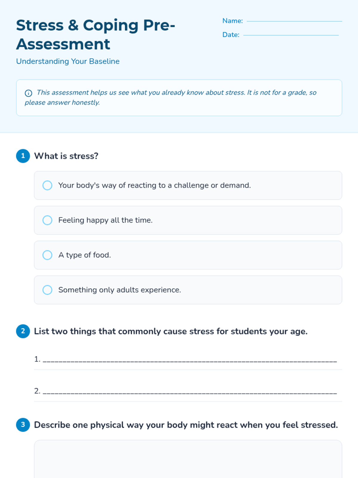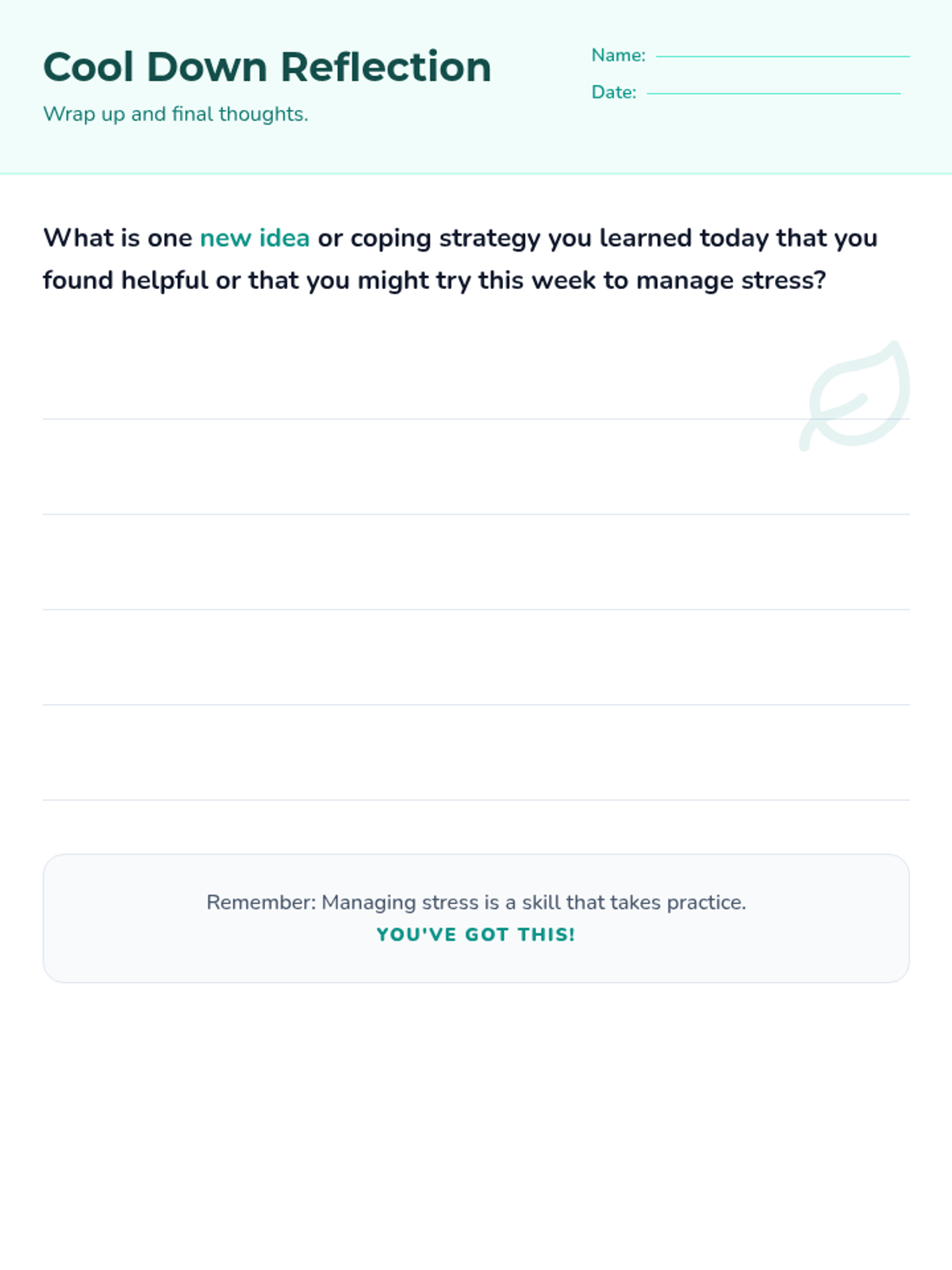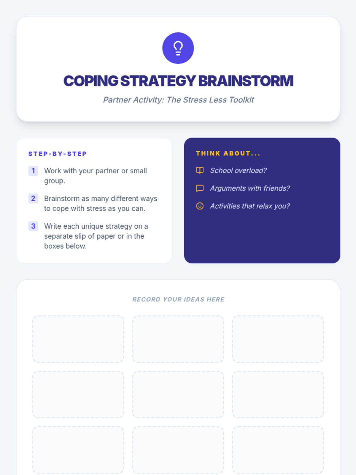 A 4-week small group counseling unit for middle school students focused on identifying stressors, understanding the physiological response to stress, and building a versatile toolkit of coping strategies. Aligned with ASCA Mindsets & Behaviors for student success.