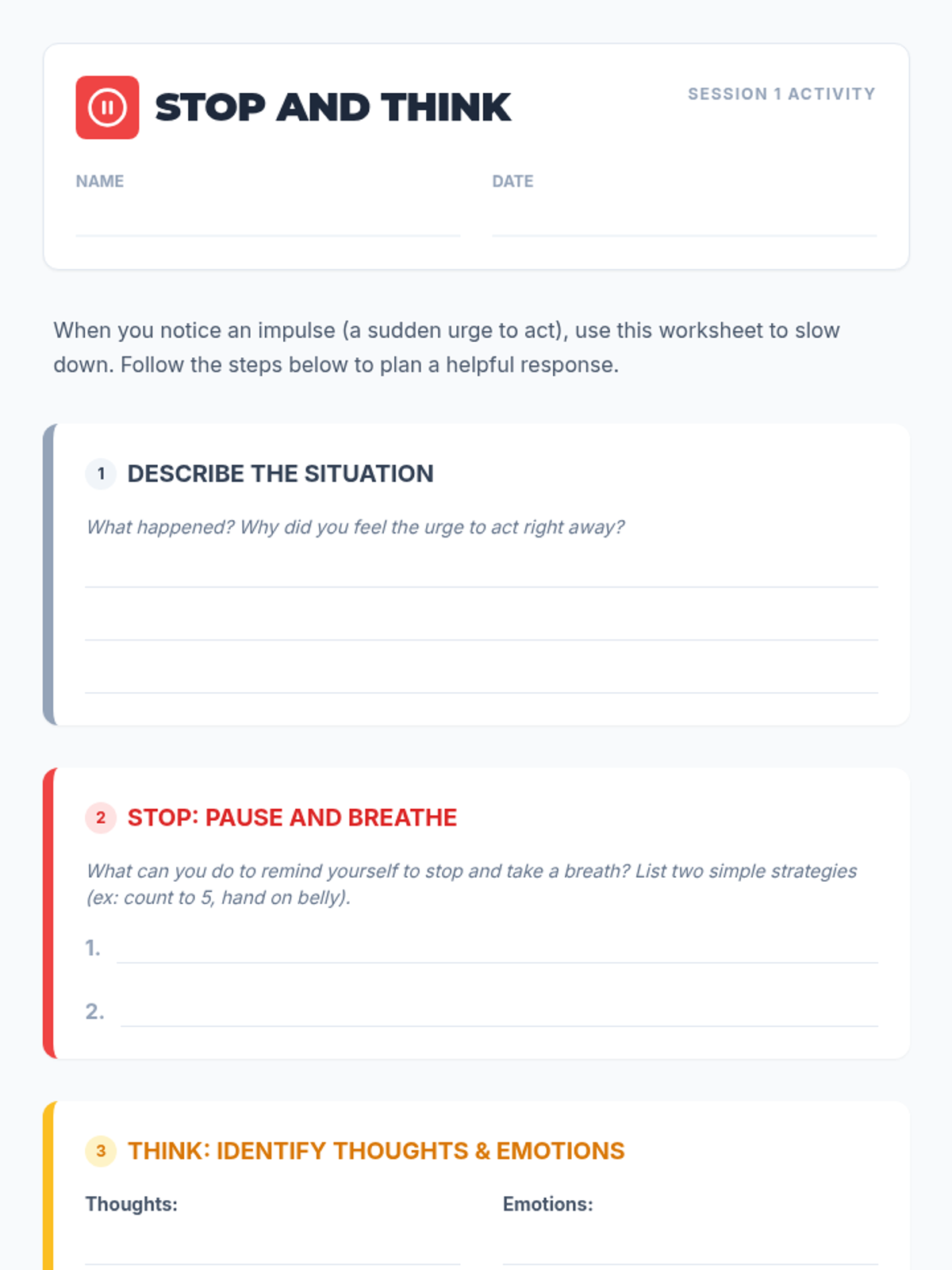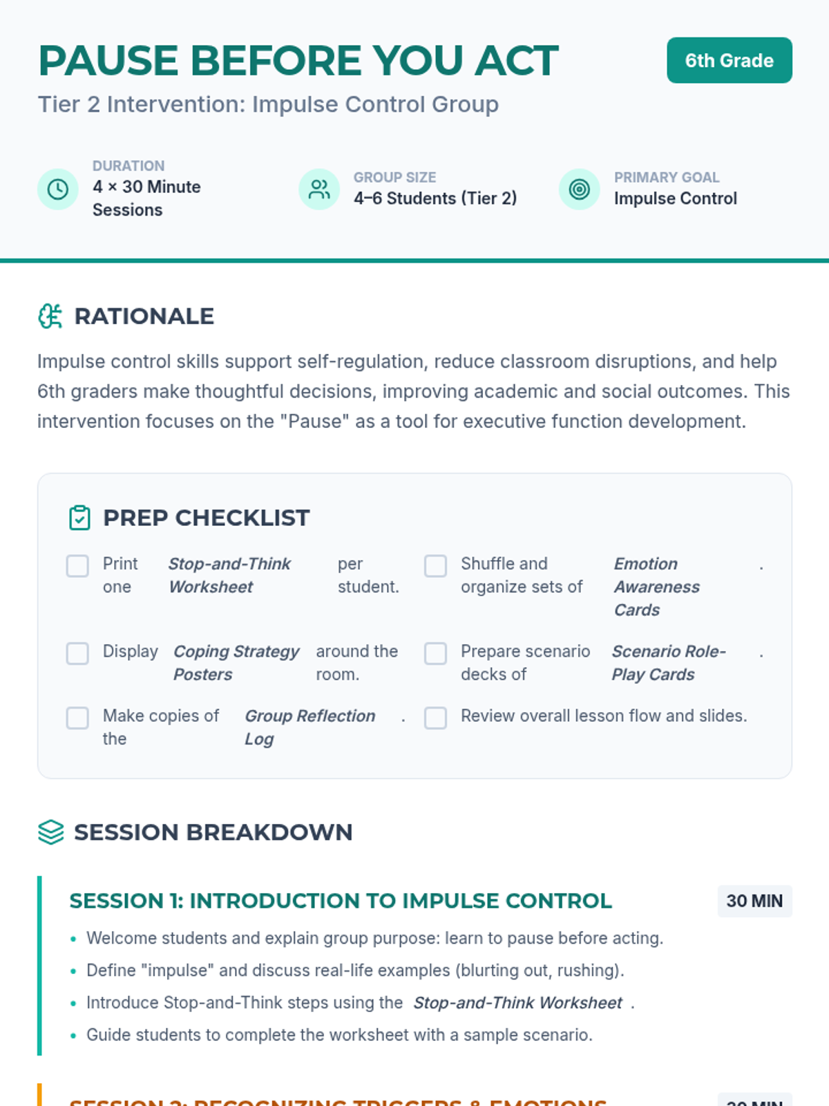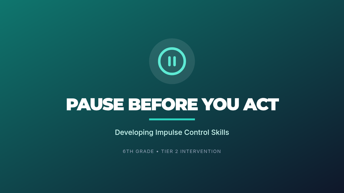 A 4-session Tier 2 intervention designed for 6th graders to improve impulse control. Students learn to recognize emotional triggers, practice 'stop-and-think' techniques, and build a personalized toolkit of coping strategies for real-world application.