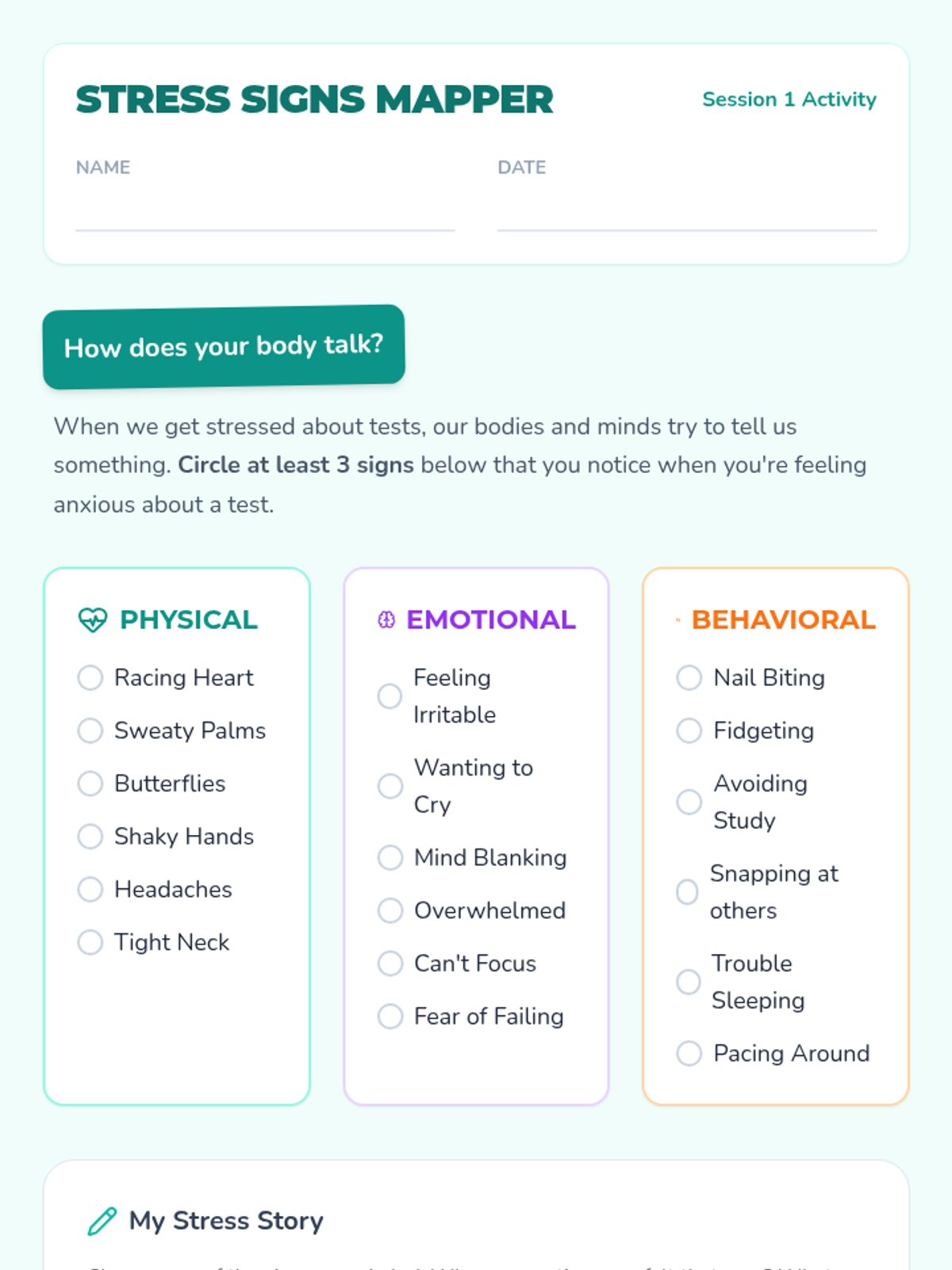 A two-part series for middle school students to develop self-regulation and impulse control by identifying physical body signals and building a personal toolkit of coping strategies and sensory breaks.