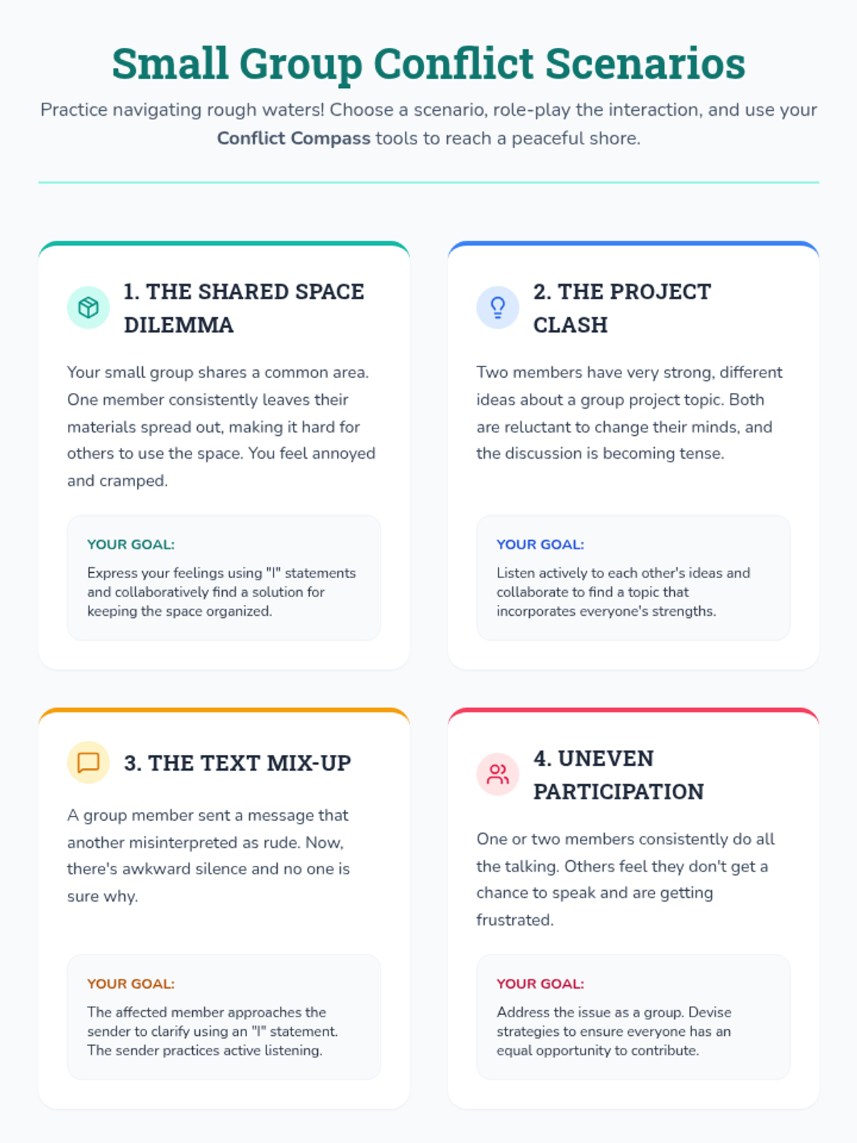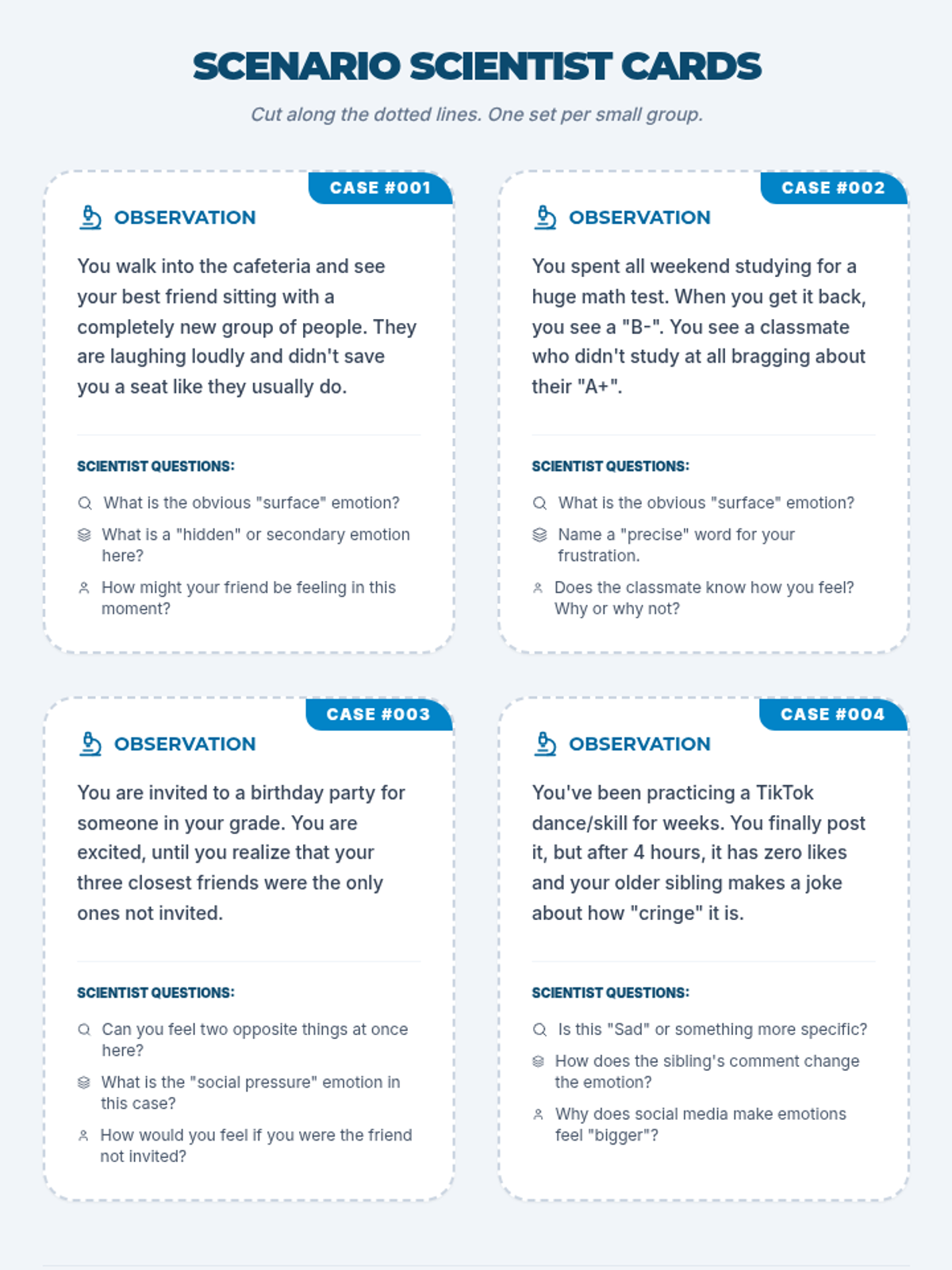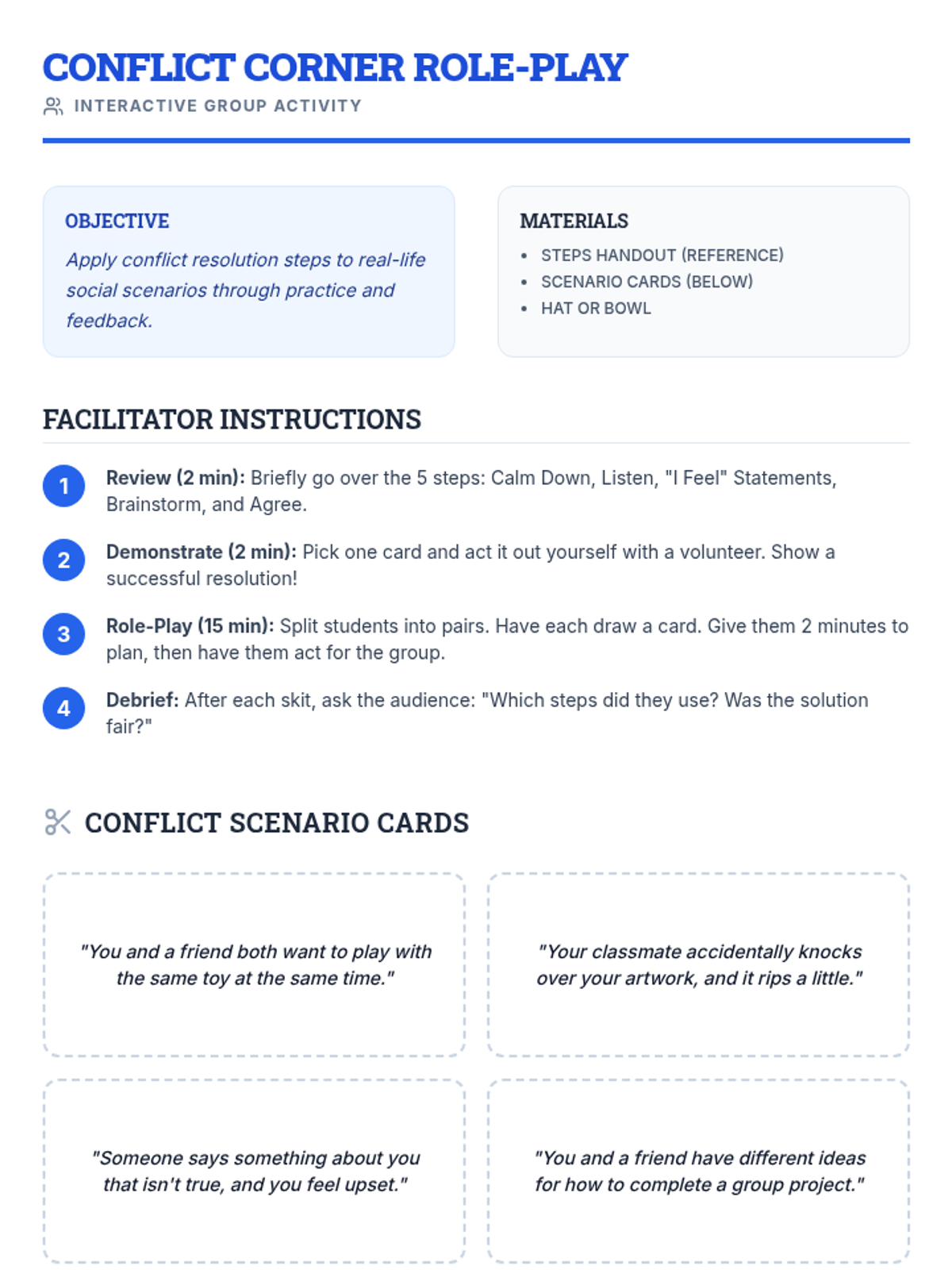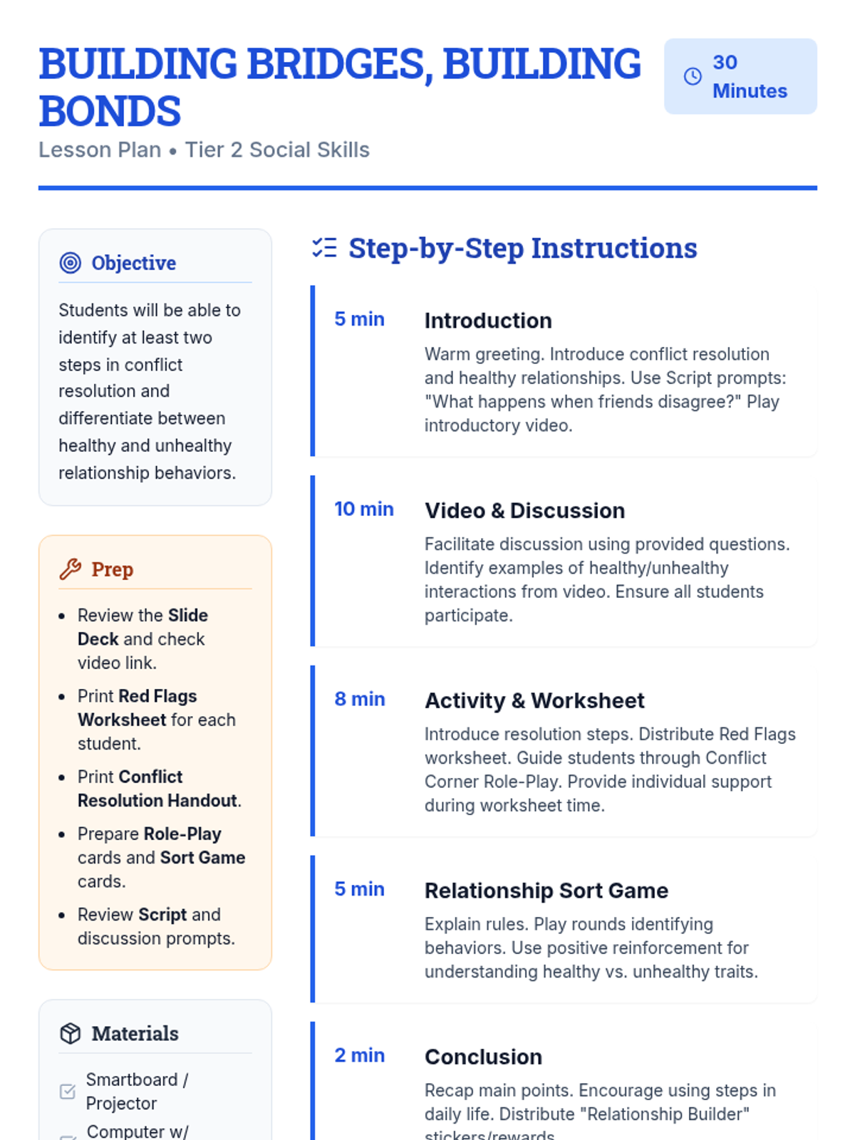A 5-session social-emotional learning sequence designed for middle school students in Tier 2 groups. This unit covers conflict resolution, cognitive flexibility, emotional regulation, perspective taking, and growth mindset through interactive games, role-plays, and structured discussions.
