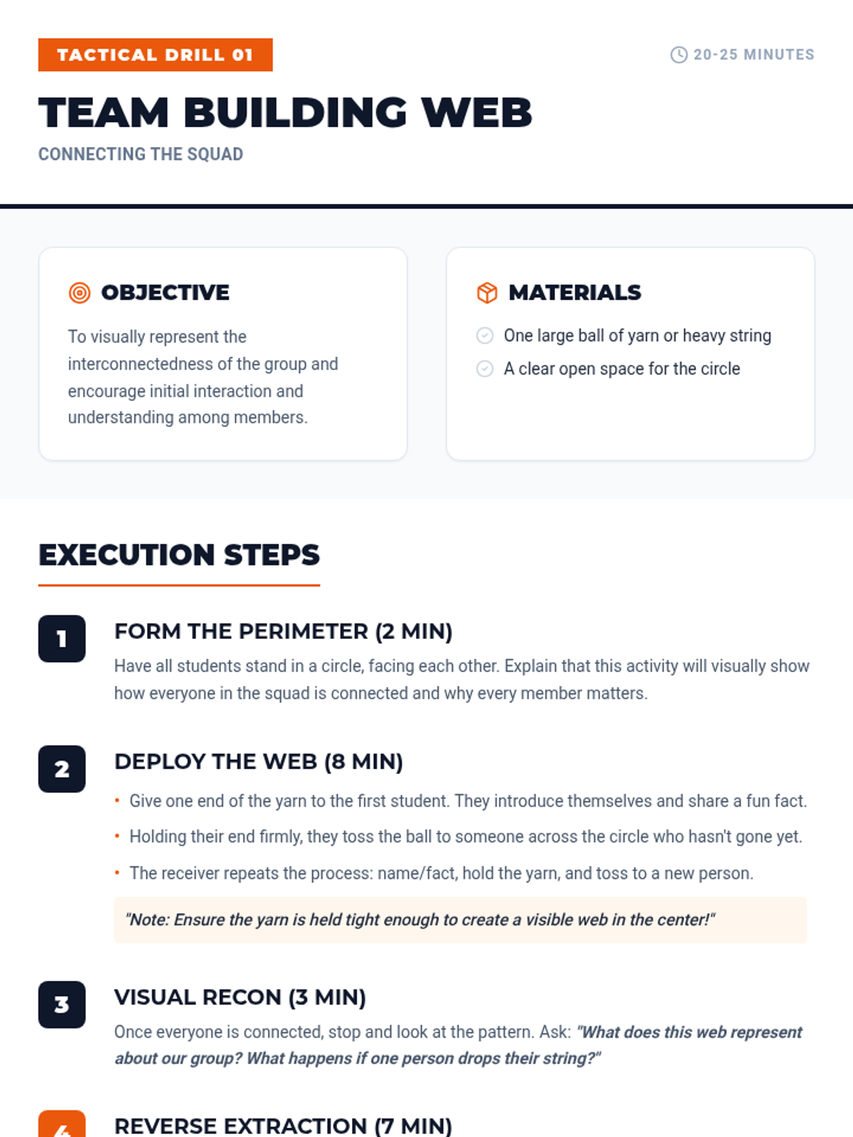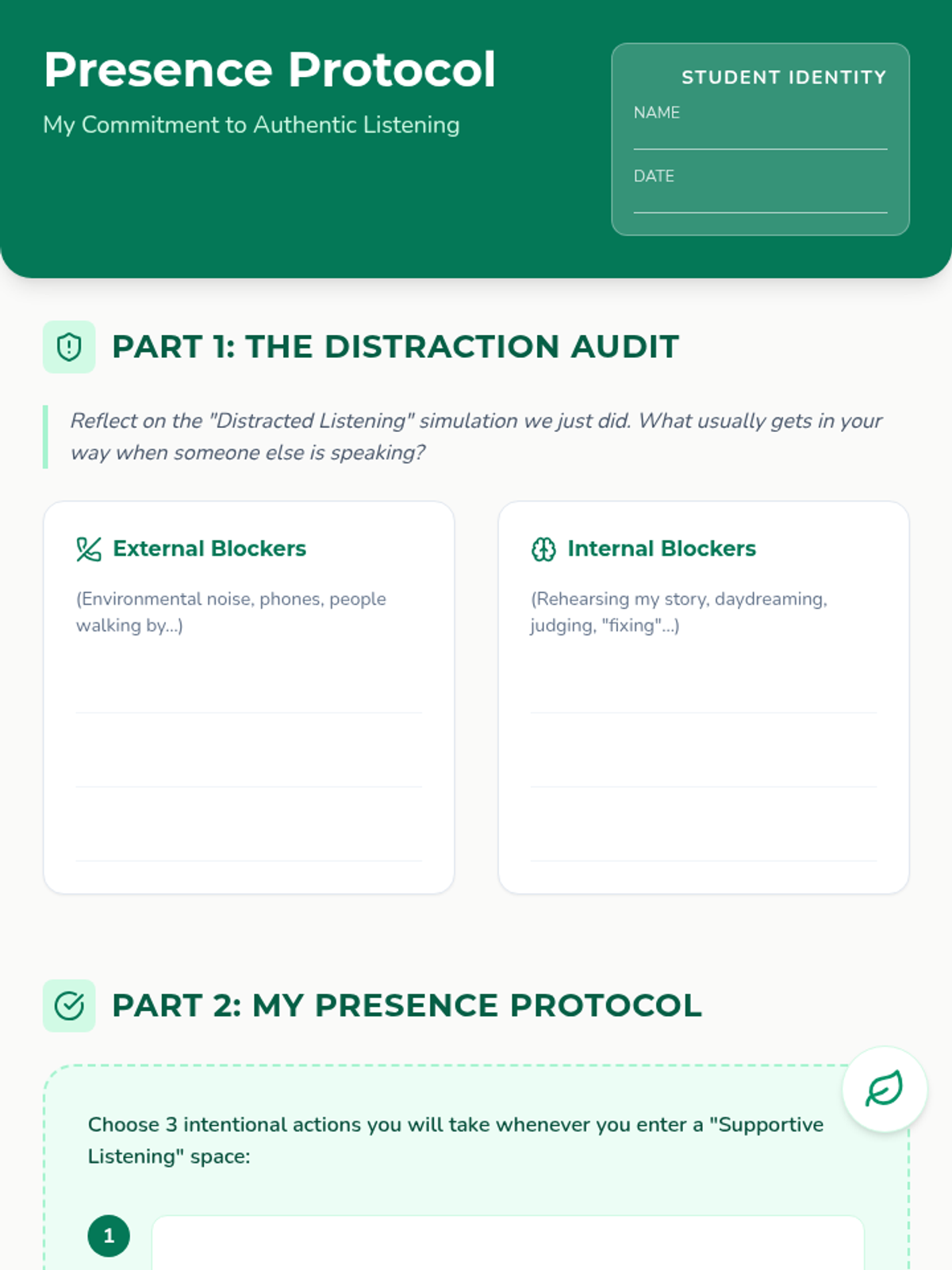 This sequence focuses on interpersonal skills to establish trust and psychological safety. Students master active listening, non-verbal cues, empathy, and conflict resolution, culminating in a community circle.