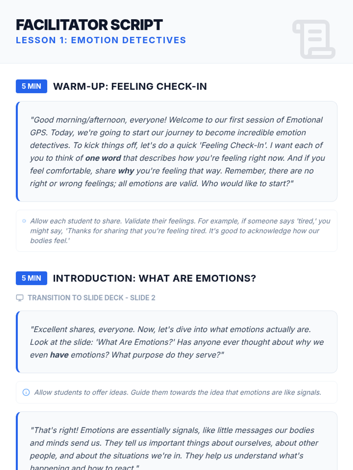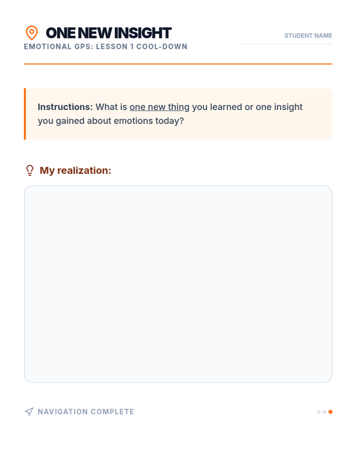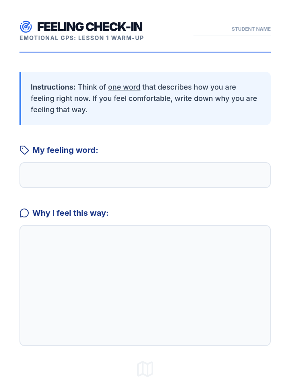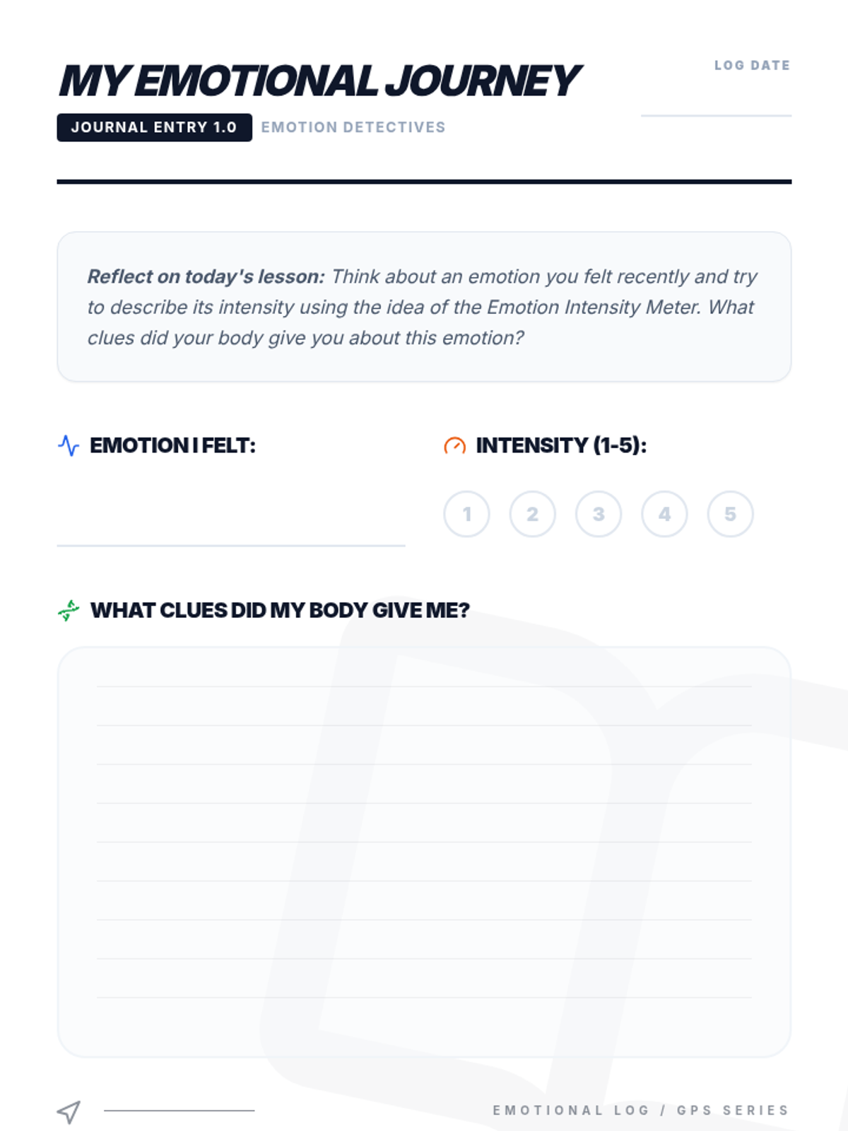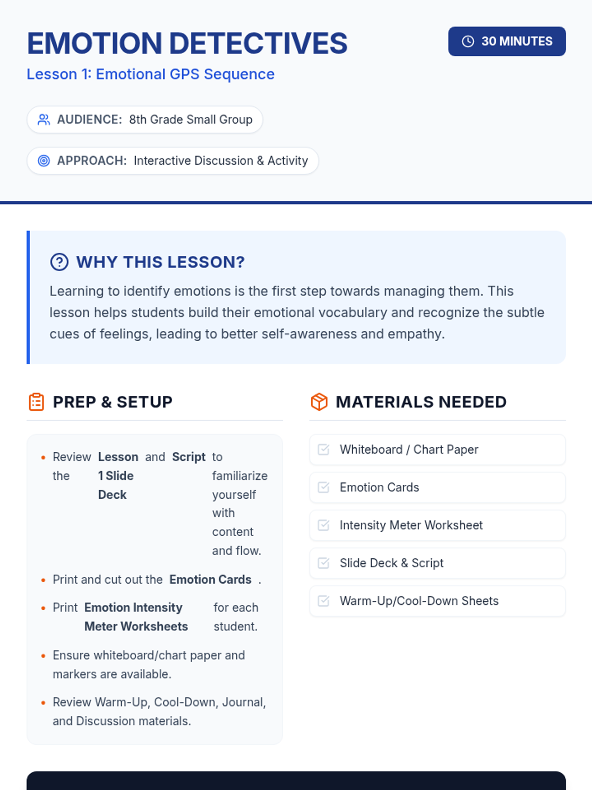 A six-session Tier 2 small group intervention for 8th graders designed to improve emotional intelligence, self-awareness, and regulation. Using a navigational 'GPS' theme, students learn to identify internal signals, decode physical sensations, and manage emotional intensity through practical, evidence-based strategies.
