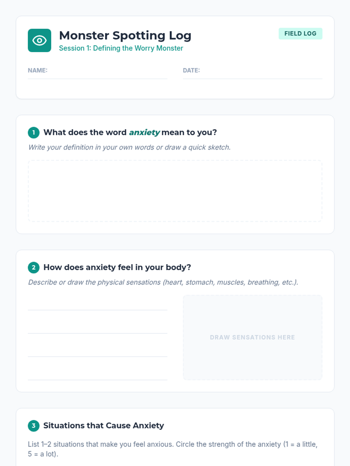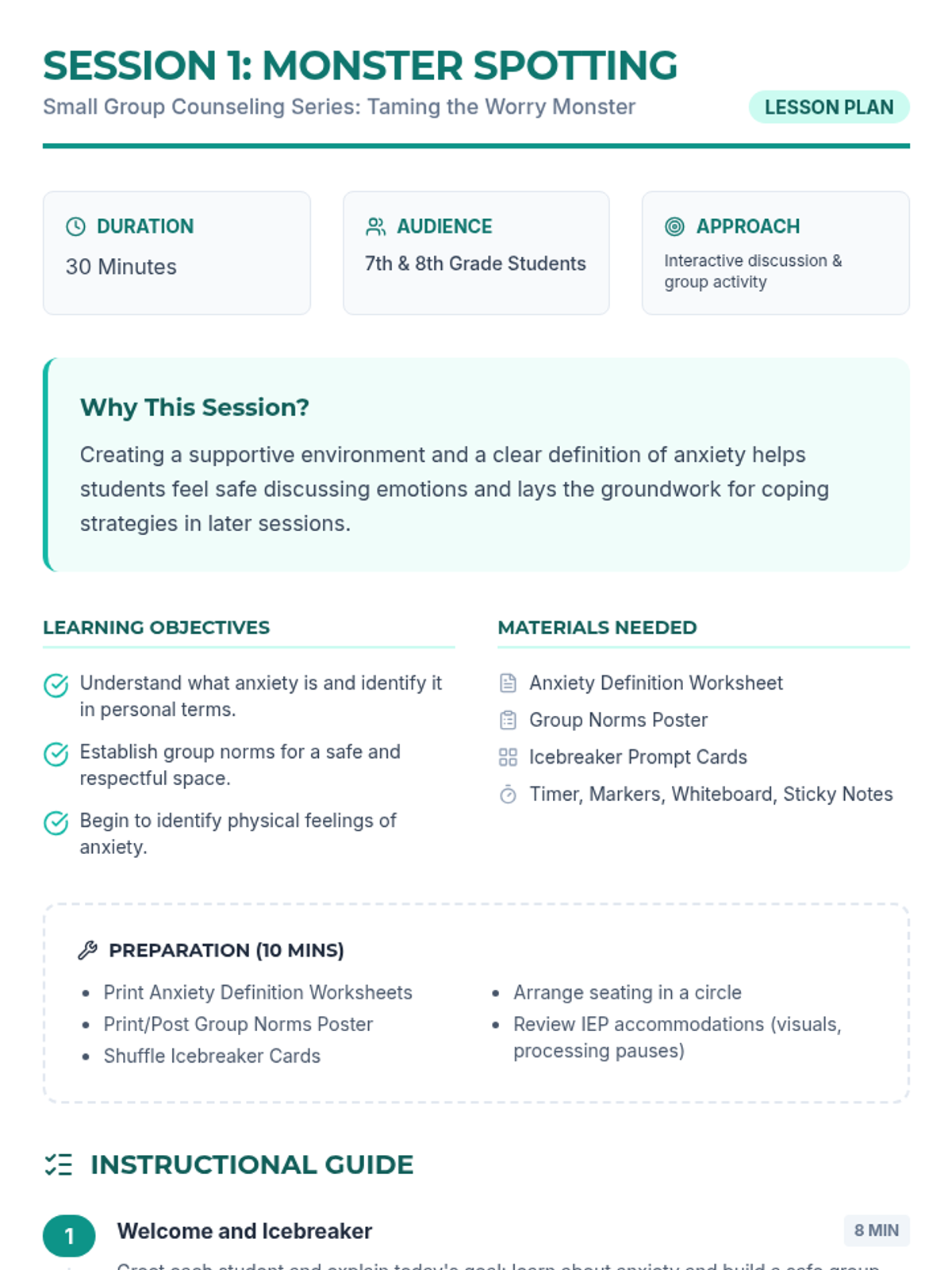 A 5-session small-group series for 7th and 8th graders to explore anxiety, develop coping strategies, and build peer support skills. The series uses a "Worry Monster" theme to make abstract concepts concrete and approachable for middle schoolers.