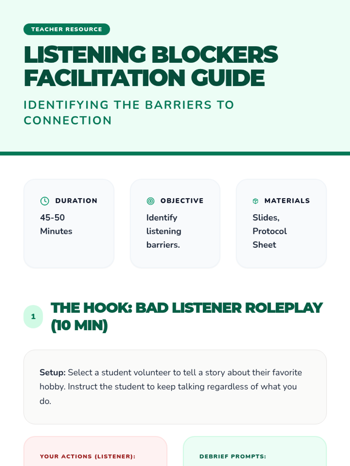 A 5-lesson workshop series for 8th graders to develop active listening, non-verbal communication, reflective paraphrasing, and emotional validation skills to foster a supportive peer environment.