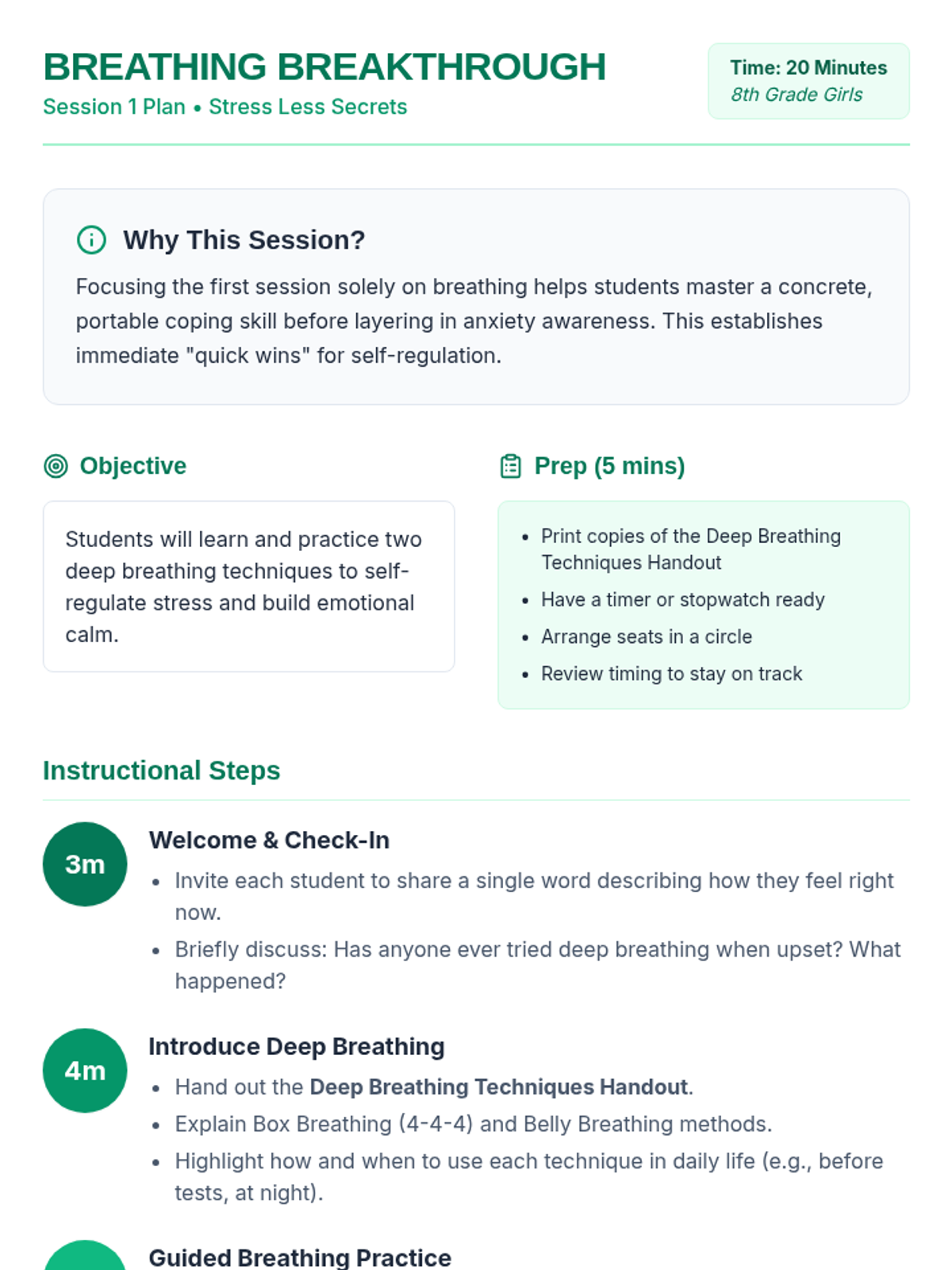 A 6-session Tier 2 small group series for Grade 8 girls focused on mastering anxiety coping skills, emotional regulation, and building resilience through interactive practice and personal projects.