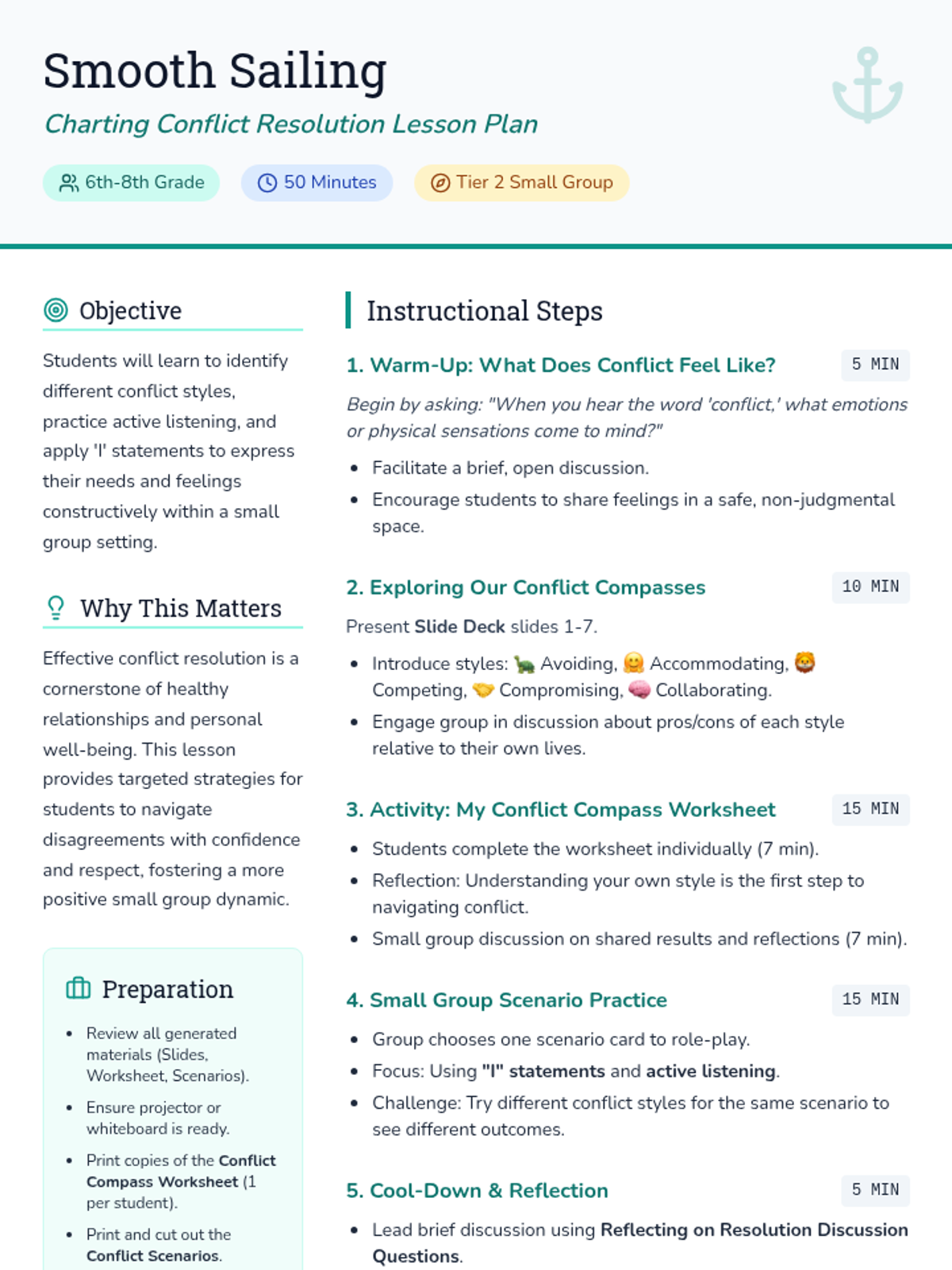 A comprehensive small group social-emotional curriculum for middle schoolers, focusing on conflict resolution, communication, empathy, and coping strategies using a nautical navigation theme.