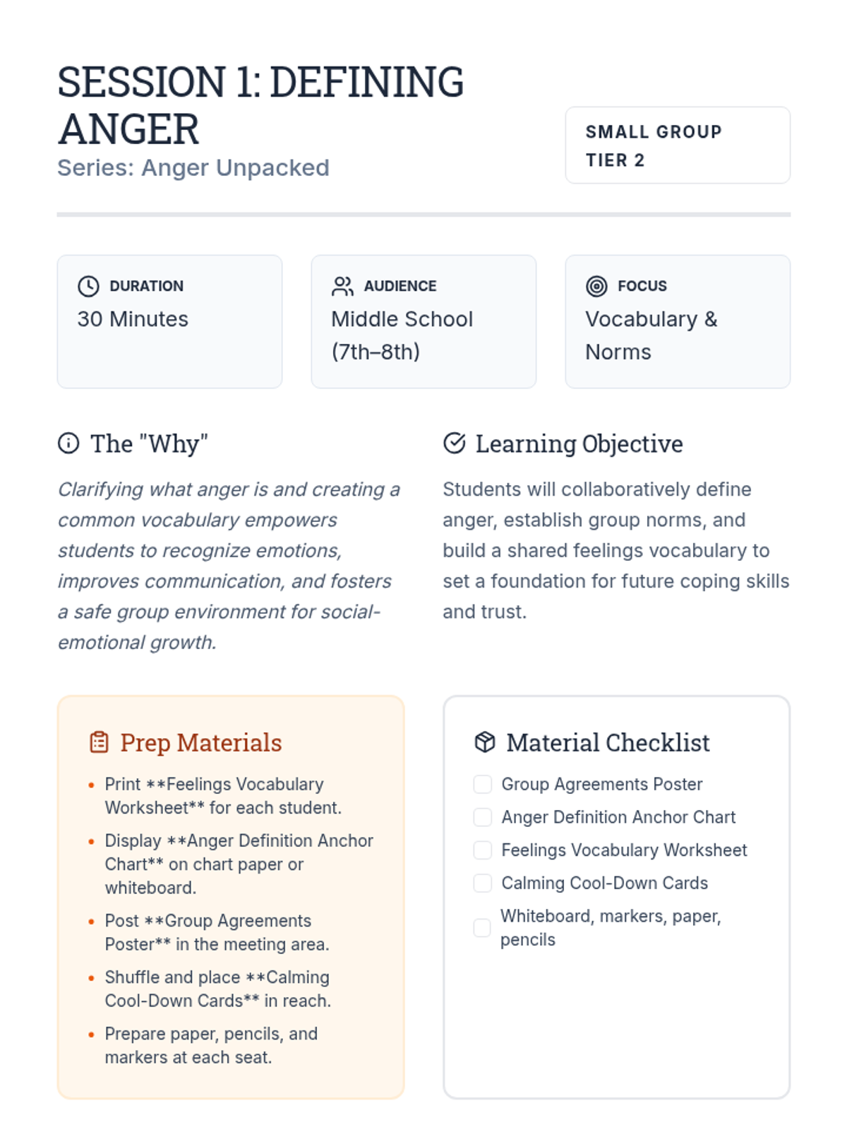 A 5-session small-group series for middle schoolers to explore anger, build emotional vocabulary, identify triggers, and develop personalized coping plans.