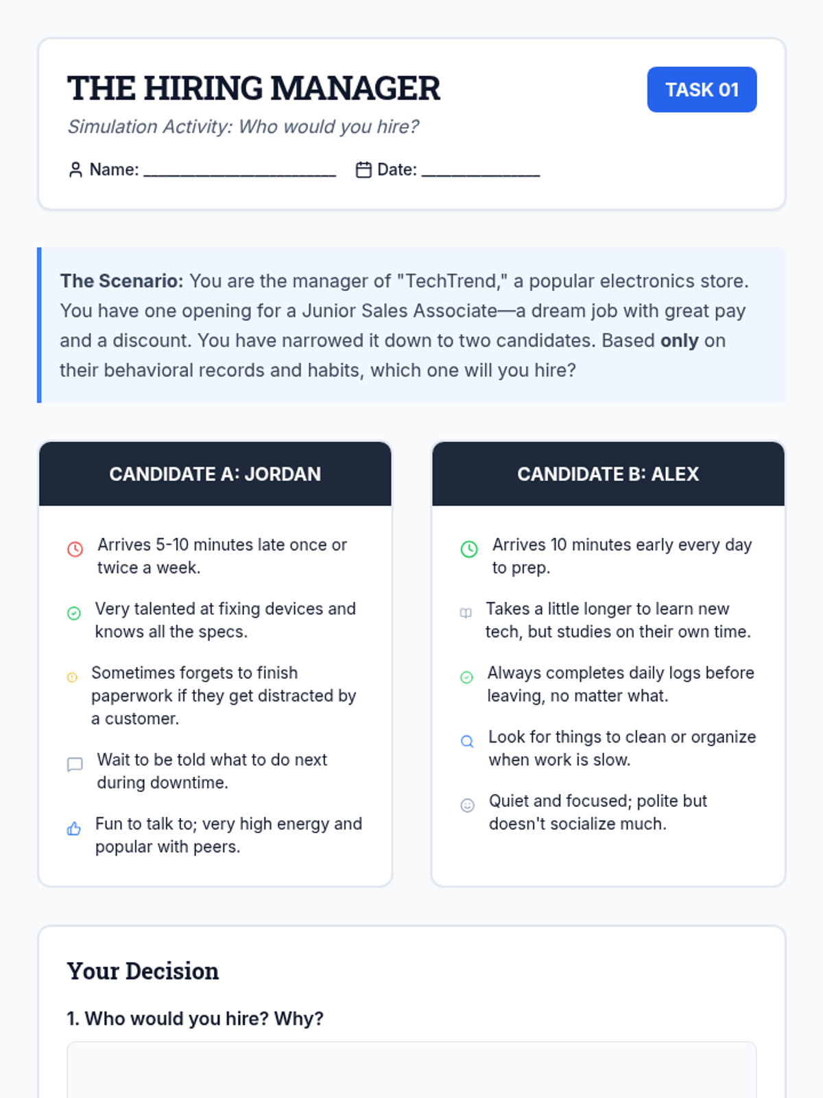 A comprehensive workshop-style unit where 7th-grade students navigate the job-seeking process, from identifying transferable skills and drafting their first resumes to mastering professional etiquette and succeeding in mock interviews. Students will develop tangible professional documents and interpersonal communication skills critical for workforce entry.