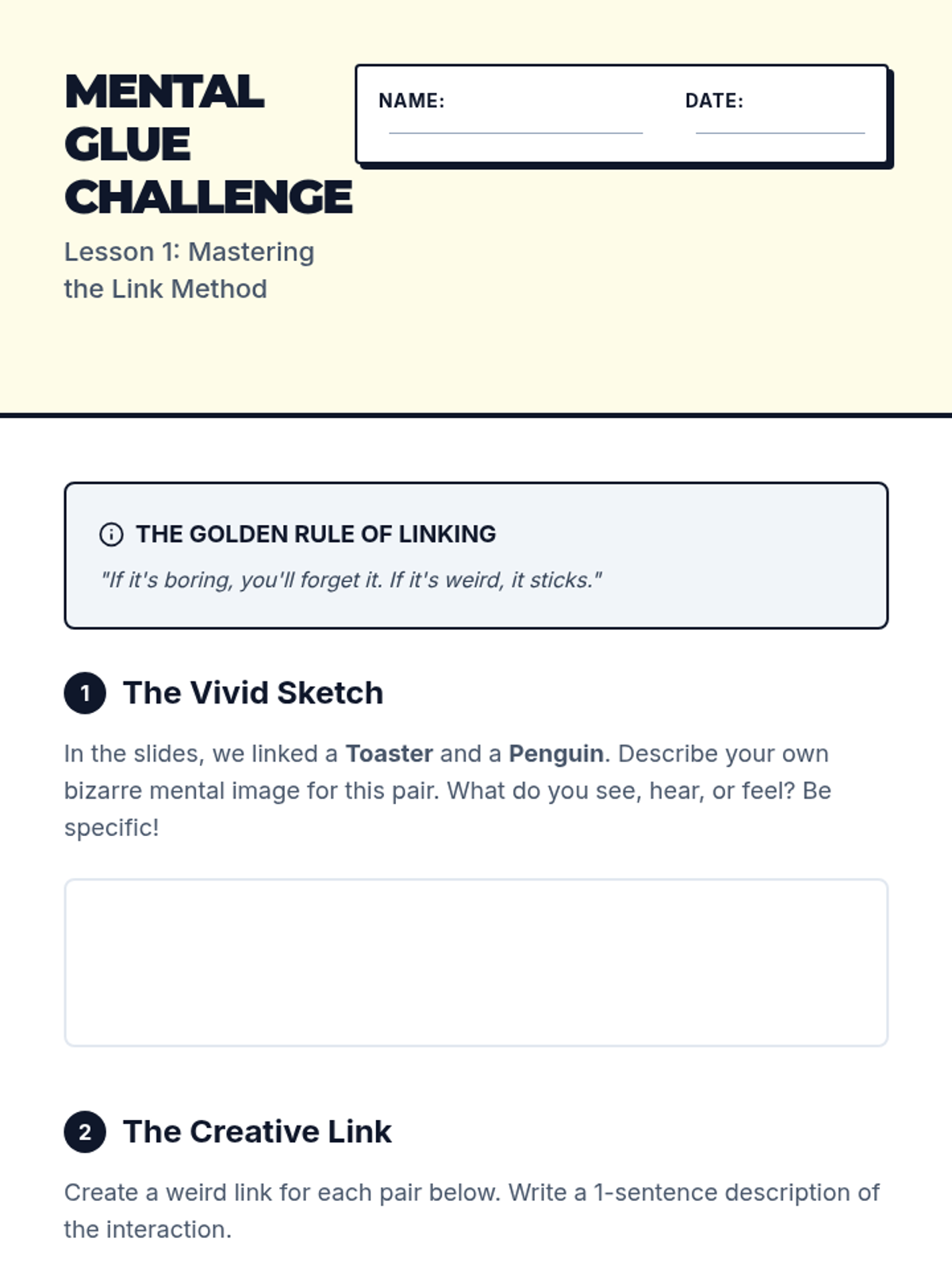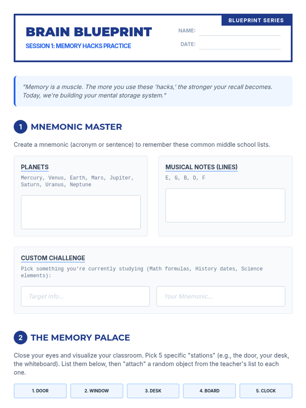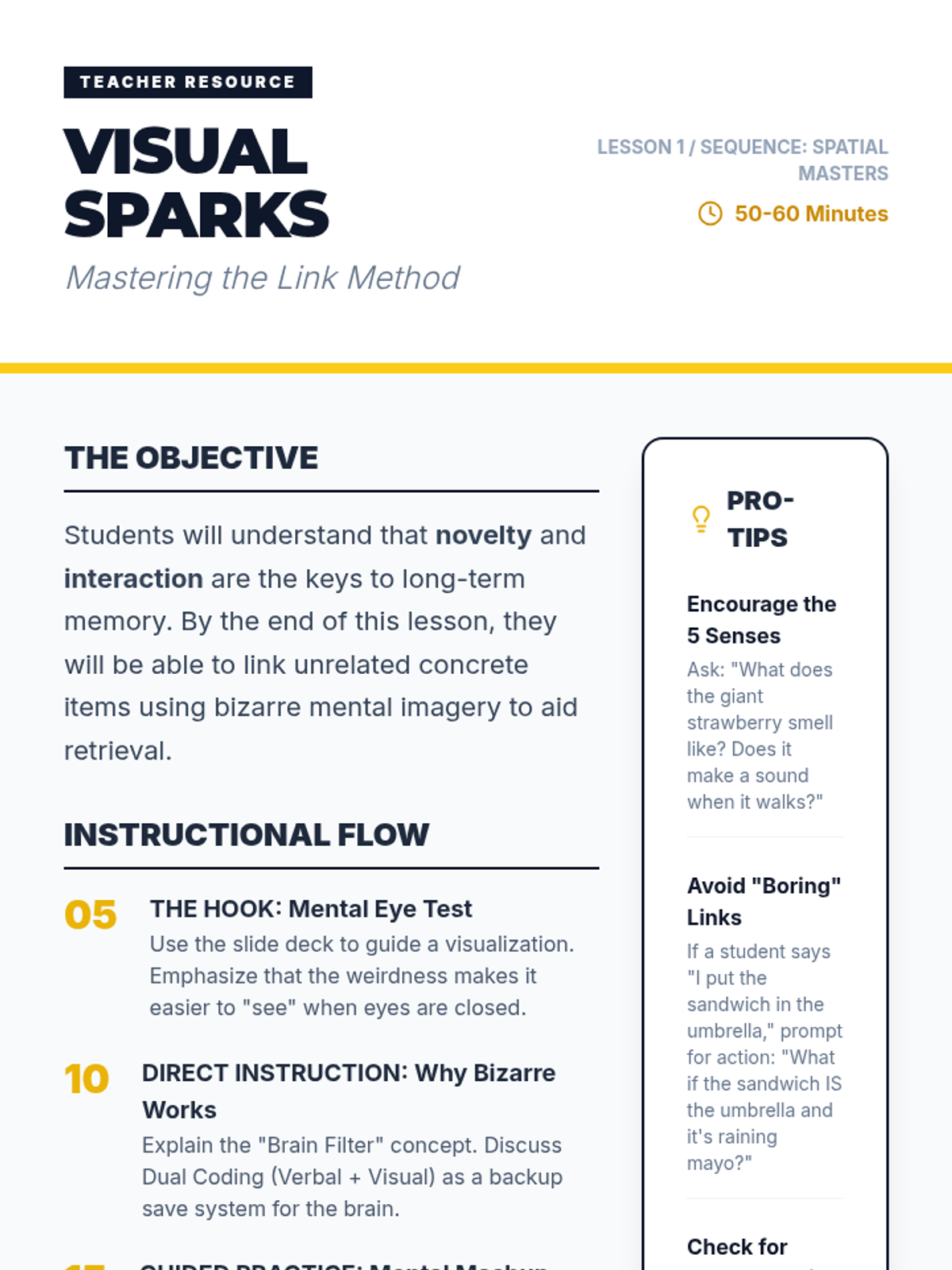 A sequence for 8th-grade students to master visualization and spatial memory techniques, specifically the Method of Loci and Link Method, to enhance working memory and information retrieval.