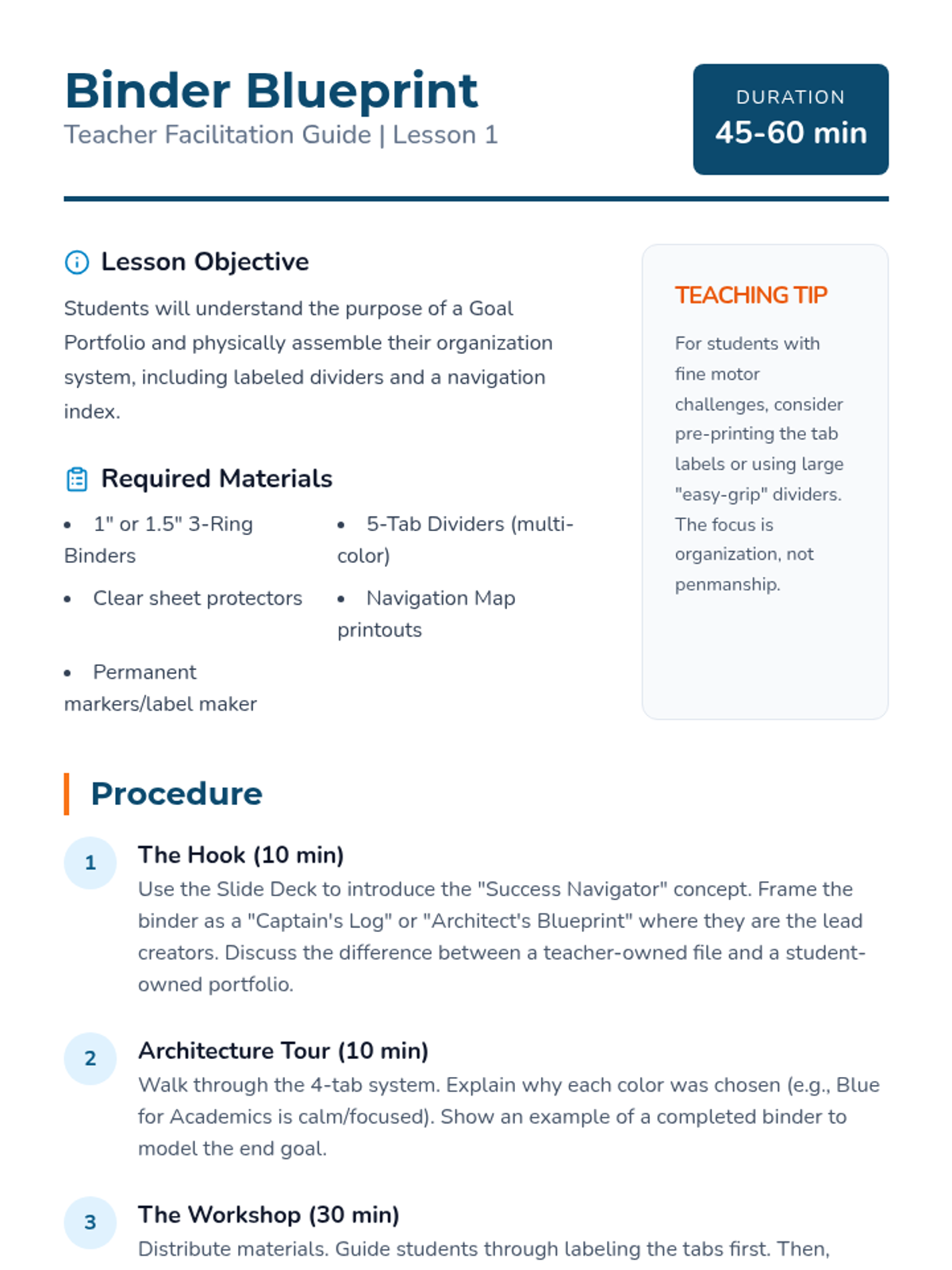 A comprehensive series of tools and sessions designed to empower students with executive functioning strategies. The sequence moves from basic organization to advanced time management and self-regulation techniques.