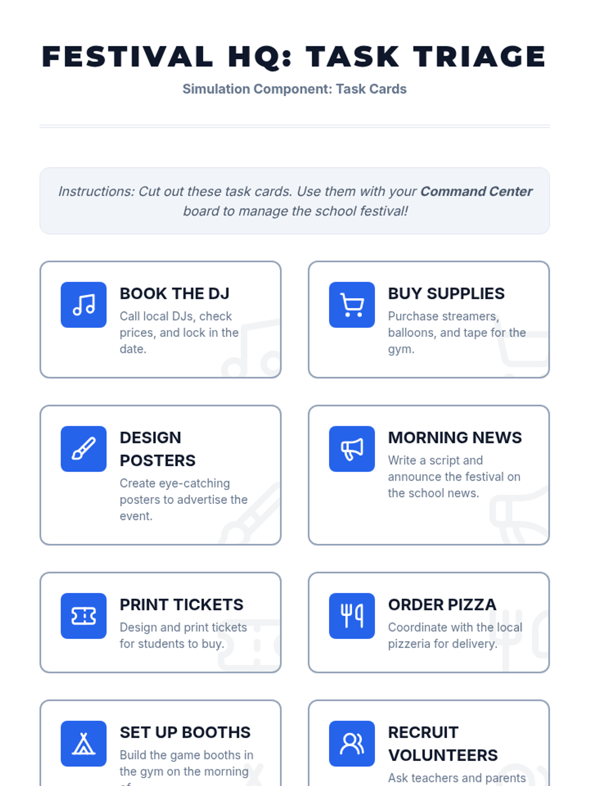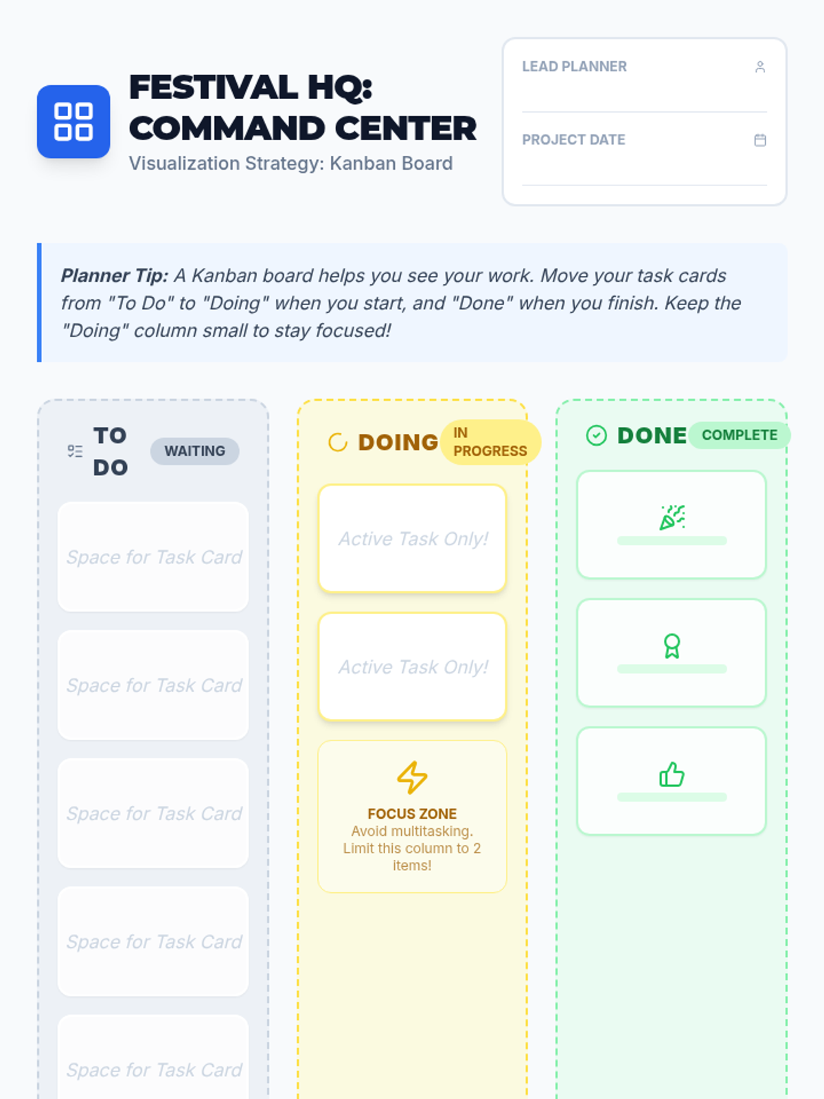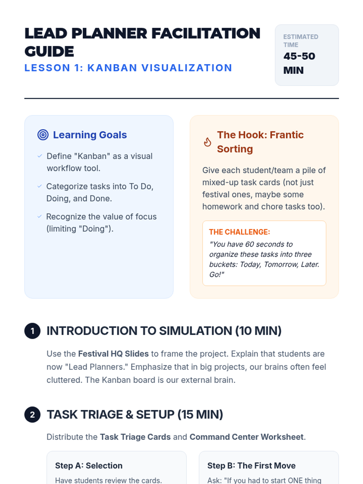 A simulation-based sequence where 6th-grade students act as Event Planners for a school festival to master multi-day project management, workflow visualization, and adaptability.
