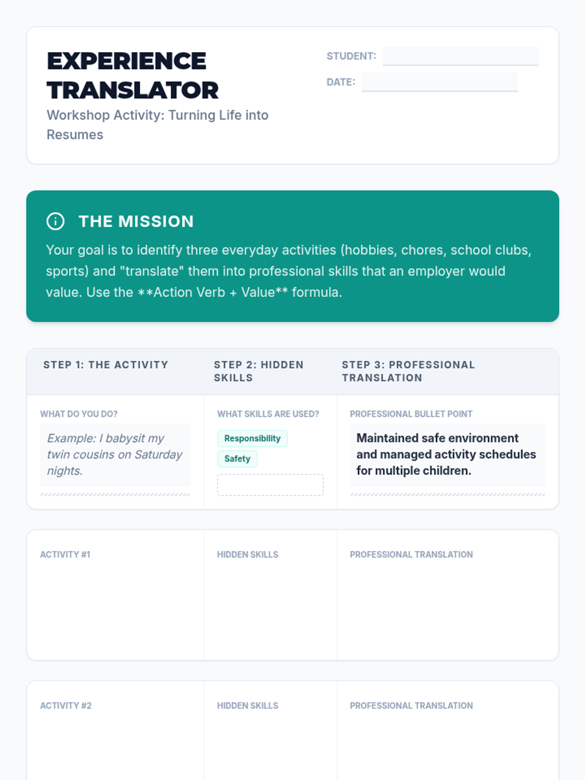 A comprehensive career preparation workshop for 8th graders focusing on translating personal experiences into professional assets. Students develop skills in resume writing, professional communication, and interview techniques through interactive simulations and practical drafting.