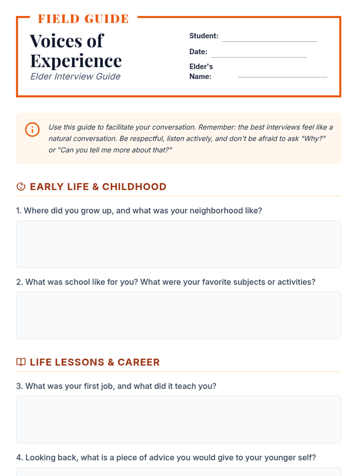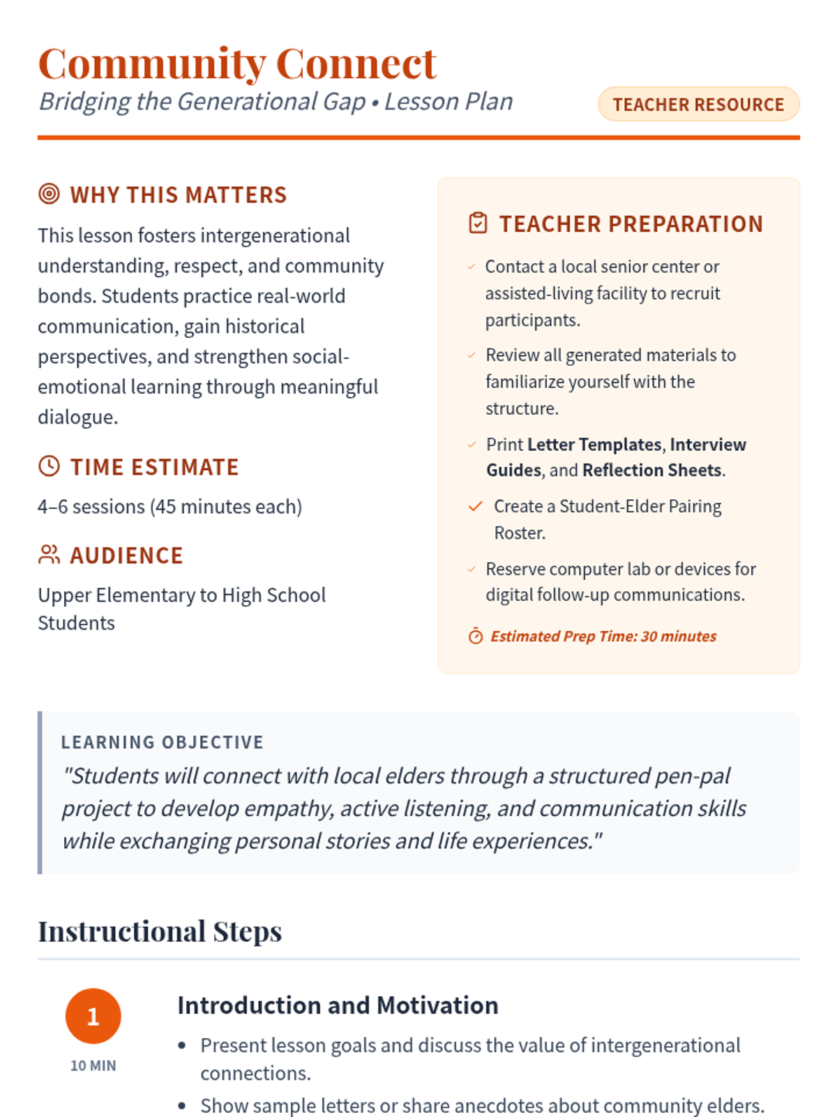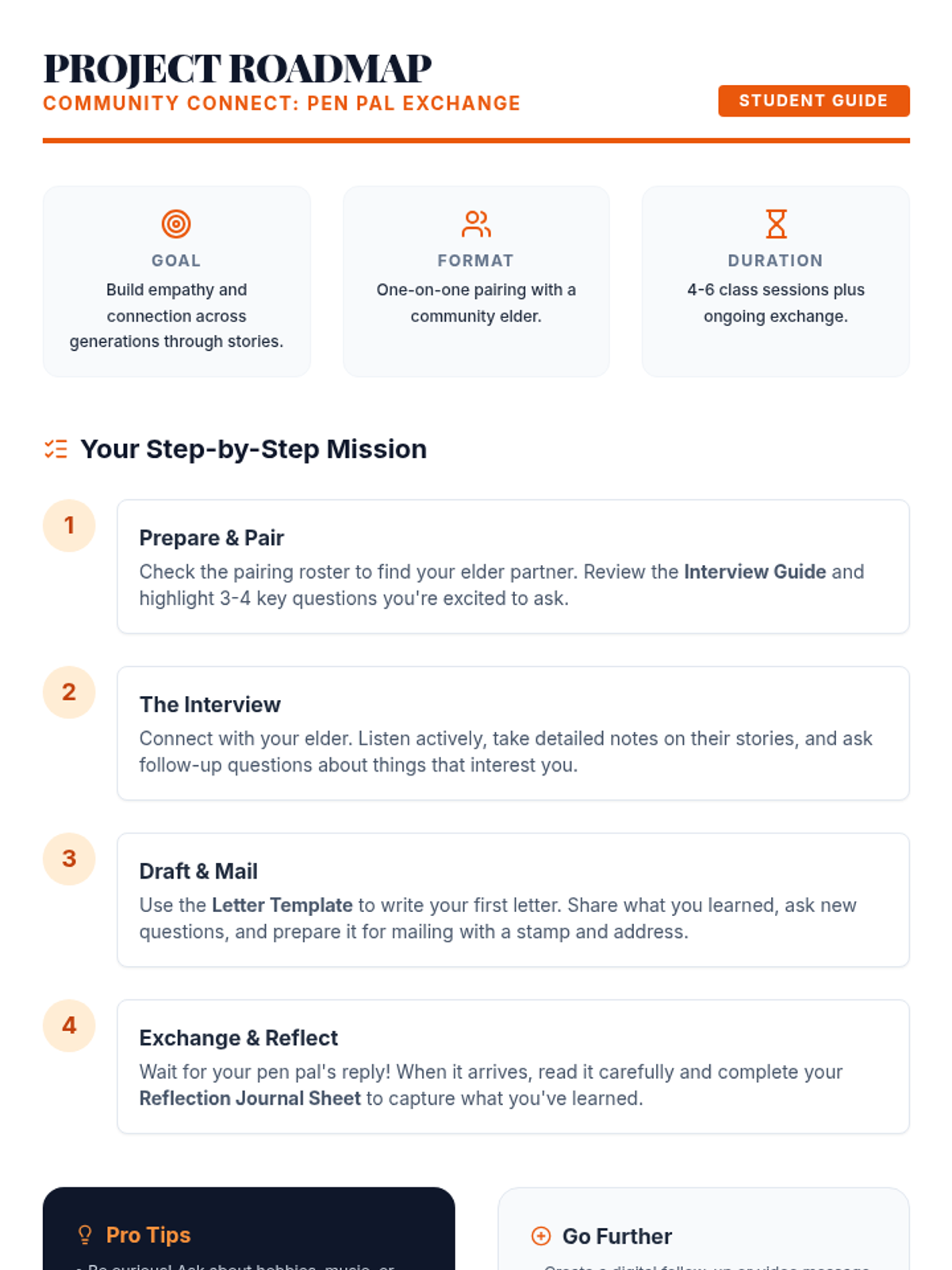 A multi-session project where students connect with local elders through interviews and letter writing, fostering empathy and intergenerational understanding.