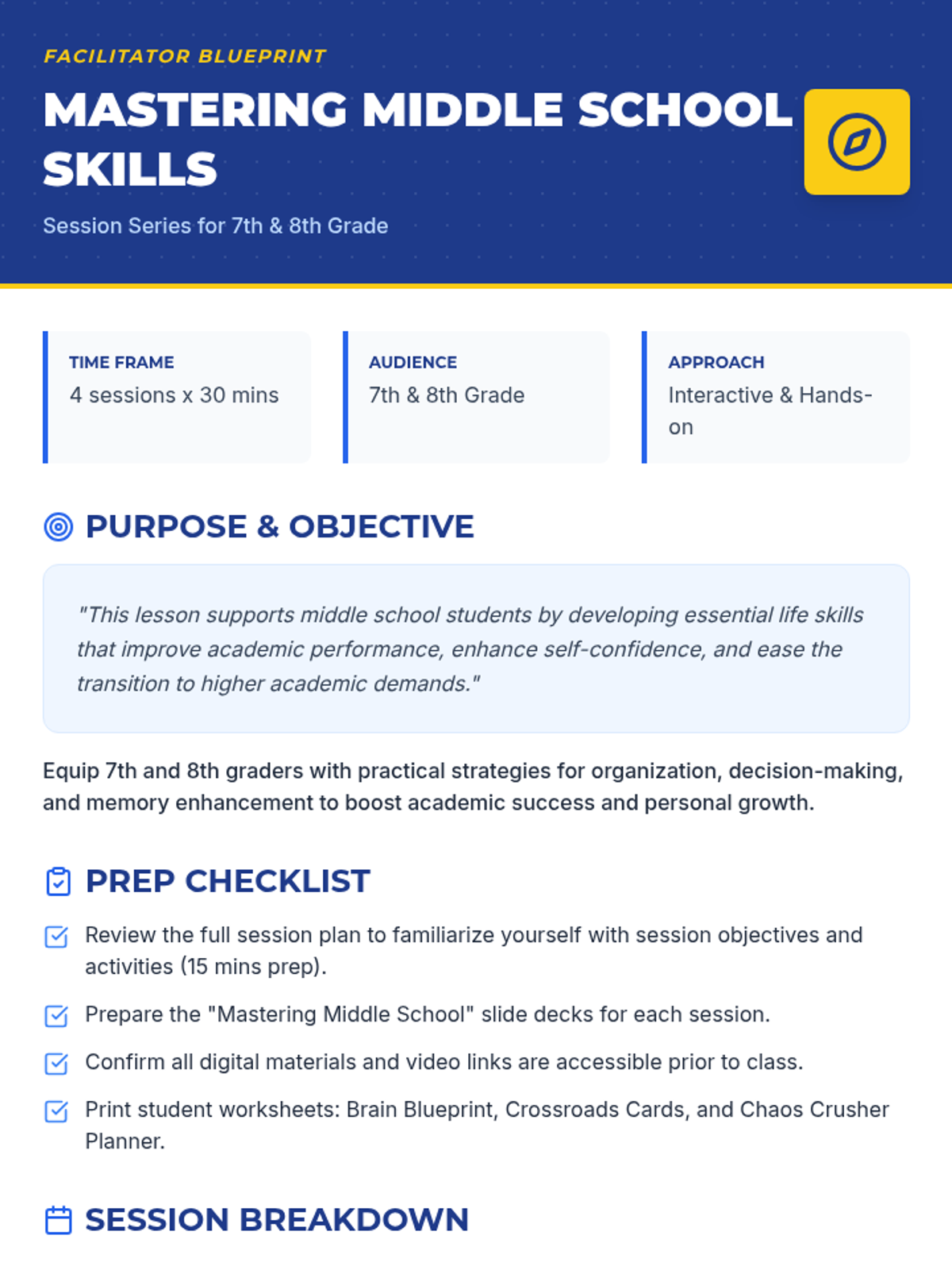 A comprehensive series of 30 micro-counseling sessions (3 per topic) designed for 6th-8th graders. These 10-minute interventions focus on essential middle school transitions, behavioral self-regulation, and academic goal-setting skills.