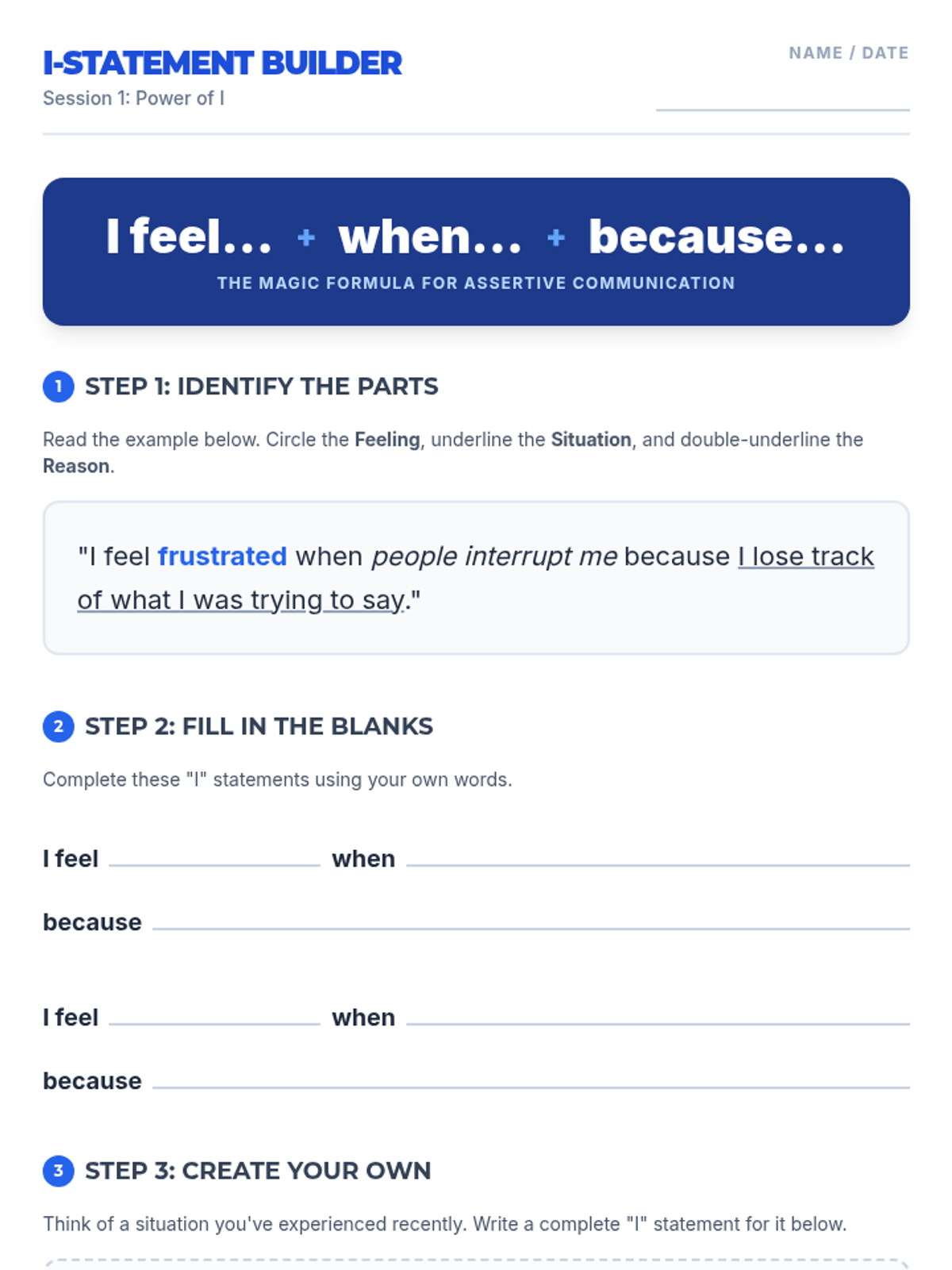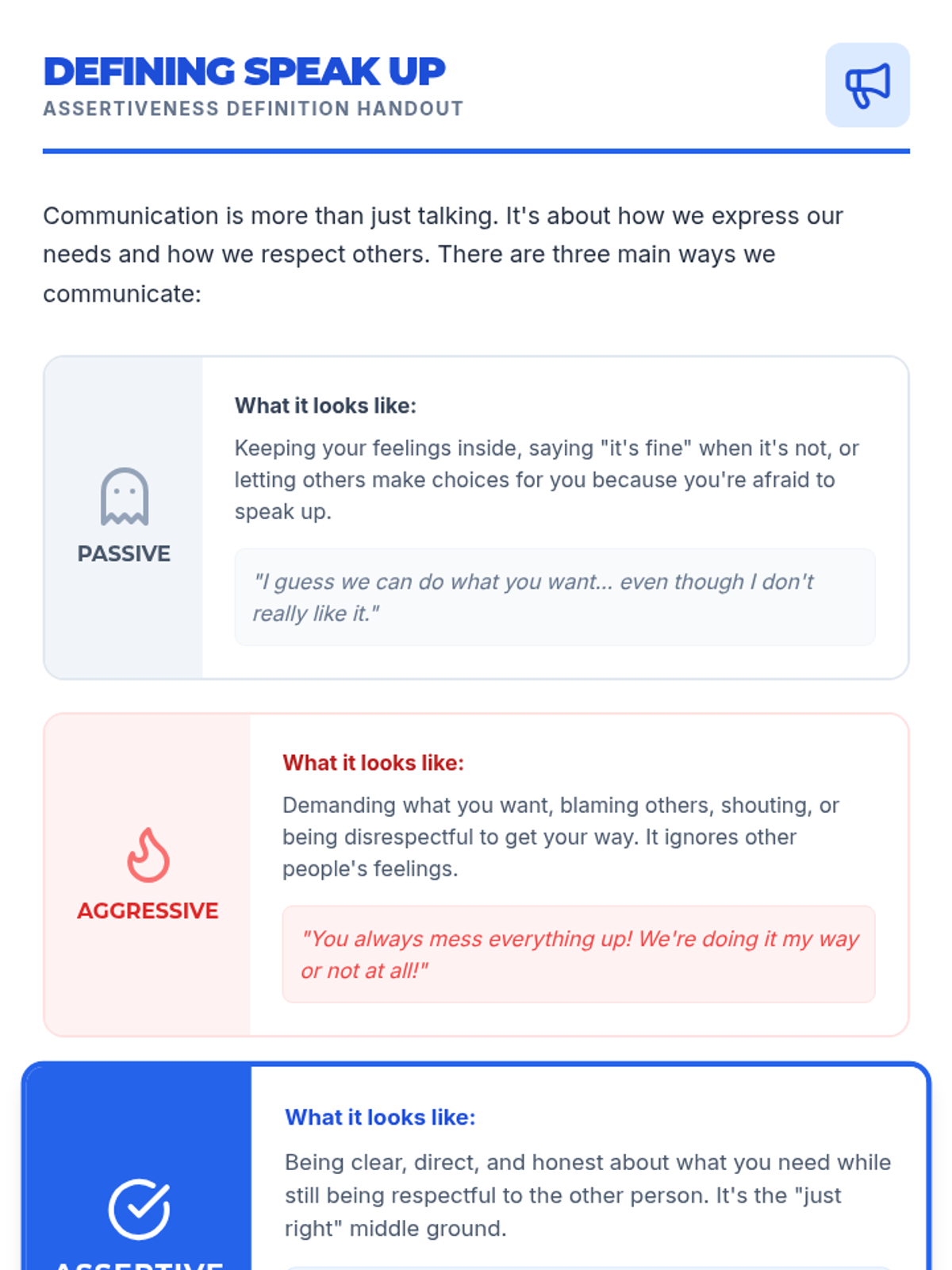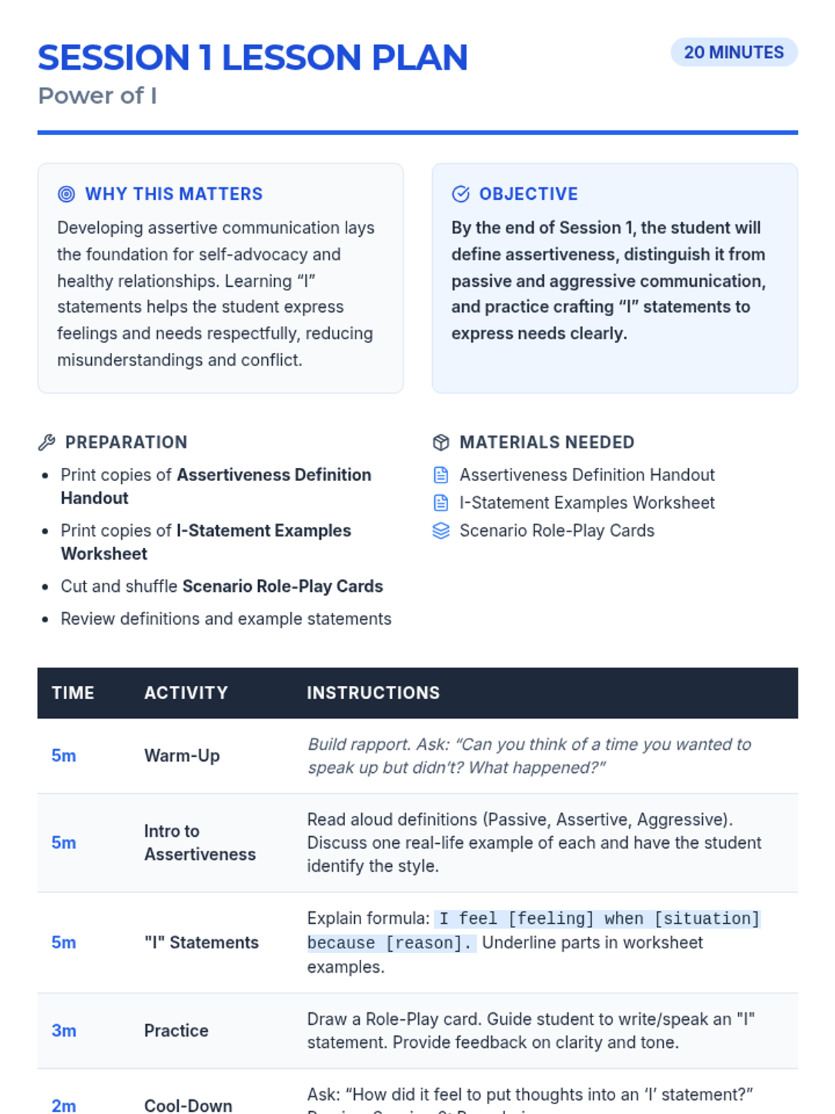 A 5-session intensive for middle school students to develop assertive communication skills, focusing on I-statements, boundaries, refusals, and long-term maintenance.