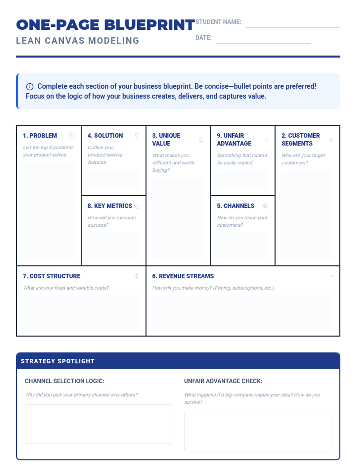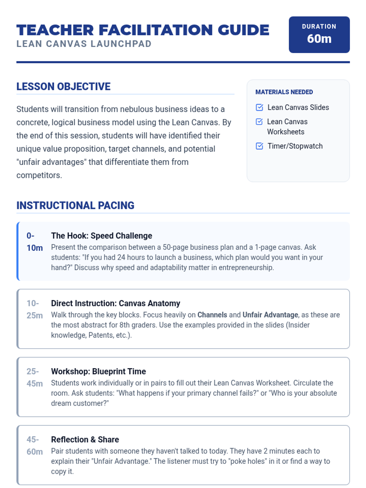 A project-based sequence where 8th-grade students transition from business concepts to tangible models and prototypes. Students use Lean Canvas modeling, financial estimation, and iterative prototyping to validate their ideas before a final pitch.