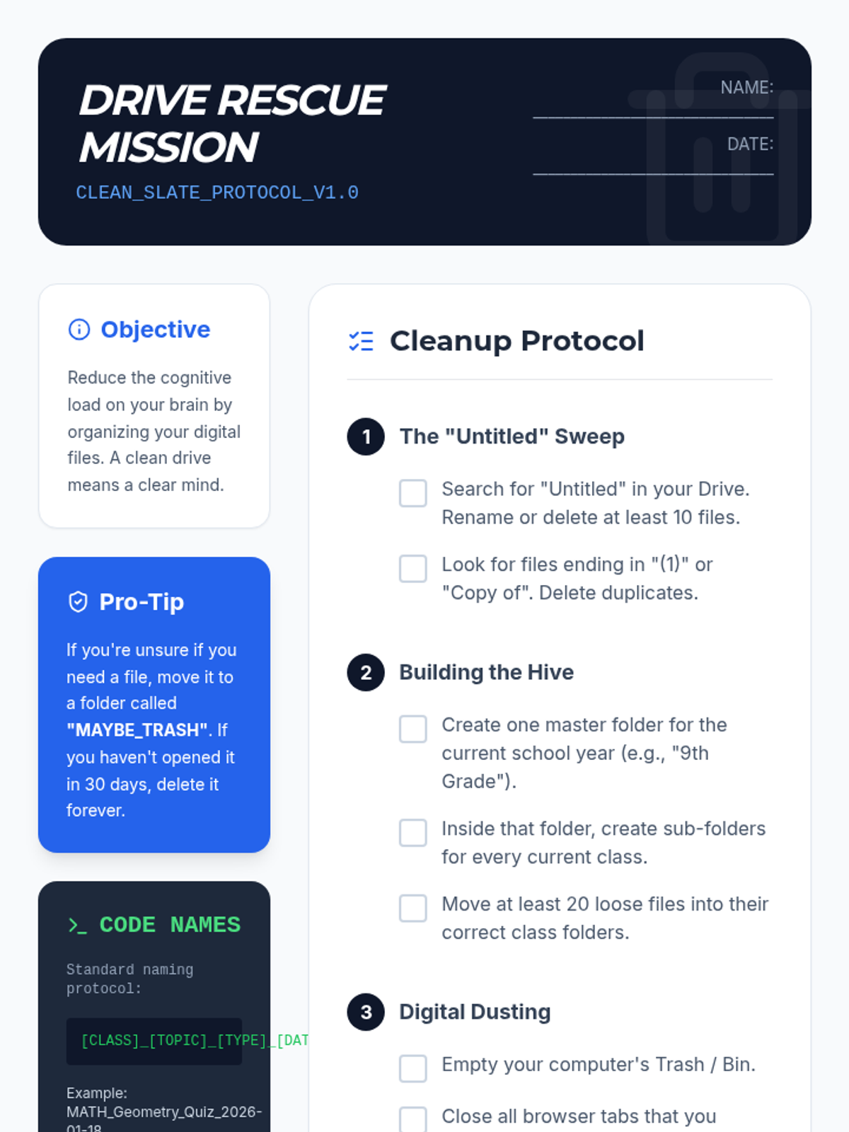 This sequence guides 8th-grade students through the engineering of their physical and digital environments to support executive function. Students move from understanding the neurological 'why' of organization to building a personalized operating manual for their own workflow optimization.