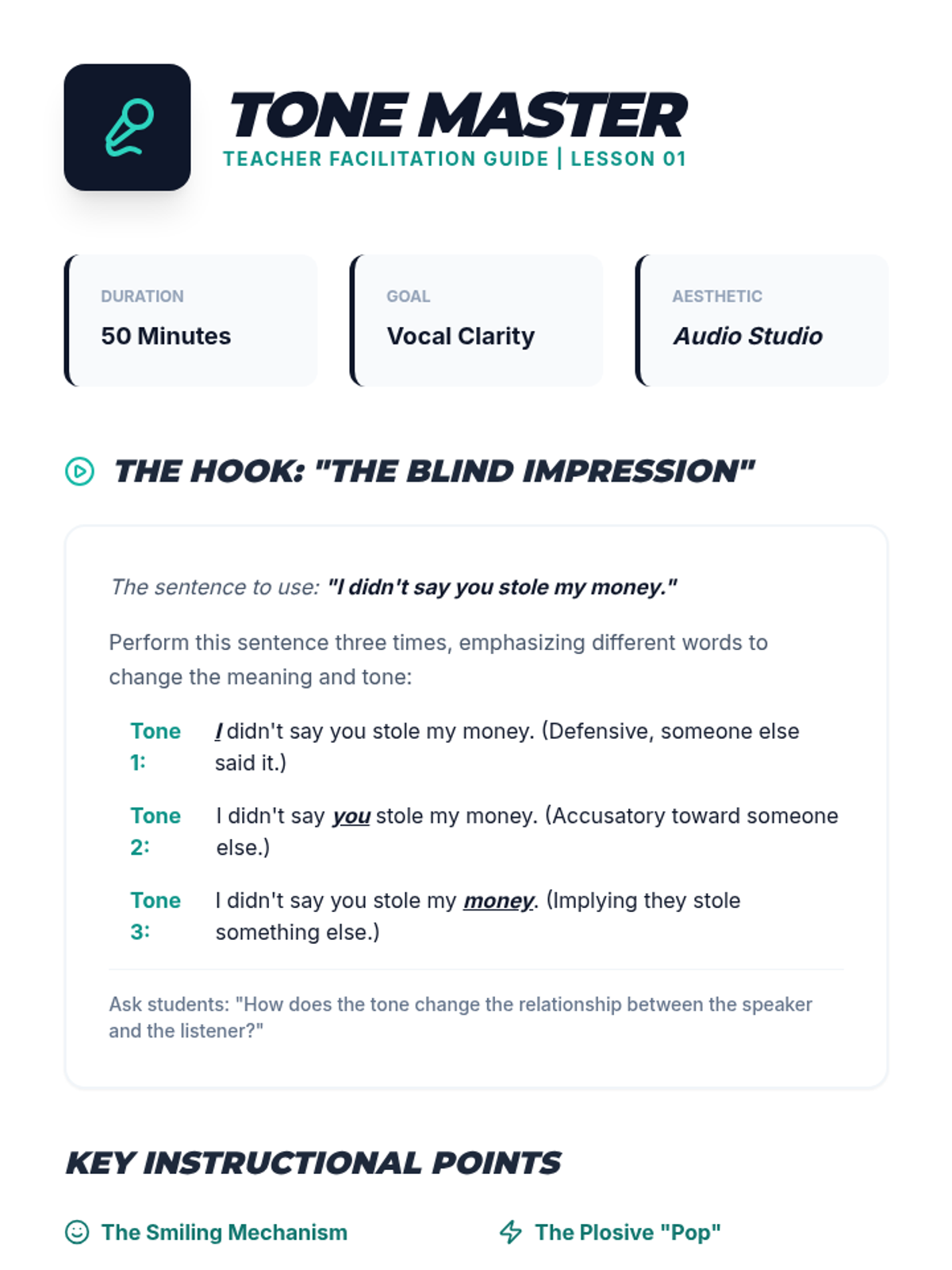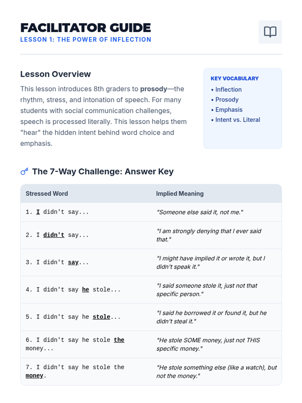 This sequence explores the nuances of social communication through tone, inflection, and sarcasm. Designed for 8th-grade social communication groups, it helps students decode the 'music' of speech to better understand social context and resolve conflicts.