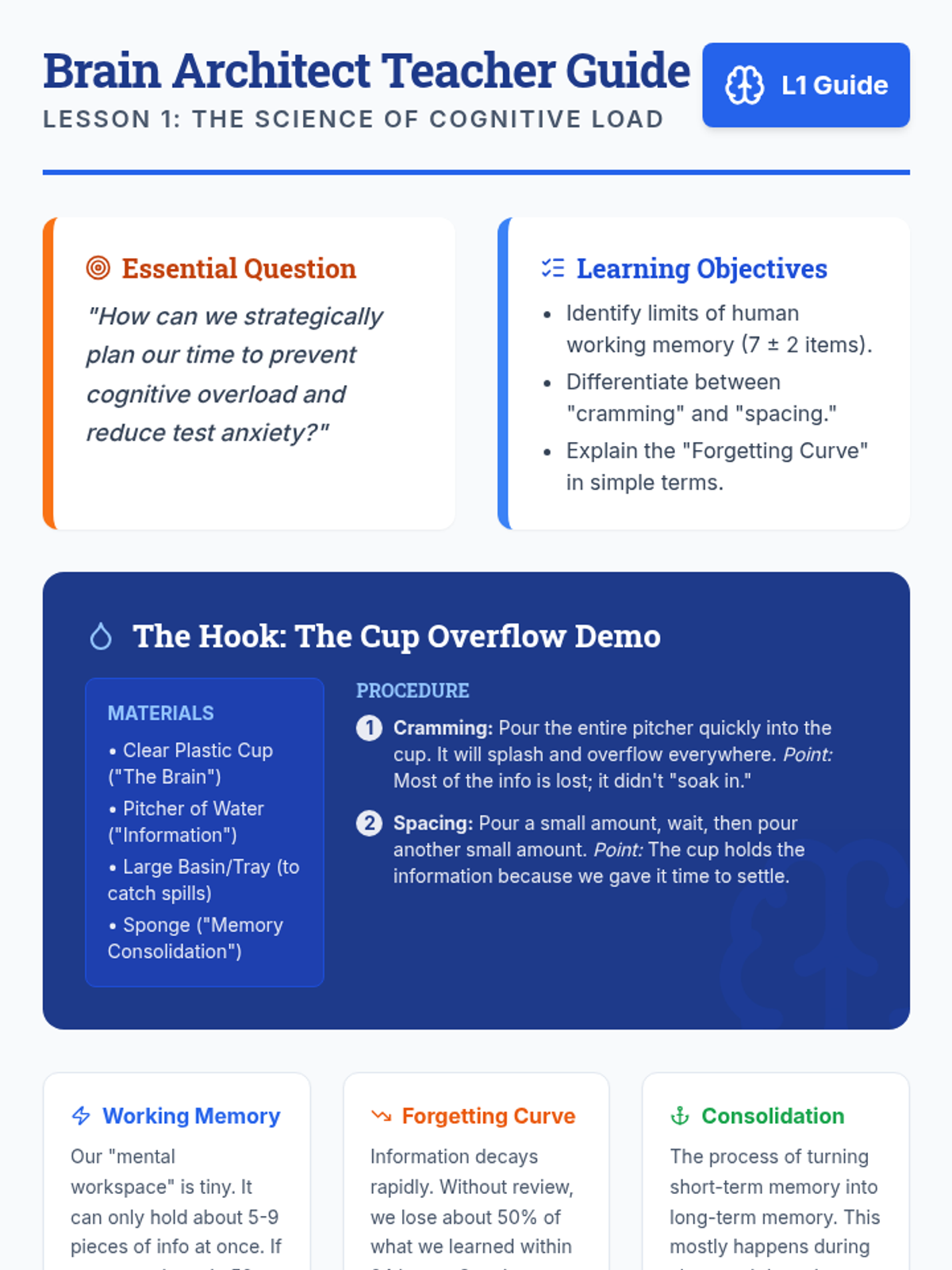A 5-lesson unit for 8th-grade students on spaced repetition, backwards planning, and metacognition to improve long-term memory and executive functioning.
