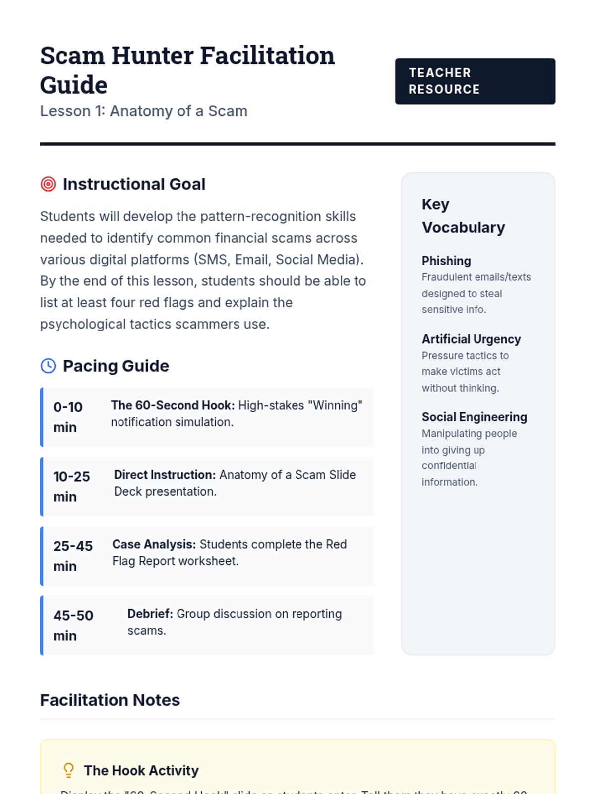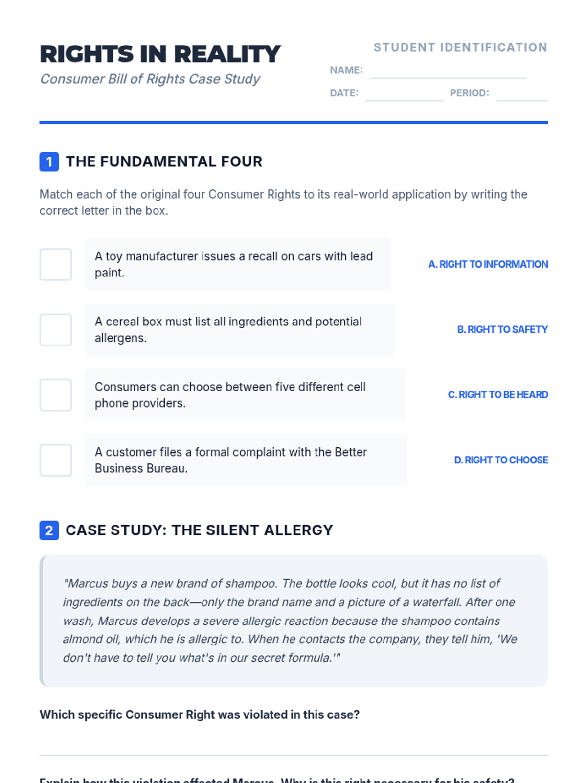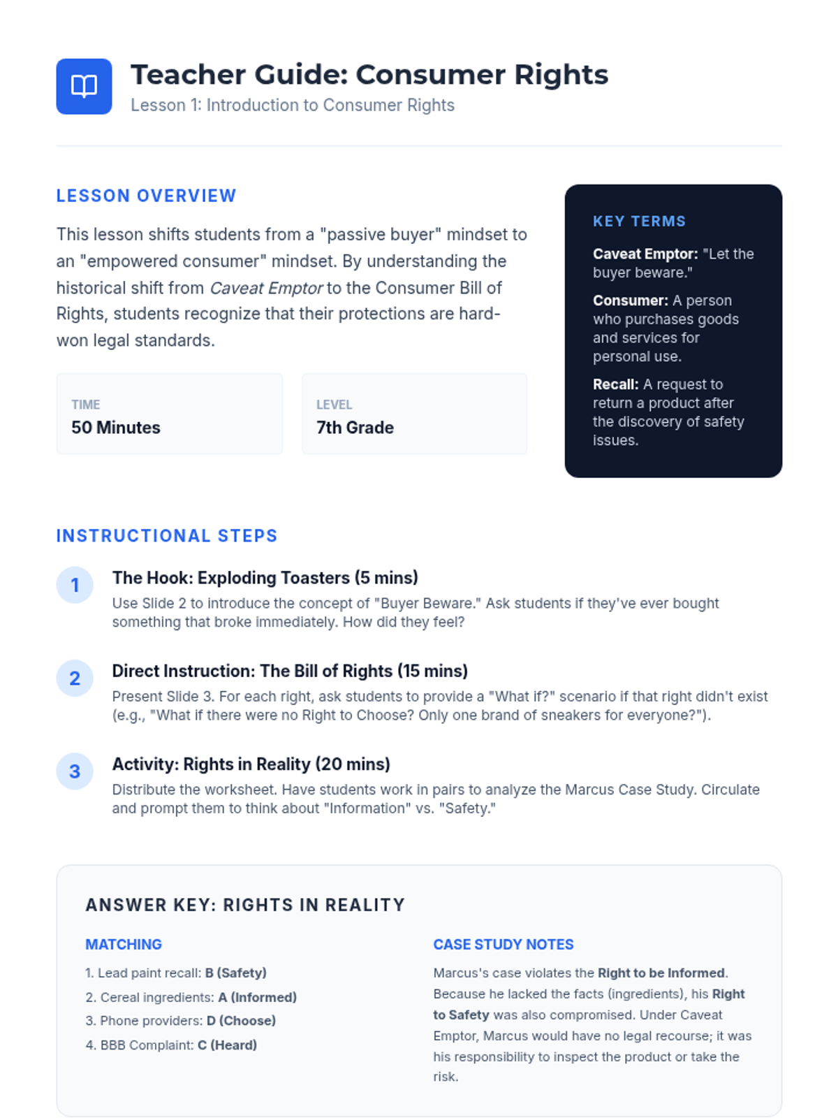 This case-study driven sequence focuses on consumer protection, equipping 8th-grade students with the knowledge to recognize scams and assert their legal rights. Students examine real-world examples of fraud, learn the specific functions of agencies like the FTC and BBB, and practice the soft skills required to resolve consumer disputes.