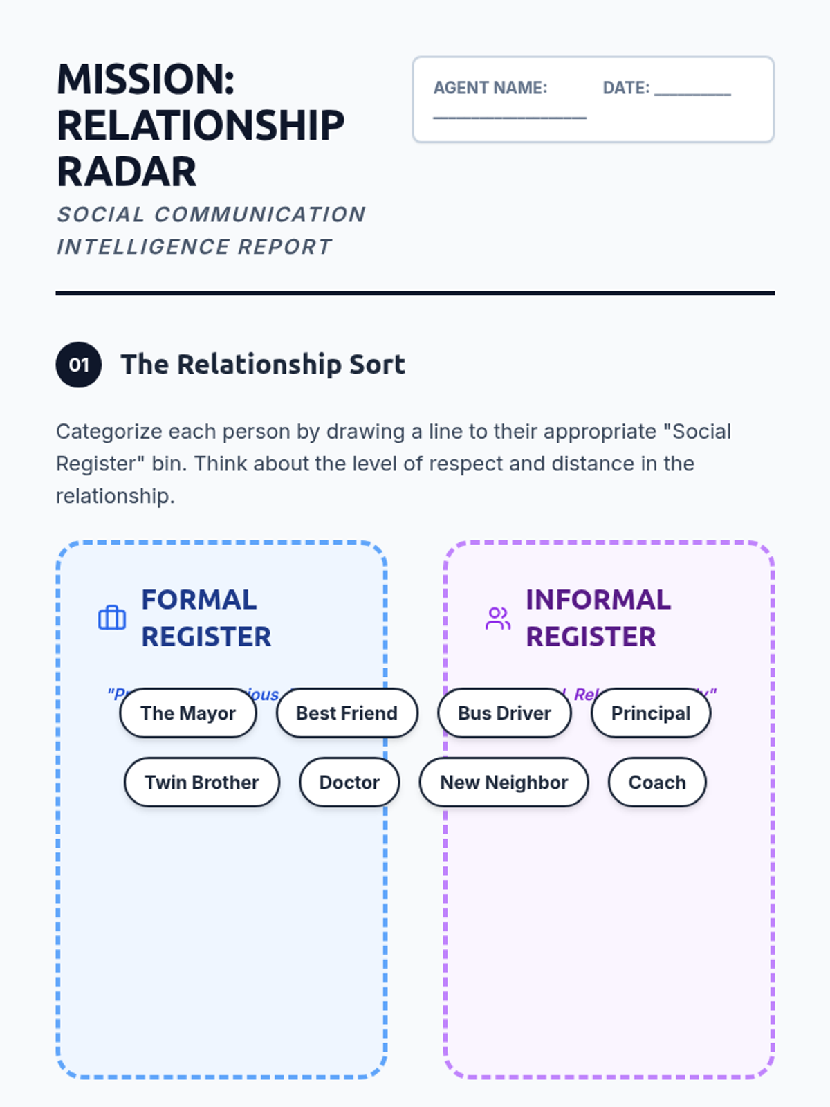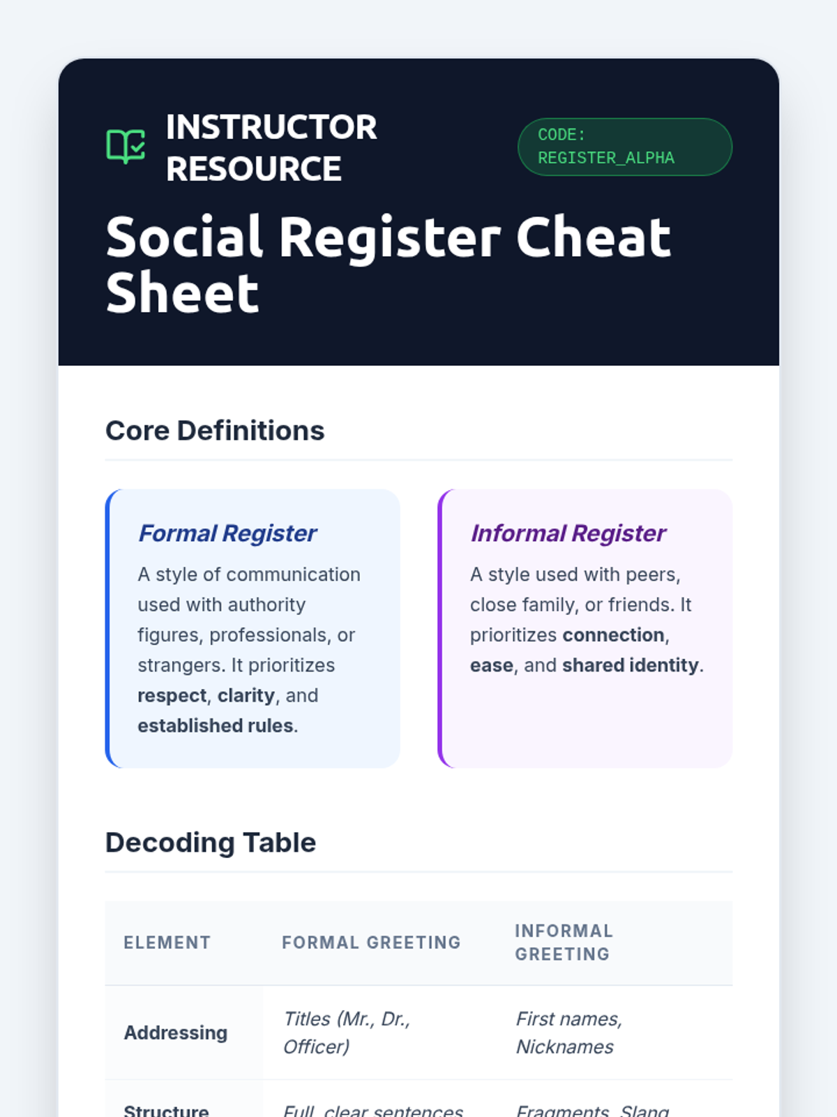 This sequence teaches 8th-grade students to differentiate between formal and informal social registers, identifying appropriate greeting styles for various audiences and practicing 'code-switching' in real-time.