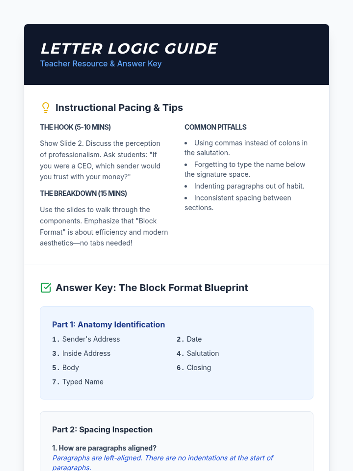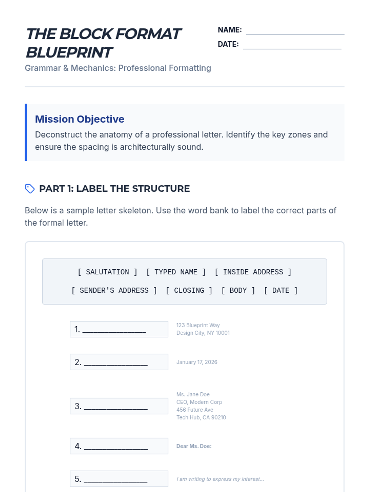 Students transition from academic writing to real-world professional communication by exploring document design and layout. The sequence covers business letters, formal emails, resumes, and the mechanics of visual hierarchy and indentation.