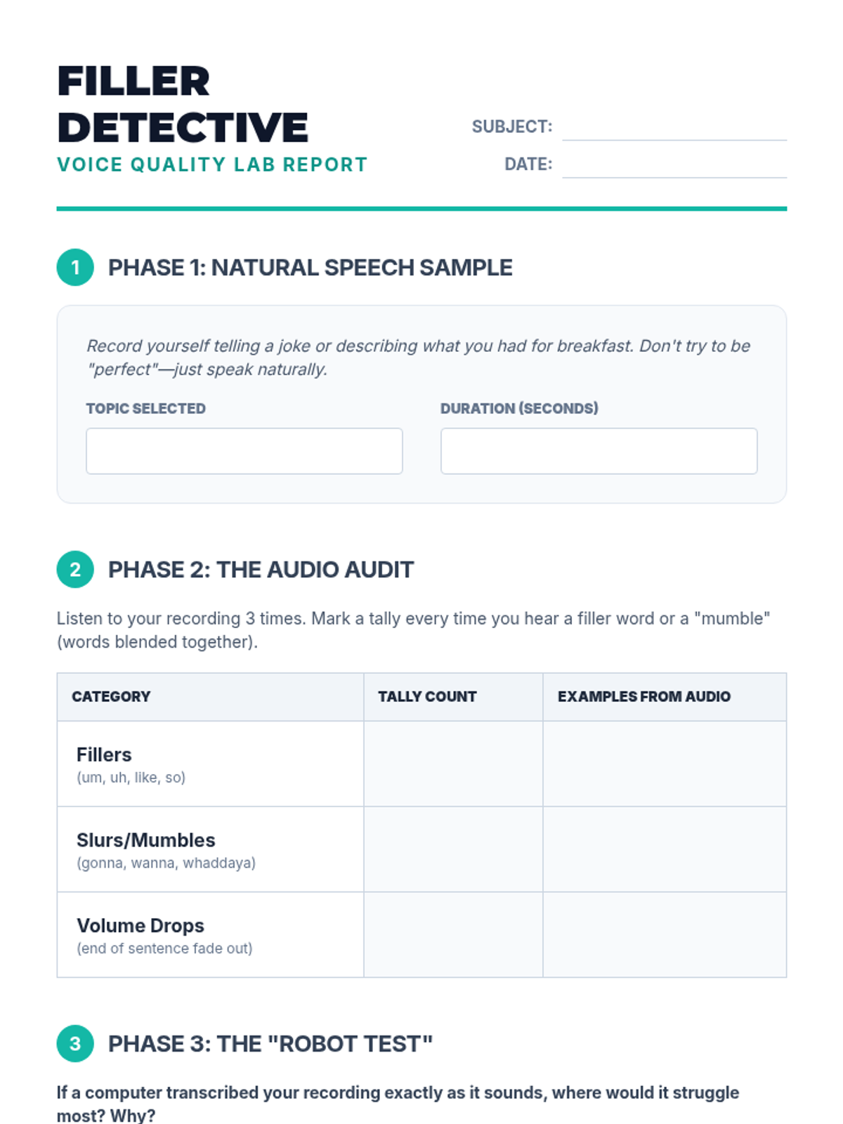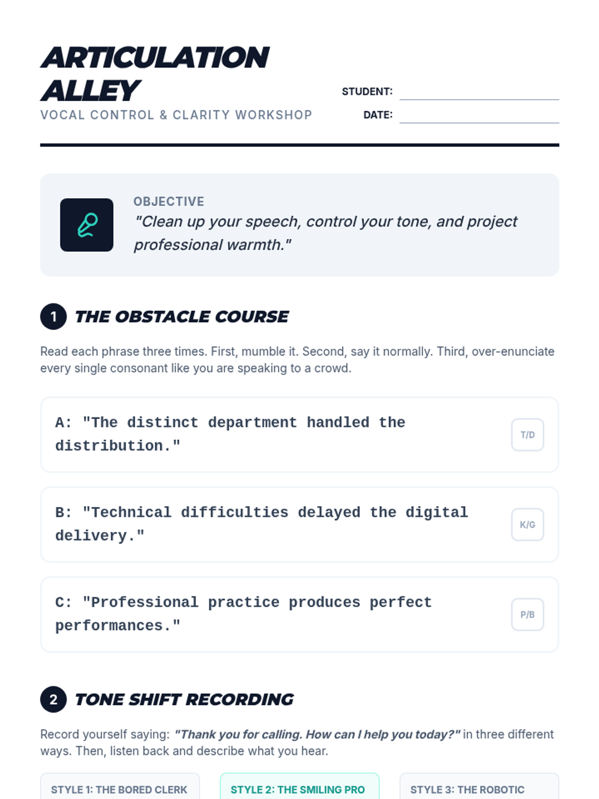 This sequence focuses on the auditory aspects of communication, specifically tone, pacing, and clarity, which are crucial when visual cues are absent. Students will record, analyze, and refine their speaking voices to convey competence and warmth, moving from self-diagnosis of speech habits to the production of polished voicemail recordings.