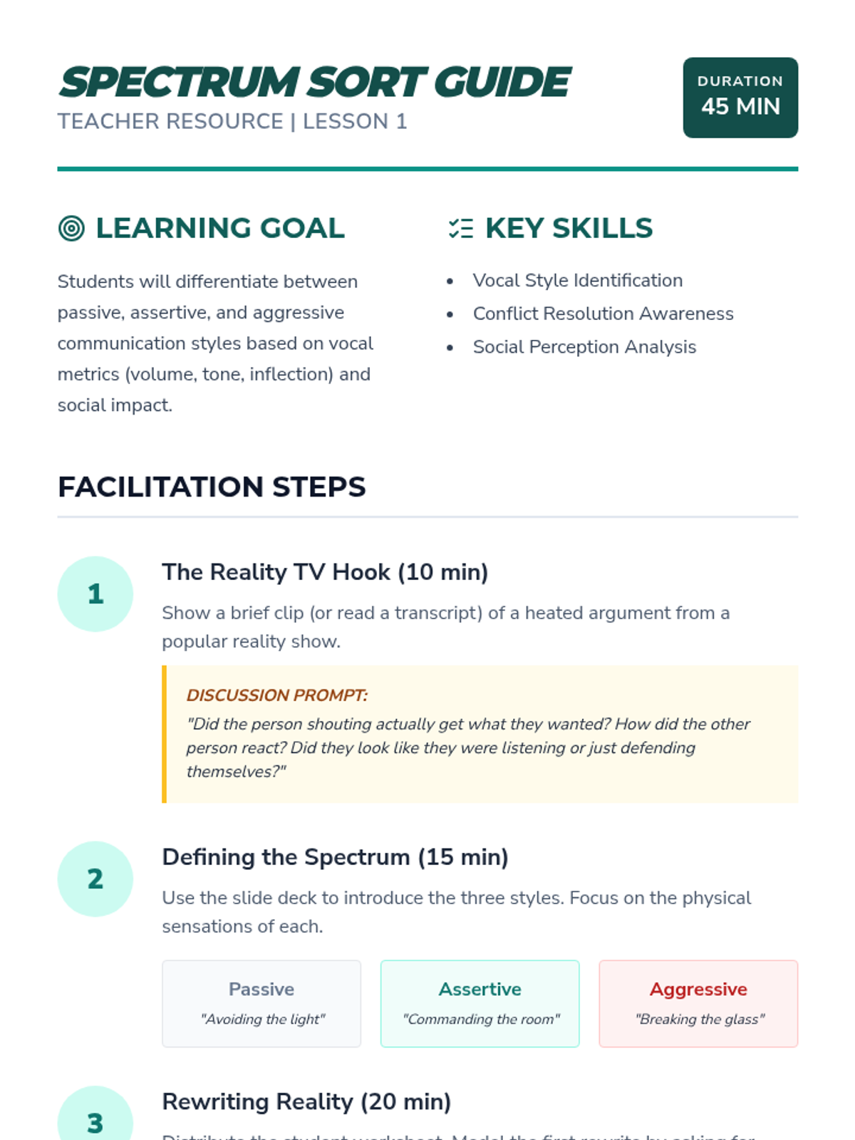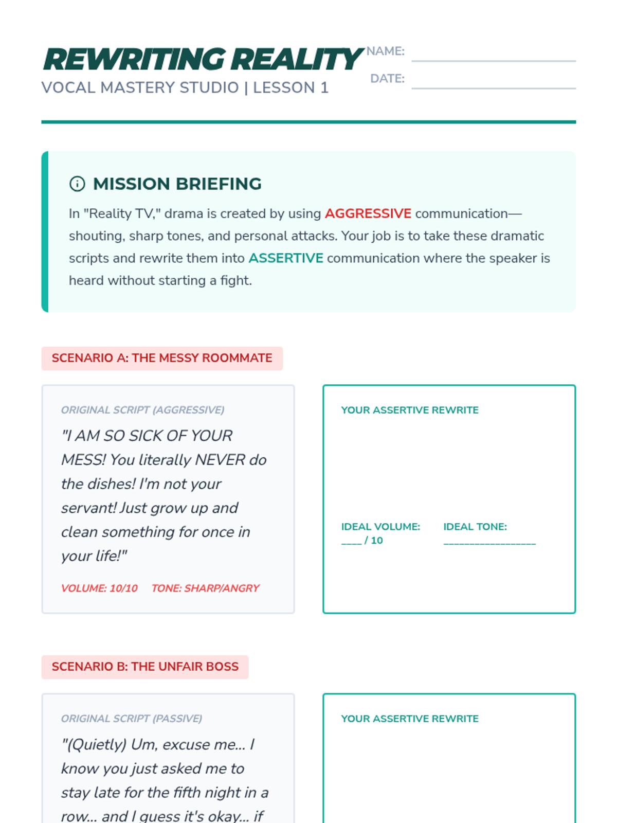 This sequence focuses on the distinction between aggressive shouting and assertive projection. Students learn to use their voice effectively for self-advocacy in various settings, from IEP meetings to public speaking, ensuring they are heard and respected.