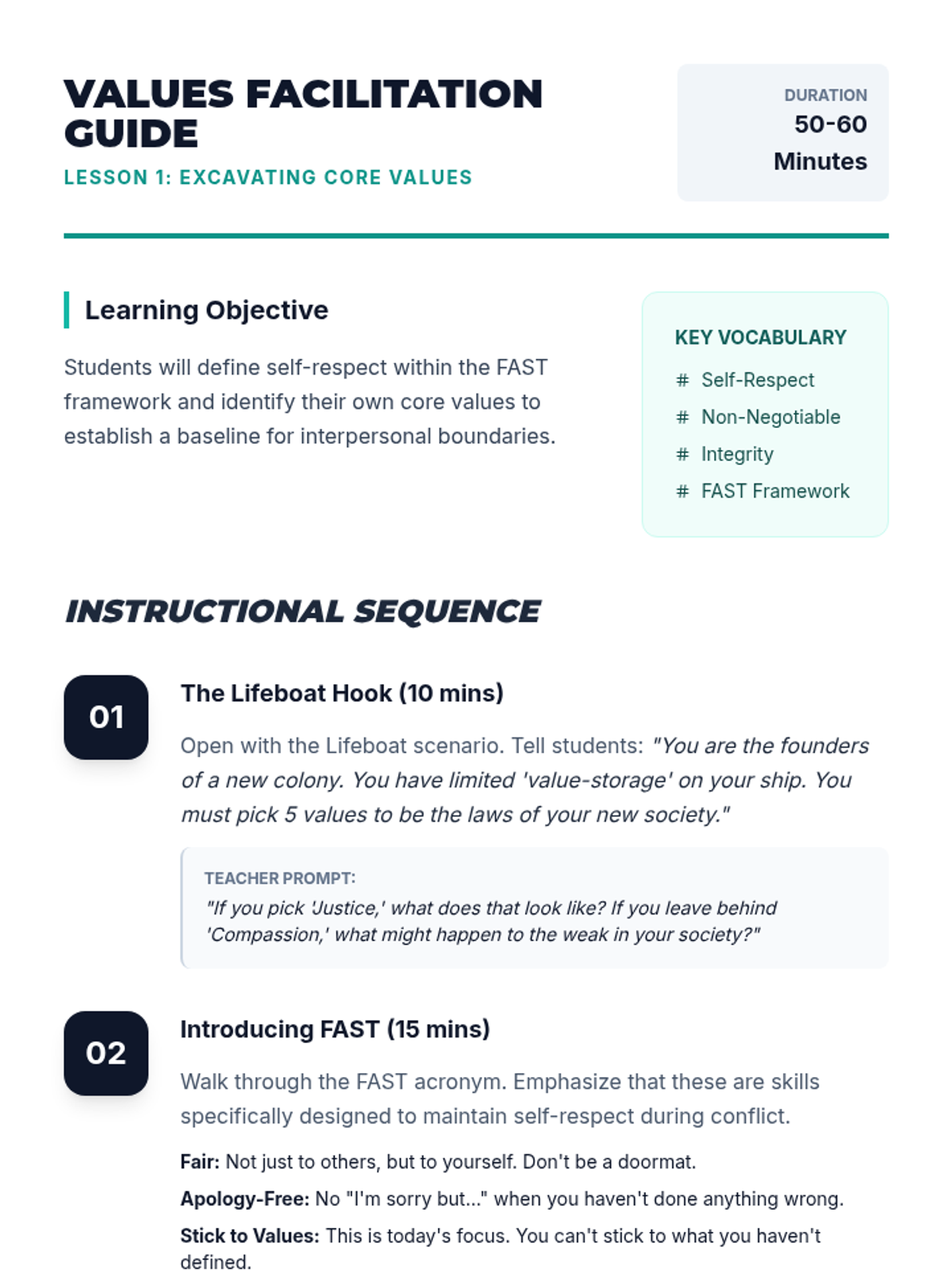 This inquiry and project-based sequence focuses deeply on the 'Stick to Values' aspect of FAST, positing that one cannot defend values they haven't defined. Students bridge abstract values with concrete communication skills, teaching them how to articulate their stances without judgment or apology.
